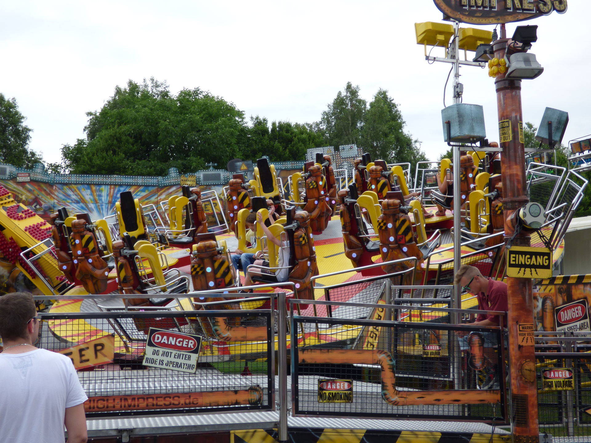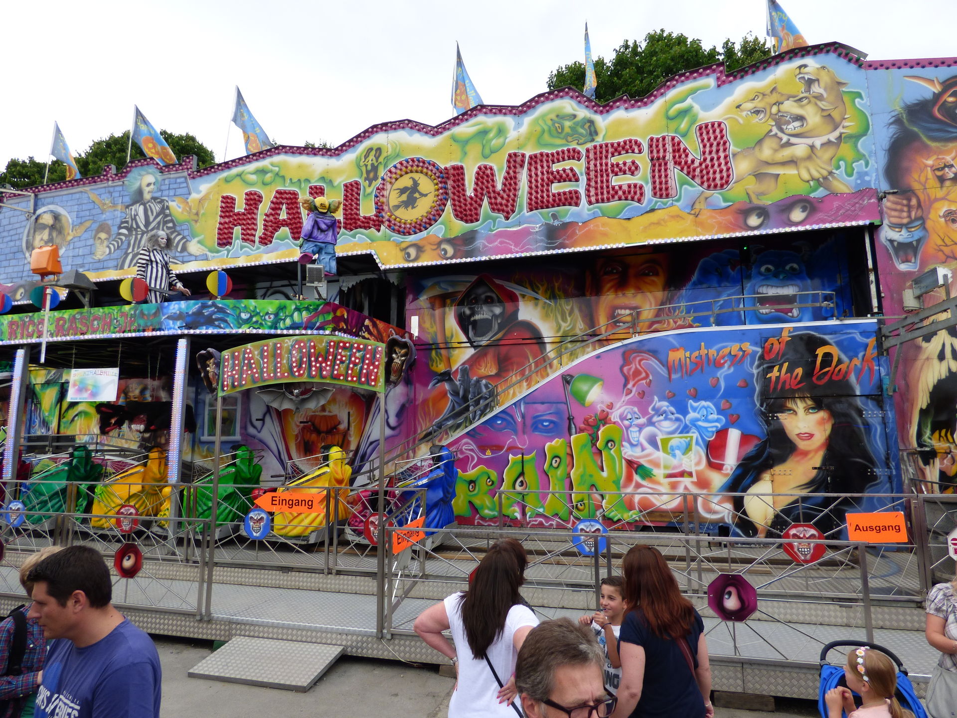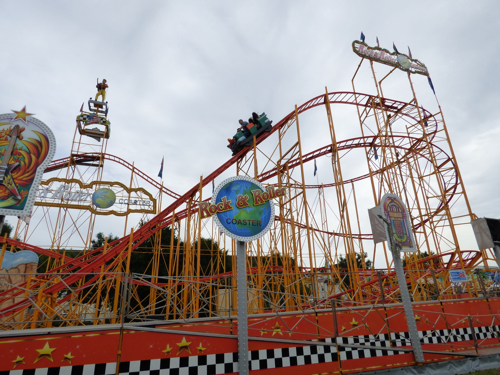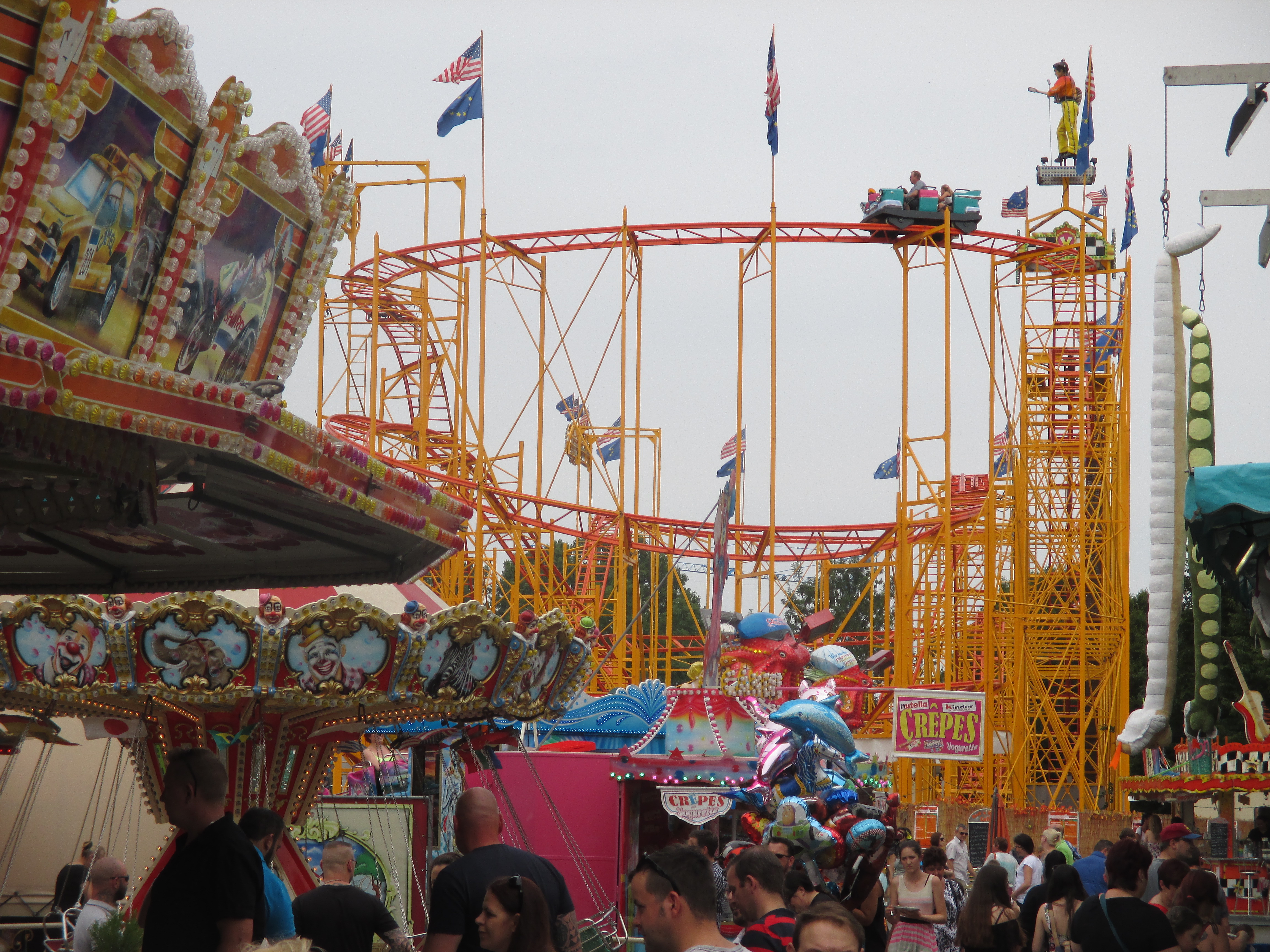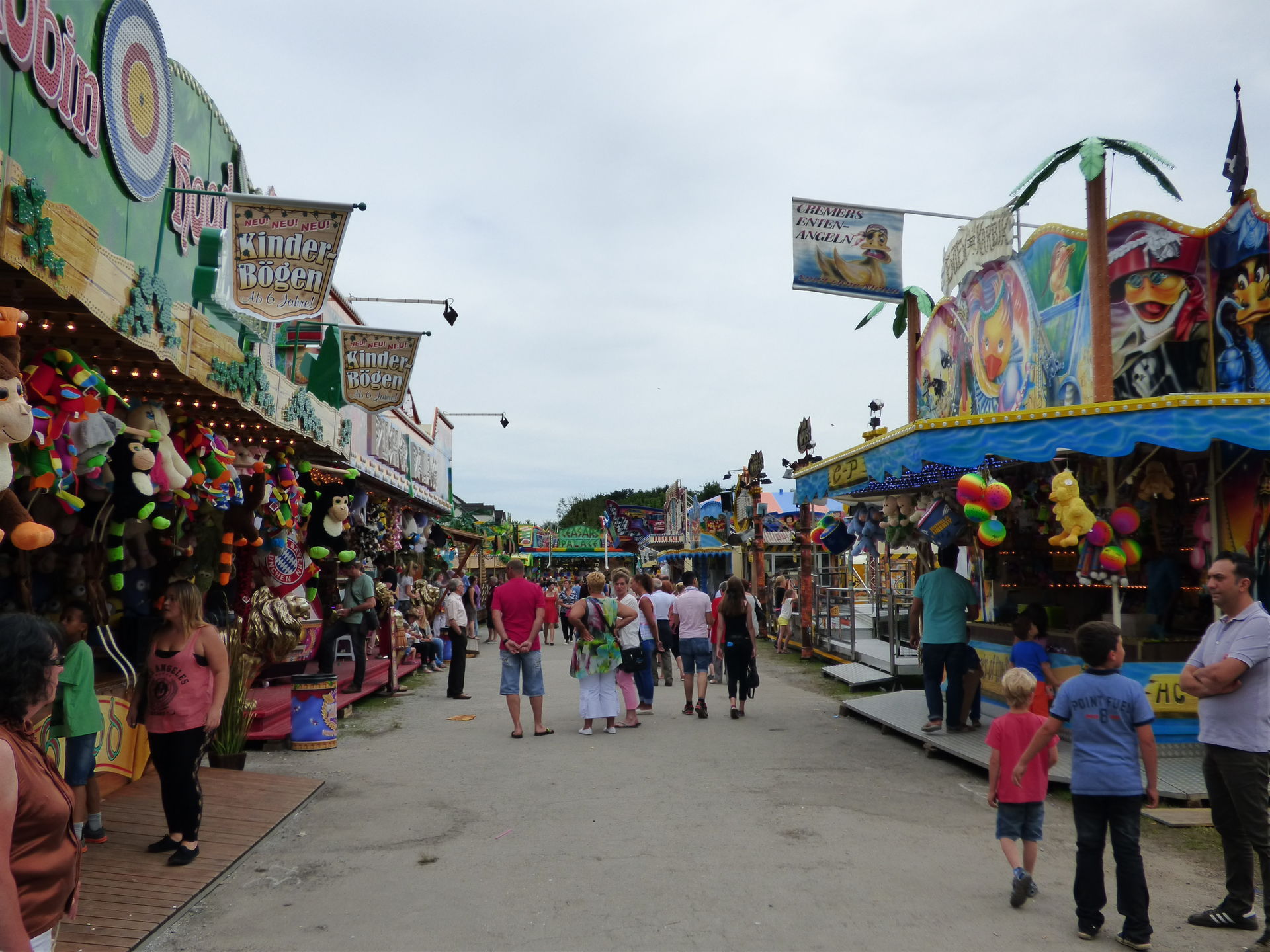 Der erste Eindruck im Vorbeifahren während der Parkplatzsuche war vielversprechend. Es waren Achterbahnschienen, Laufgeschäfte und wirbelnde Hochfahrgeschäfte zu erkennen. Scheint also ein recht gut bestückter Platz zu sein. Schnell den Wagen geparkt und dann konnte der erste Bummel über den Rummel an diesem Sonntag beginnen.