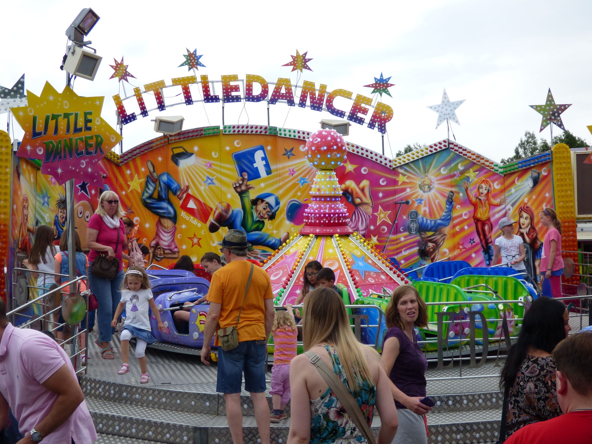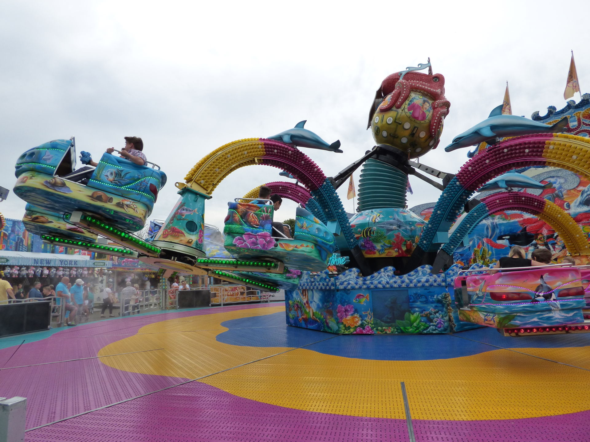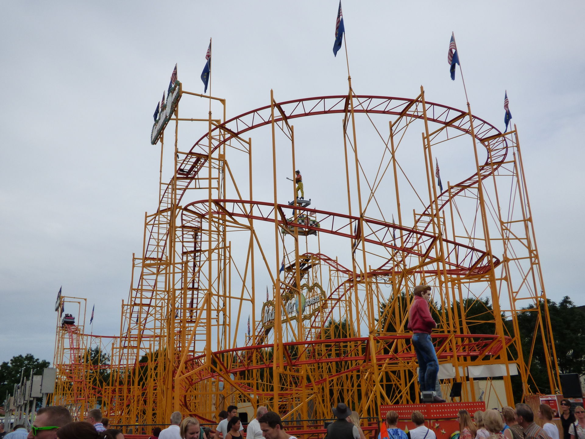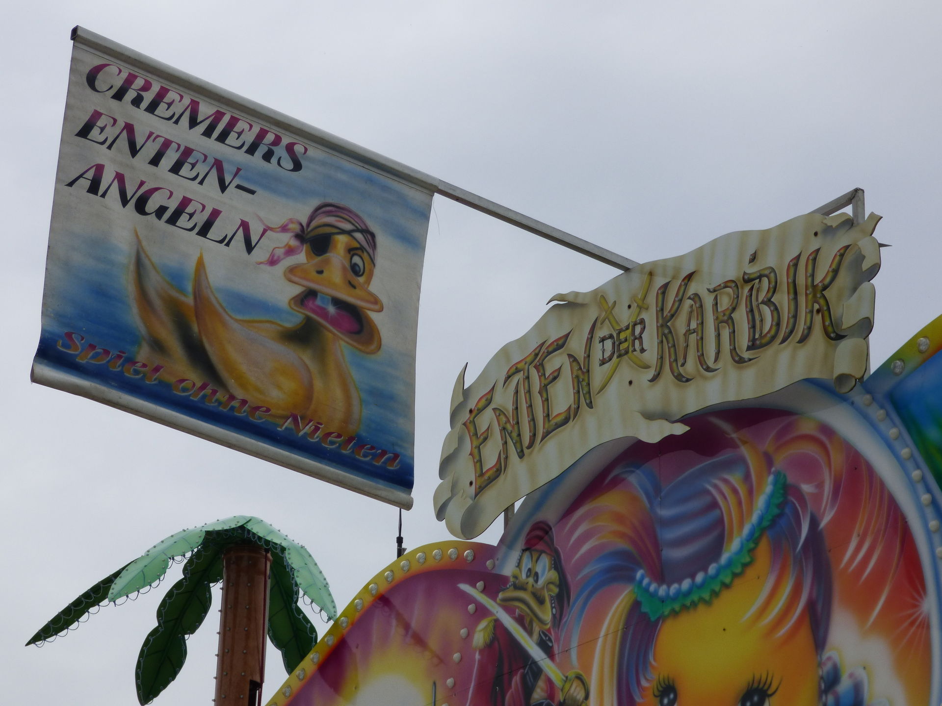 Der erste Eindruck im Vorbeifahren während der Parkplatzsuche war vielversprechend. Es waren Achterbahnschienen, Laufgeschäfte und wirbelnde Hochfahrgeschäfte zu erkennen. Scheint also ein recht gut bestückter Platz zu sein. Schnell den Wagen geparkt und dann konnte der erste Bummel über den Rummel an diesem Sonntag beginnen.