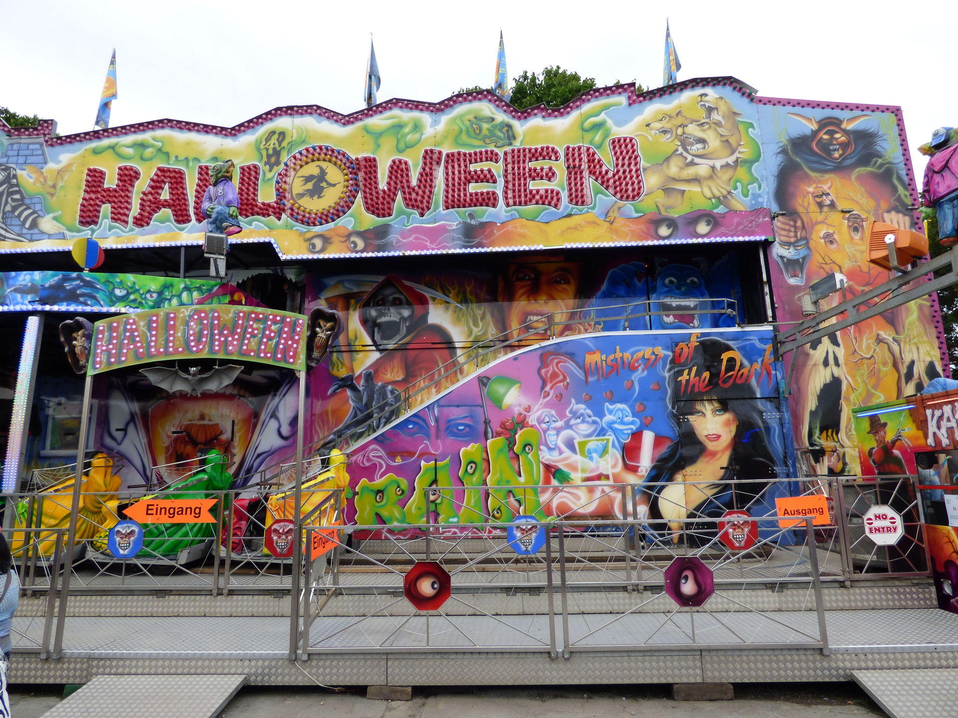 Als nächstes trafen wir auf die kompakte 2 Etagen Geisterbahn Halloween. Schon beim ersten Blick auf die Bahn stellte ich fest, dass irgendwas anders war, ich wusste nur irgendwie nicht was. Doch dann sah ich es. Der Außenbereich wurde modifiziert. In der zweiten Etage gibt es jetzt eine längere Balkonfahrt auf der die Live Akteure ihr Unwesen treiben. Dieser Ausbau ist definitiv eine Aufwertung der Bahn.