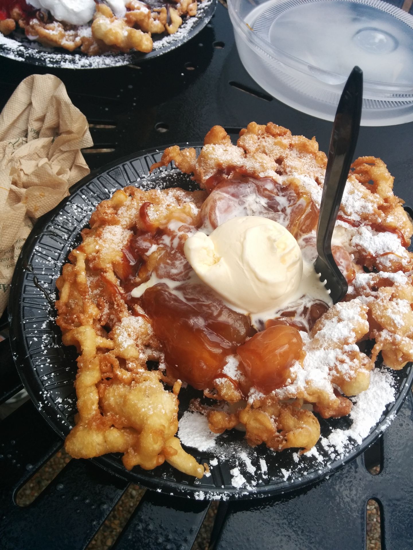Die wahrsscheinlich größte Kalorienbombe der gesamten Tour: Funnel-Cake mit glasierten Zimt/Zucker-Äpfeln, Karamellsoße und Vanille-Eis. Auf extra Sahne habe ich dankend verzichtet Sehr süß und sehr lecker. Aber schweinegeil!