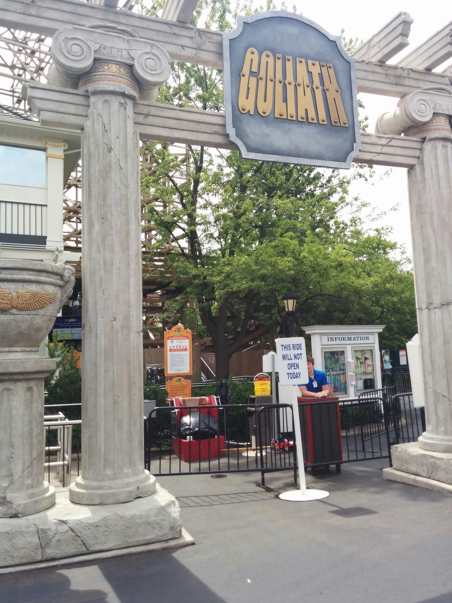 Laut Aussage des Mitarbeiters am Schild wären 8-Tägige Wartungsarbeiten im Gange. Und - wie hätte es anders sein können - sei es genau an unserem Besuchstag der 8. Tag. Bumm. Aber er ging davon aus, dass es noch länger dauern würde. Im Laufe des Tages hat man auch Arbeiten am oberen Ende vom Lift gesehen. Jedenfalls war Goliath laut Six-Flags Homepage noch mehrere Tage danach down. Somit blieb es bei einem neuen Count für uns.