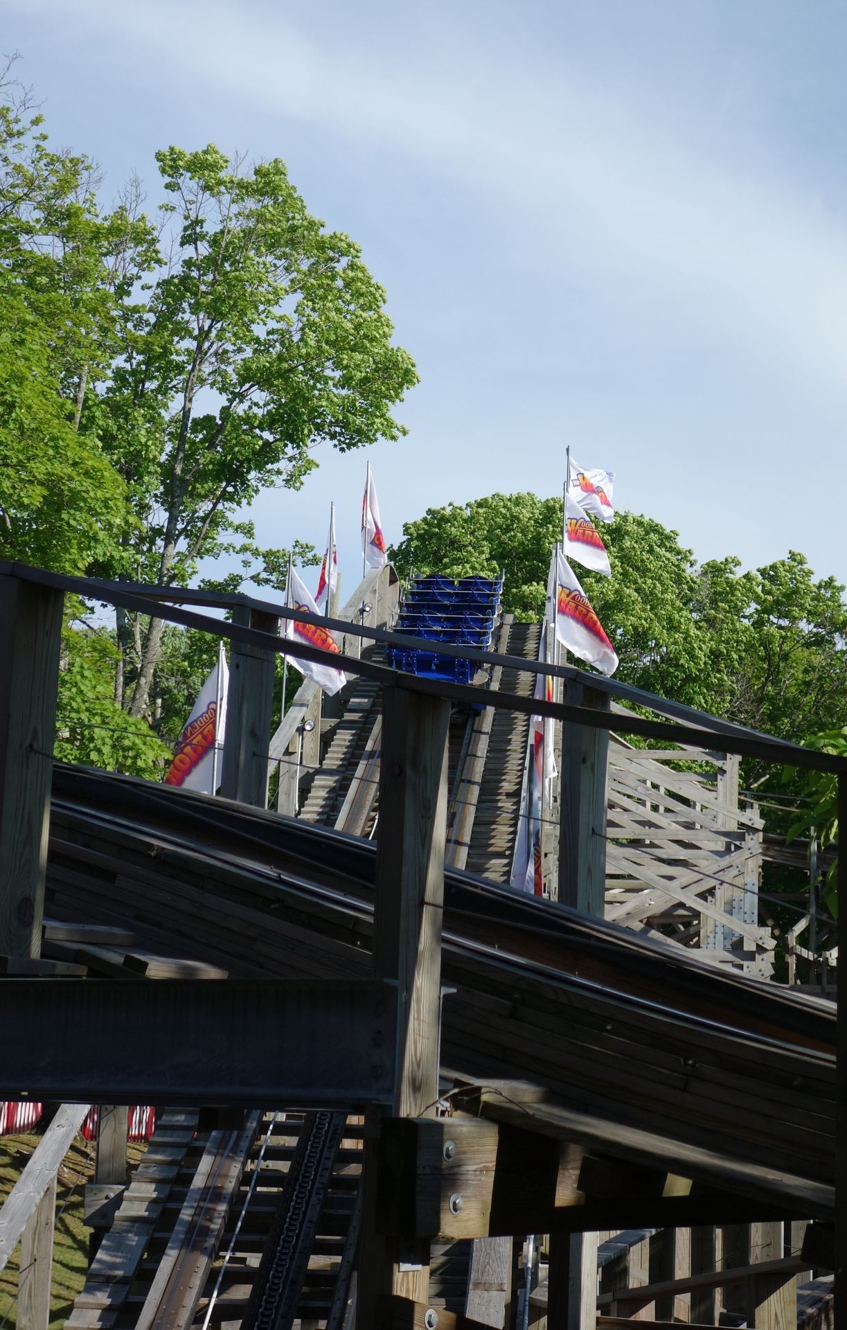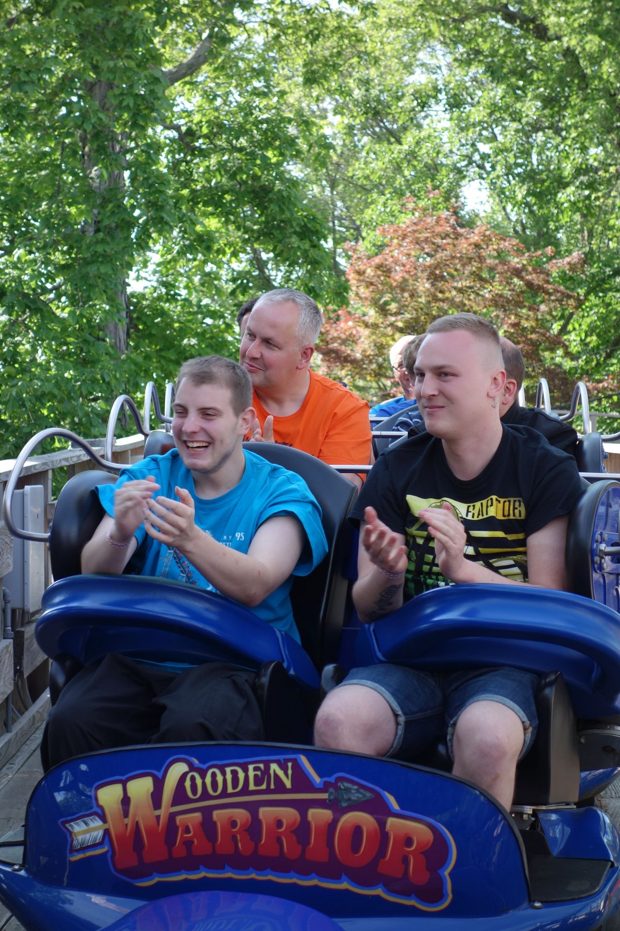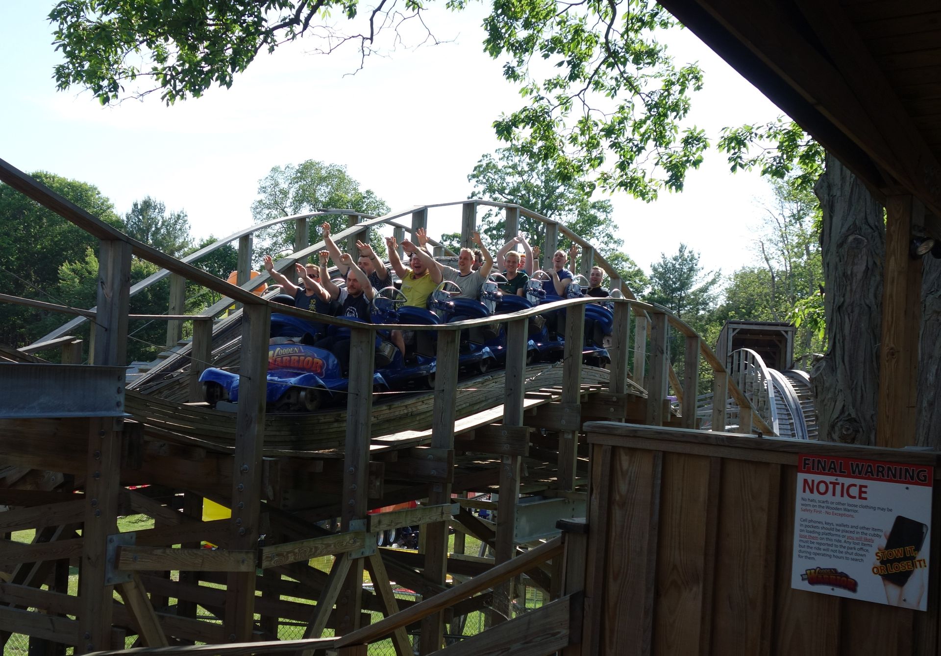 Auf dem Weg zurück Richtung Bus konnten wir am Wooden Warrior aber auch nicht einfach so vorbei laufen. Da nahmen wir auch eine kurze Wartezeit in Kauf. Immerhin war dies mit Abstand die beste Achterbahn an diesem Tag.