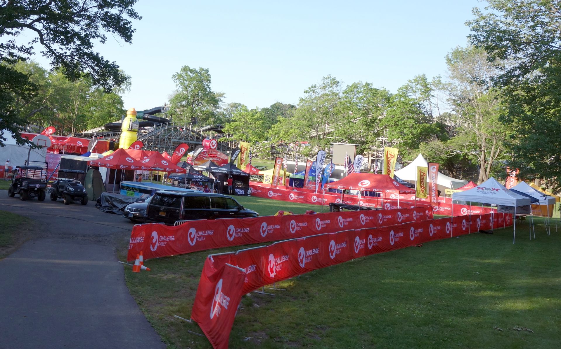 Hier machte sich auch schon jene Veranstaltung bemerkbar, wegen der das Playland überhaupt in die Tour aufgenommen wurde. Denn am Folgetag sollte in und um Quassy ein Triathlon stattfinden. Der Park wäre zwar ganz normal geöffnet gewesen, wie es aber mit der Anfahrt ausgesehen hätte, konnte Dirk nicht abschätzen. So rückte Quassy auf den ersten Tag vor und um den Tag auszufüllen war das Playland noch hinzugekommen. Die Vorbereitungen für den Triathlon waren auch schon weitestgehend abgeschlossen.