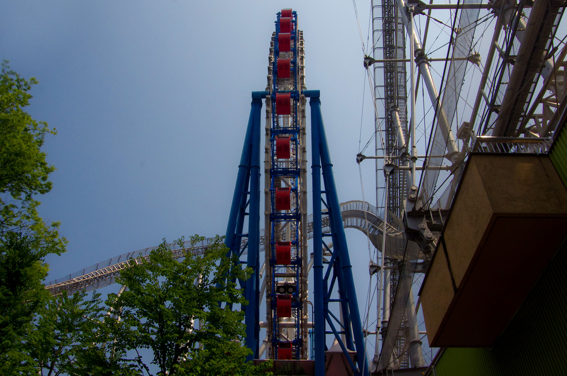 Camelback, aber ziemlich spießig gehalten. Eine relativ schwungvolle Wende durch das Riesenrad, wieder so ein Spießerback, und wieder auf das Hochhaus. Bis dorthin hat man inzwischen so viele Geschwindigkeit verloren, das man oben drauf die rechts-links-Kombination relativ gemütlich nimmt, bevor es nach dem letzten Drop direkt in die Bremsen geht.