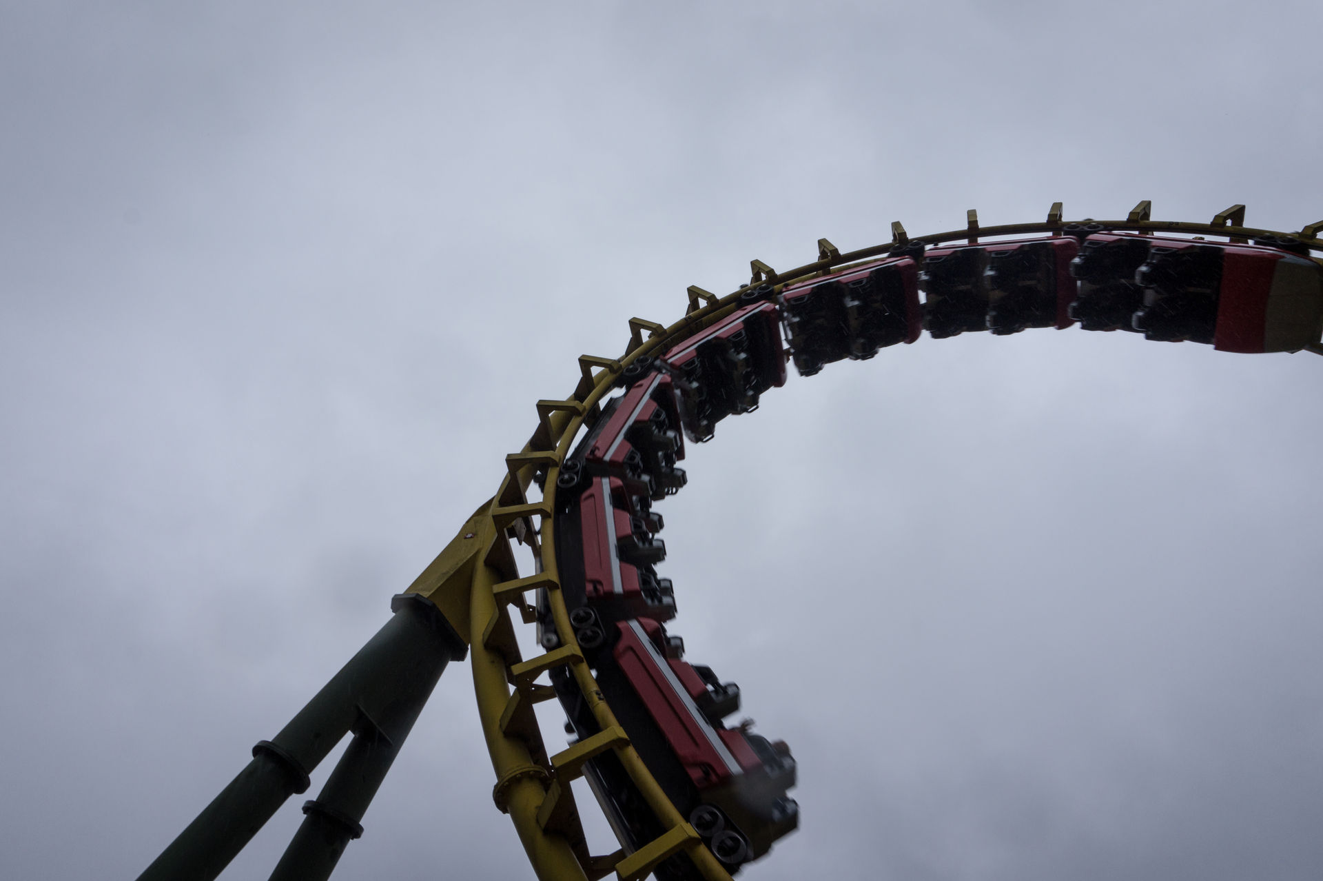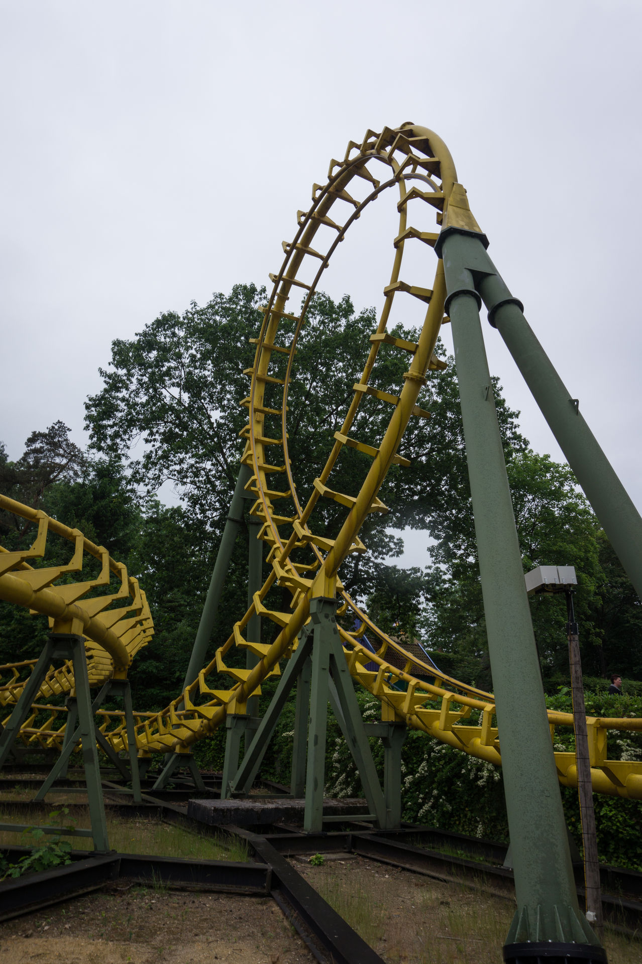 Korkenzieher ein zweites Mal über Kopf, woraufhin noch eine Kurve entlang des ersten Gefälles absolviert wird. Auf einer Diagonalen durch die Anlage findet der Bremsvorgang statt ehe es gemächlich in die Station geht. Eine zweite Runde blieb trotz minimalen Besucherandrang leider erspart.