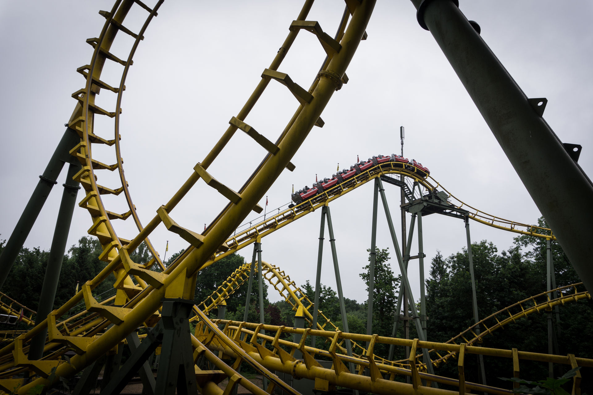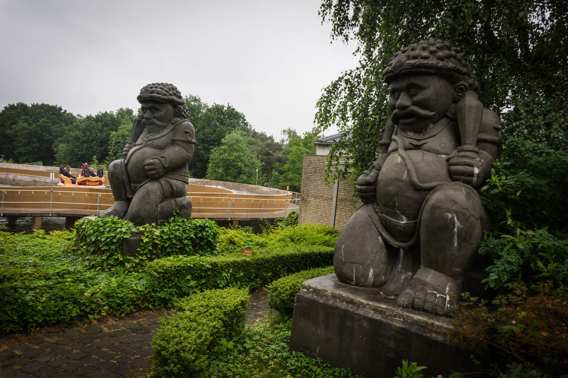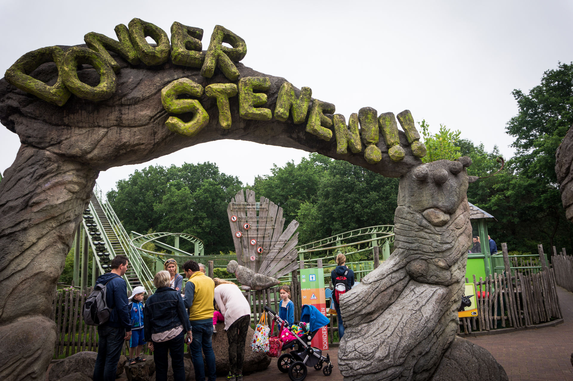 Nach dem Abstieg von der Station des Sungai Kalimantans, befindet man sich direkt vor den Donderstenen, einer Achterbahn vom Typ Force Two des Herstellers