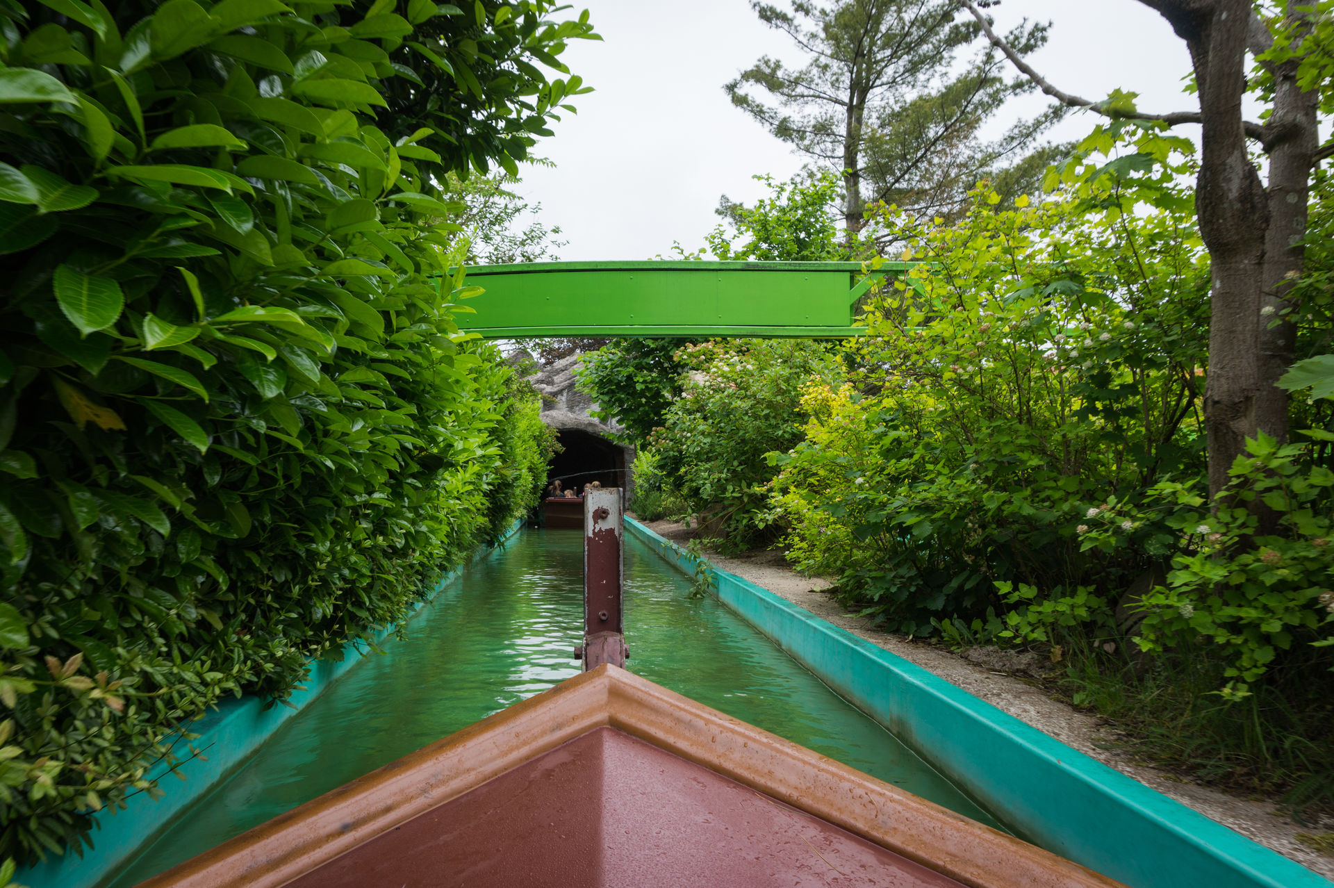 Lustiger weise ist nun bereits der halbe Freizeitpark erkundet, so dass es sogleich in die zweite Ecke des Parks ging. Entlang des Weges führt zu einem großen Teil die Strecke des Sungai Kalimantan, einem Rafting aus dem Hause Bear Rides mit einigen Besonderheiten. Die Warteschlange führt anfangs noch durch einen wunderbar gestalteten Bereich ehe es entlang der unansehnlichen aufgeständerten Betonrinne in Richtung der potthässlichen Doppelladestation geht.