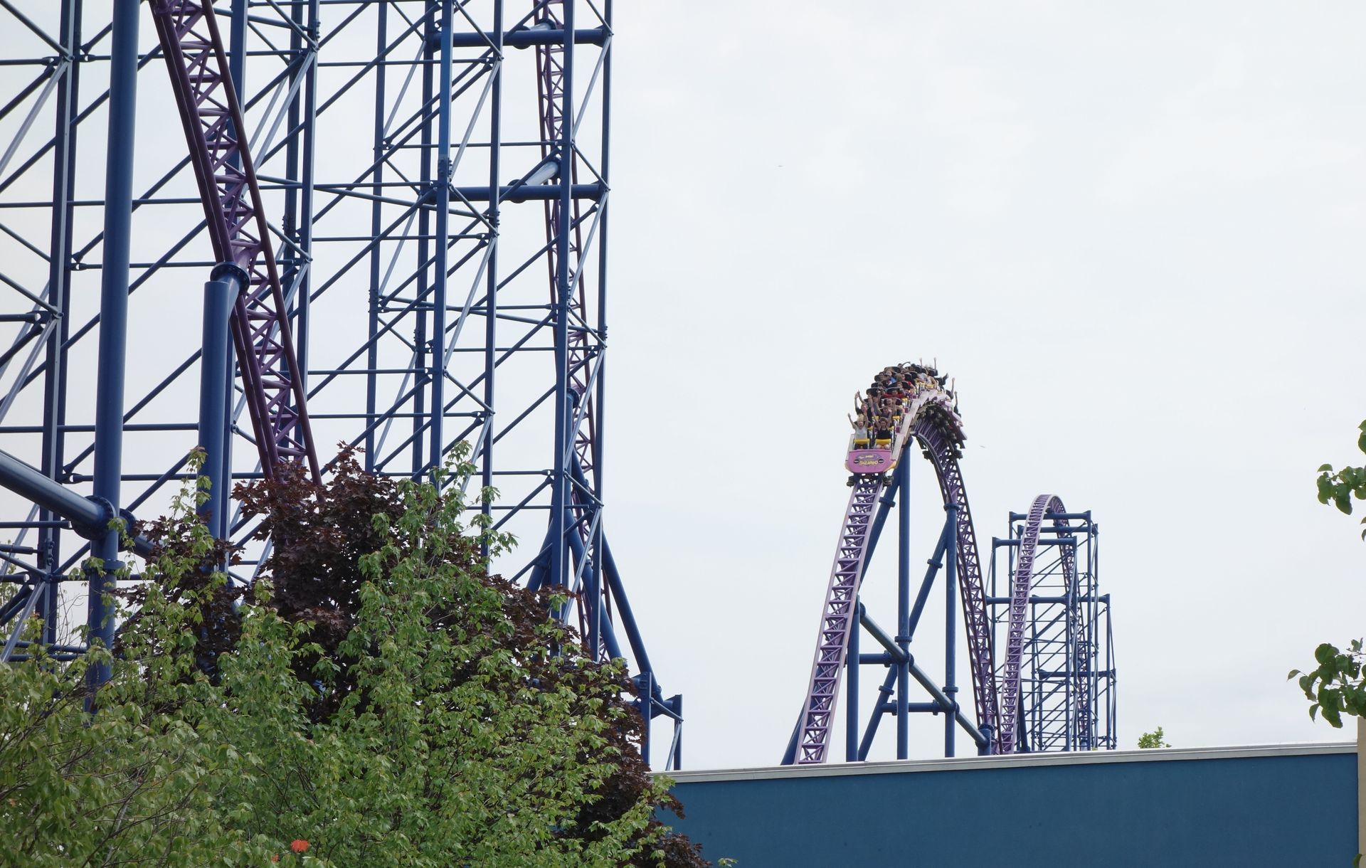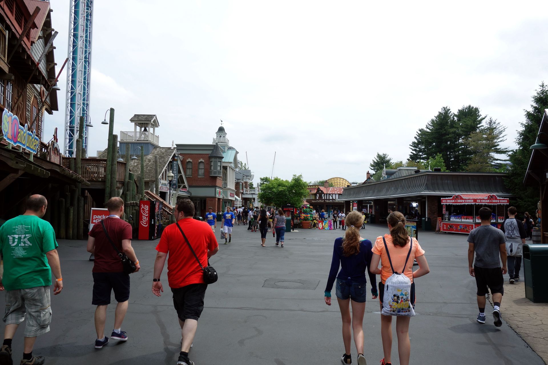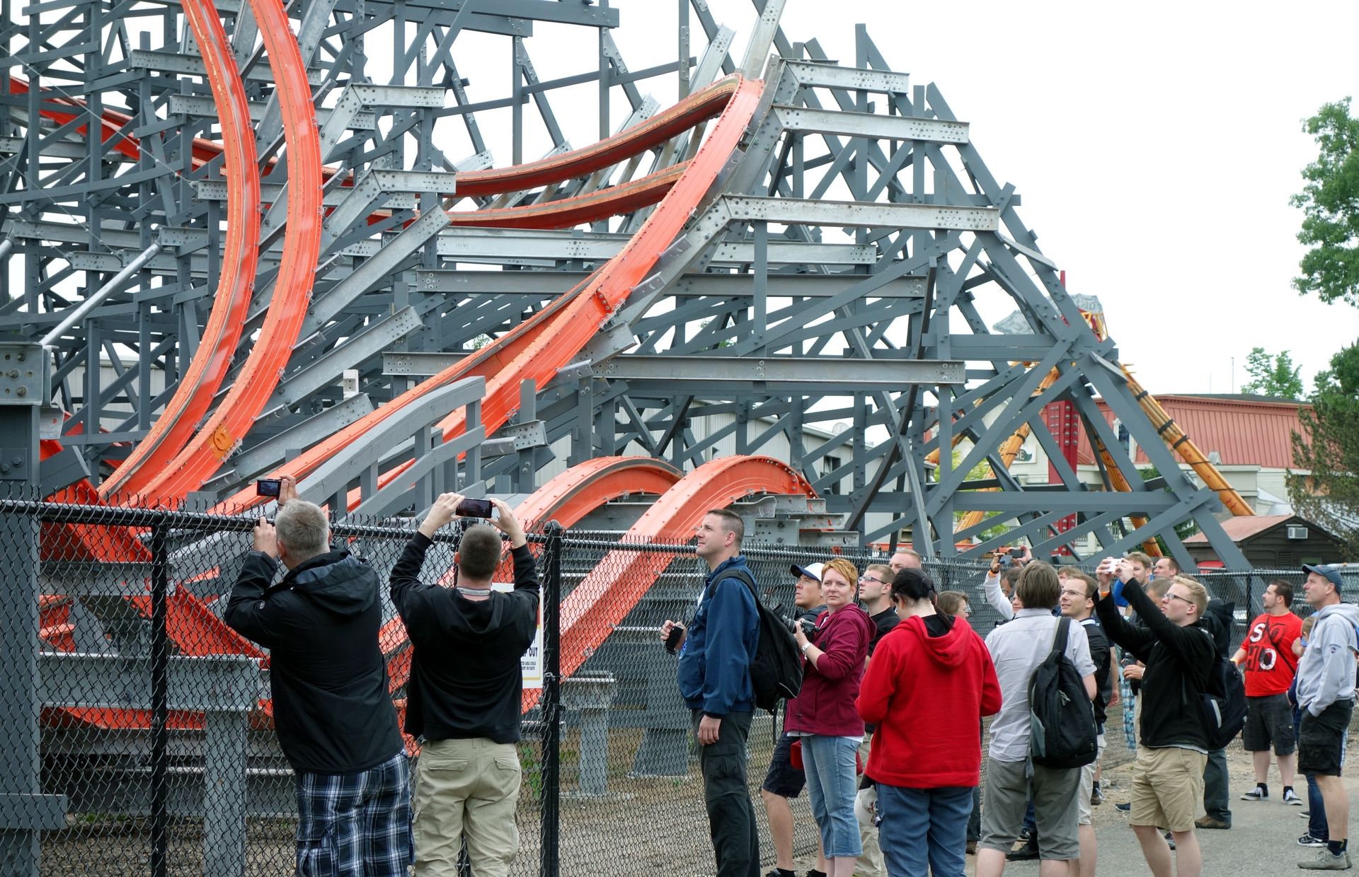 Nachdem sich die Gruppe also am Ausgang wieder zusammengefunden hatte, sollte es wieder zurück zum Eingangsbereich gehen. Denn da noch zwei weitere Parks der Gruppe folgen sollten, gab es für uns Season Pässe, die wir nun abholen sollten. Allerdings nahmen wir nicht den Weg durch die Besuchermassen, sondern wurden durch den eigentlich abgesperrten Bereich zwischen Wicked Cyclone und Straße geführt. Diese einmaligen Perspektiven mussten natürlich festgehalten werden. Und zwar von allen. Und am liebsten natürlich mit Zug. Entsprechend lange dauerte es, bis wir den relativ kurzen Weg hinter uns hatten.