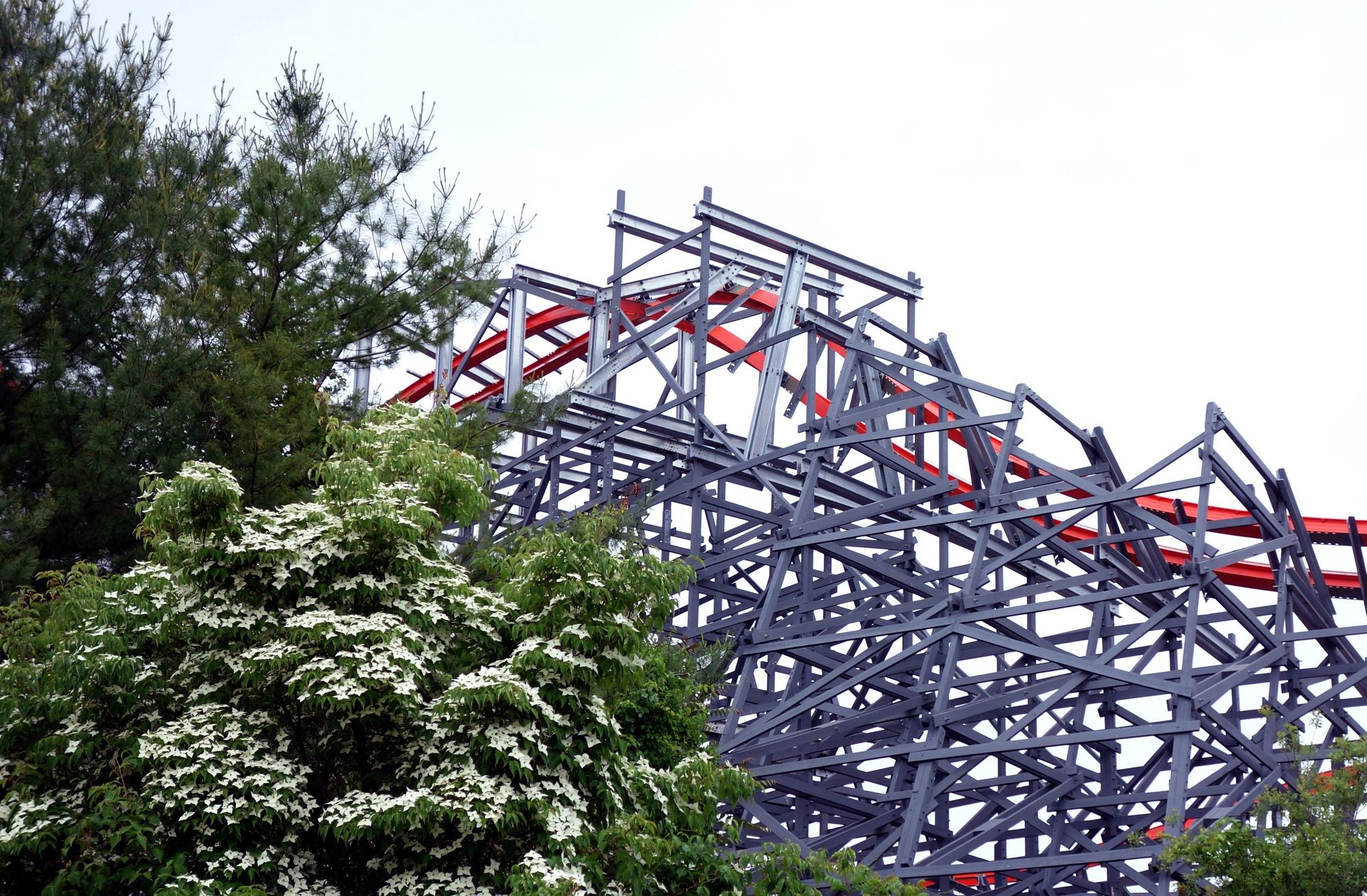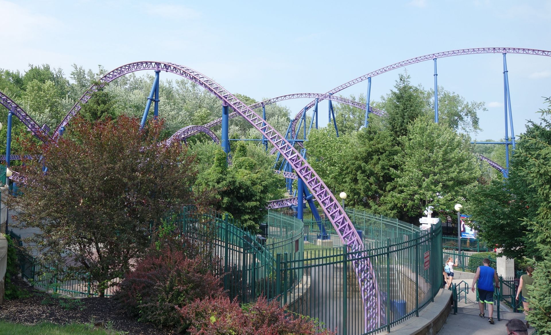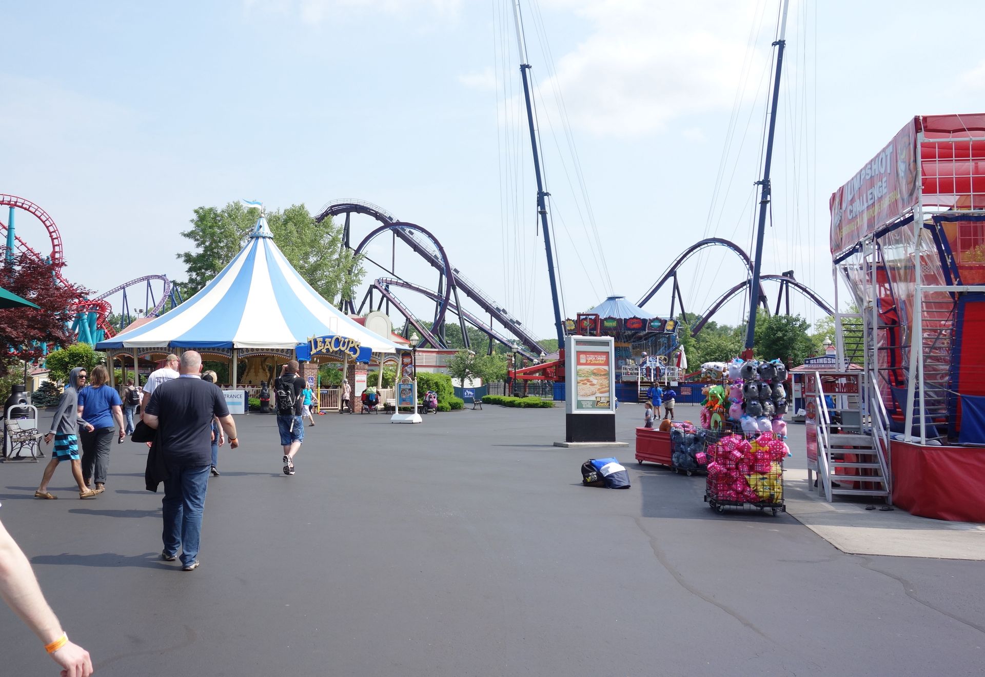 Nachdem sich die Gruppe also am Ausgang wieder zusammengefunden hatte, sollte es wieder zurück zum Eingangsbereich gehen. Denn da noch zwei weitere Parks der Gruppe folgen sollten, gab es für uns Season Pässe, die wir nun abholen sollten. Allerdings nahmen wir nicht den Weg durch die Besuchermassen, sondern wurden durch den eigentlich abgesperrten Bereich zwischen Wicked Cyclone und Straße geführt. Diese einmaligen Perspektiven mussten natürlich festgehalten werden. Und zwar von allen. Und am liebsten natürlich mit Zug. Entsprechend lange dauerte es, bis wir den relativ kurzen Weg hinter uns hatten.