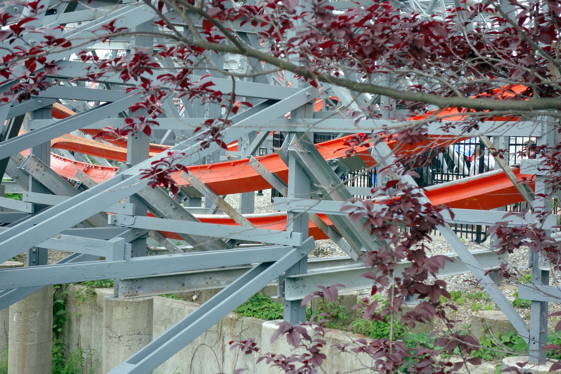 Vom Ausgang kann man Lifthill und First Drop von Bizarro besonders gut bewundern.