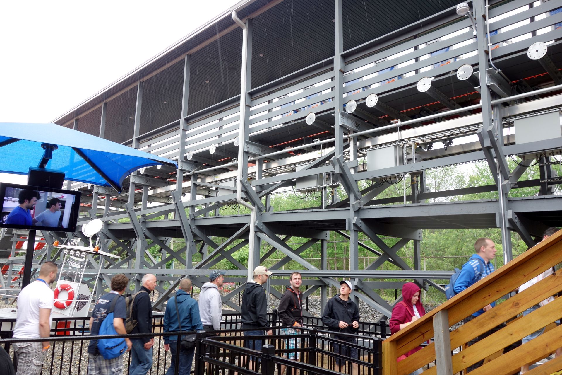 Während wir nun auf den Einlass warteten, begann es dann doch zu nieseln. Der Platz unter dem Dach wurde jedenfalls relativ schnell kuschelig. Aber schon nach wenigen Minuten hörte es wieder auf. Eine offizielle ERT hatten wir an diesem Tag leider nicht, aber man hatte uns die ersten Fahrten des Tages auf der Neuheit des Jahres versprochen. Als die Einlasstore endlich geöffnet wurden, strömten wir also schnellstmöglich durch die übliche Sicherheitskontrolle und wurden dann in den eigentlich noch abgesperrten Parkteil geführt.
