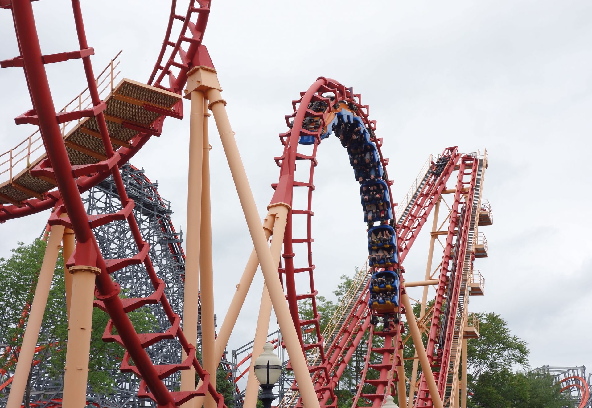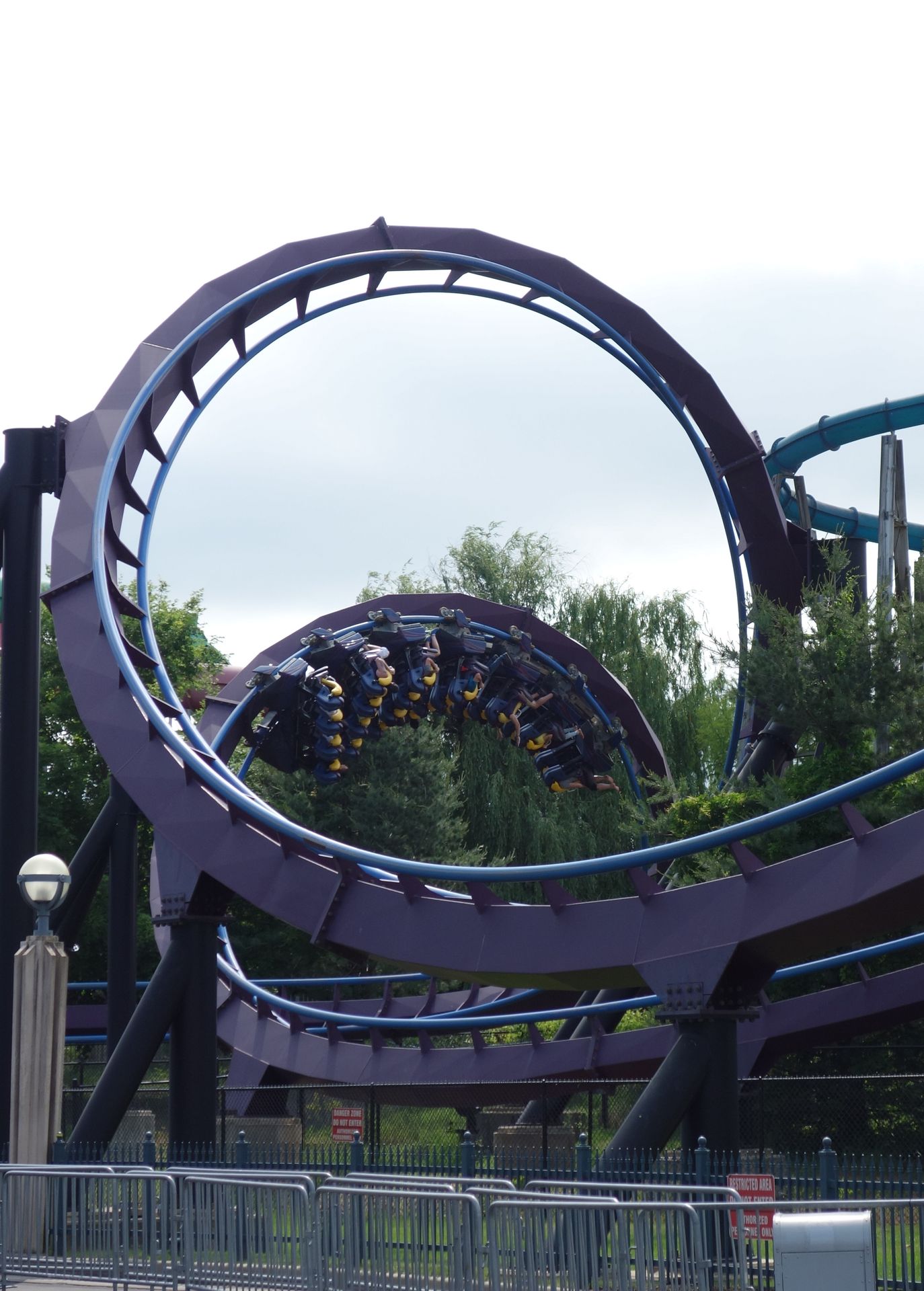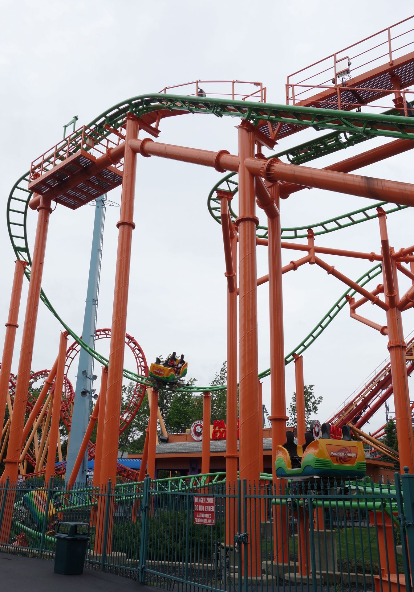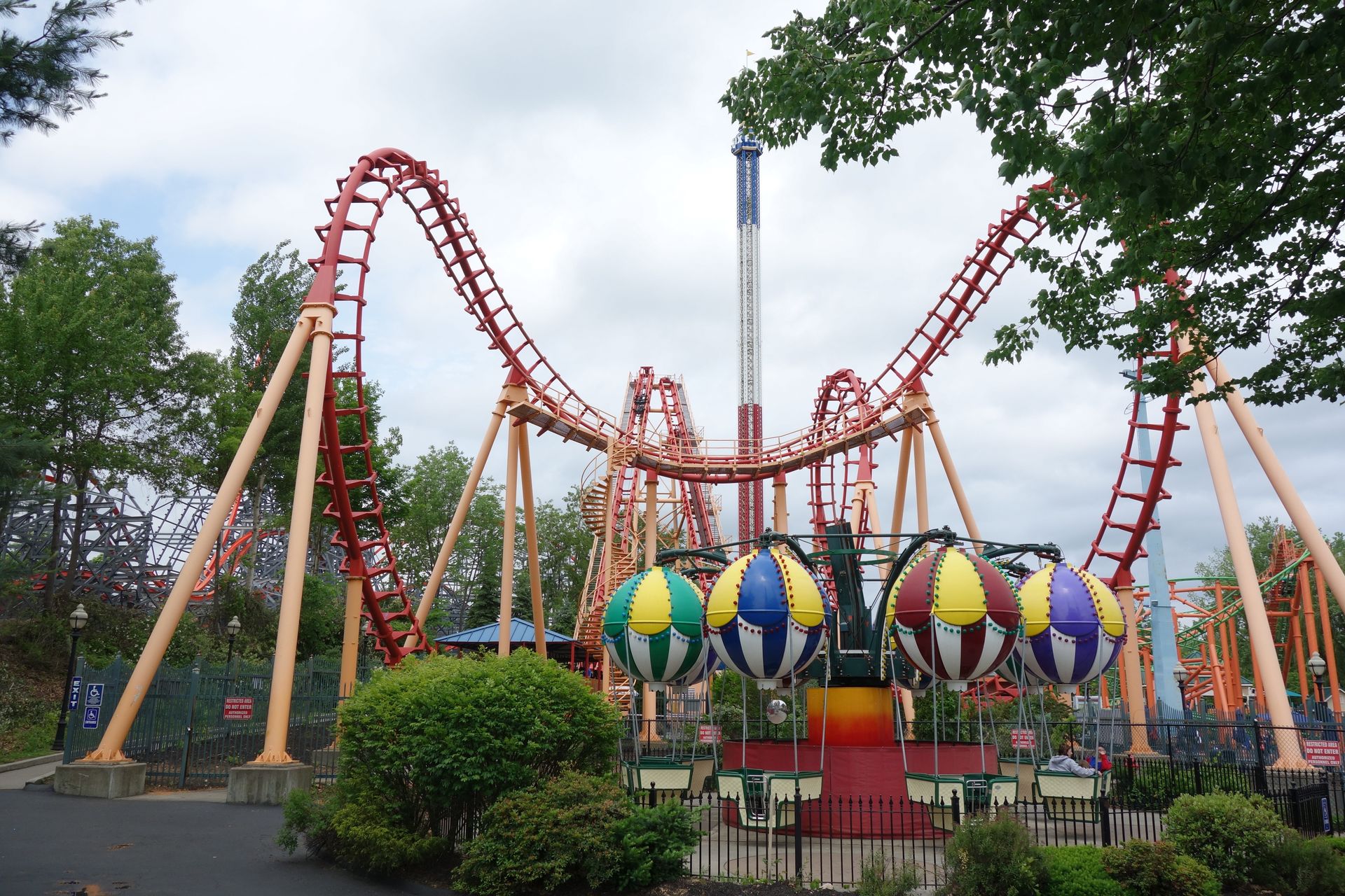 Ja, ihr habt richtig gelesen. Six Flags New England hat tatsächlich zwei Boomerangs im Portfolio, die auch noch direkt nebeneinander stehen. So direkt kann man Normal und Giant Inverted wohl sonst nirgendwo vergleichen. Wer mehr Ohrfeigen verteilt, kann ich leider nicht mehr sagen, aber angenehm waren sie beide nicht. Der Giant ist natürlich einen Tick intensiver, aber letztendlich bleibt es ein (leicht abgewandelter)