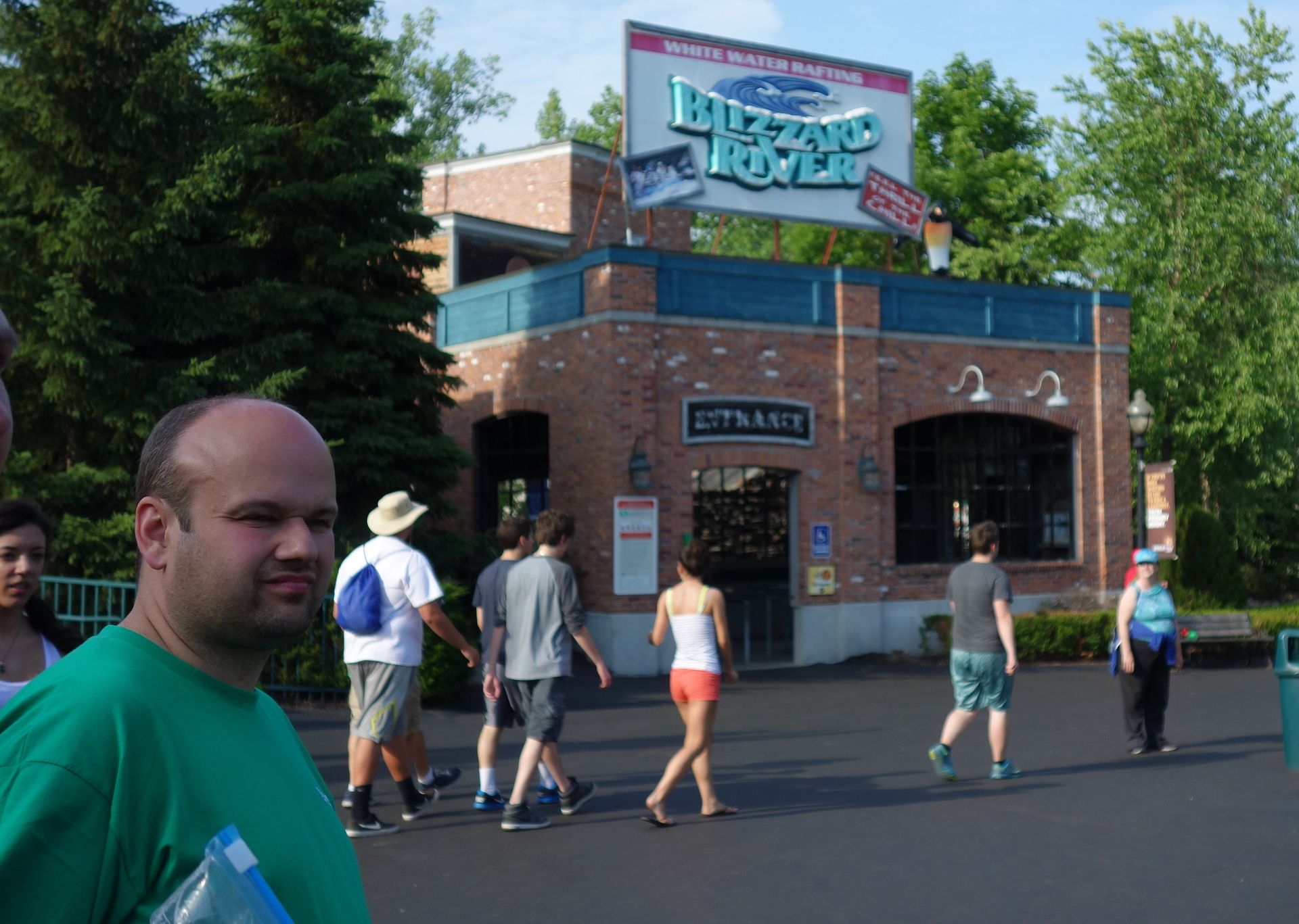 Knapp 40 Minuten vor Parkschluss begaben wir uns nun langsam wieder zu Wicked Cyclone. Eigentlich wollten manche noch den Star Flyer fahren, aber der war schon geschlossen. Stattdessen begaben wir uns in einer kleinen Gruppe zum Blizzard River, dem Rafting des Parks. Von außen überhaupt nicht einzusehen, aber wir gingen einfach mal davon aus, dass es bei weitem nicht so schlimm sei wie jenes am Vortag. Tatsächlich war der Nässegrad recht unterschiedlich. Ein paar wurden von einem Wasserfall und einer Welle ziemlich erwischt, ich blieb vergleichsweise trocken. Also ein Rafting wie es sein sollte, wo man auch Glück haben und sich der Schadenfreude erfreuen kann. Wenn vorher klar ist, dass alle durch und durch nass werden, fehlt das einfach.