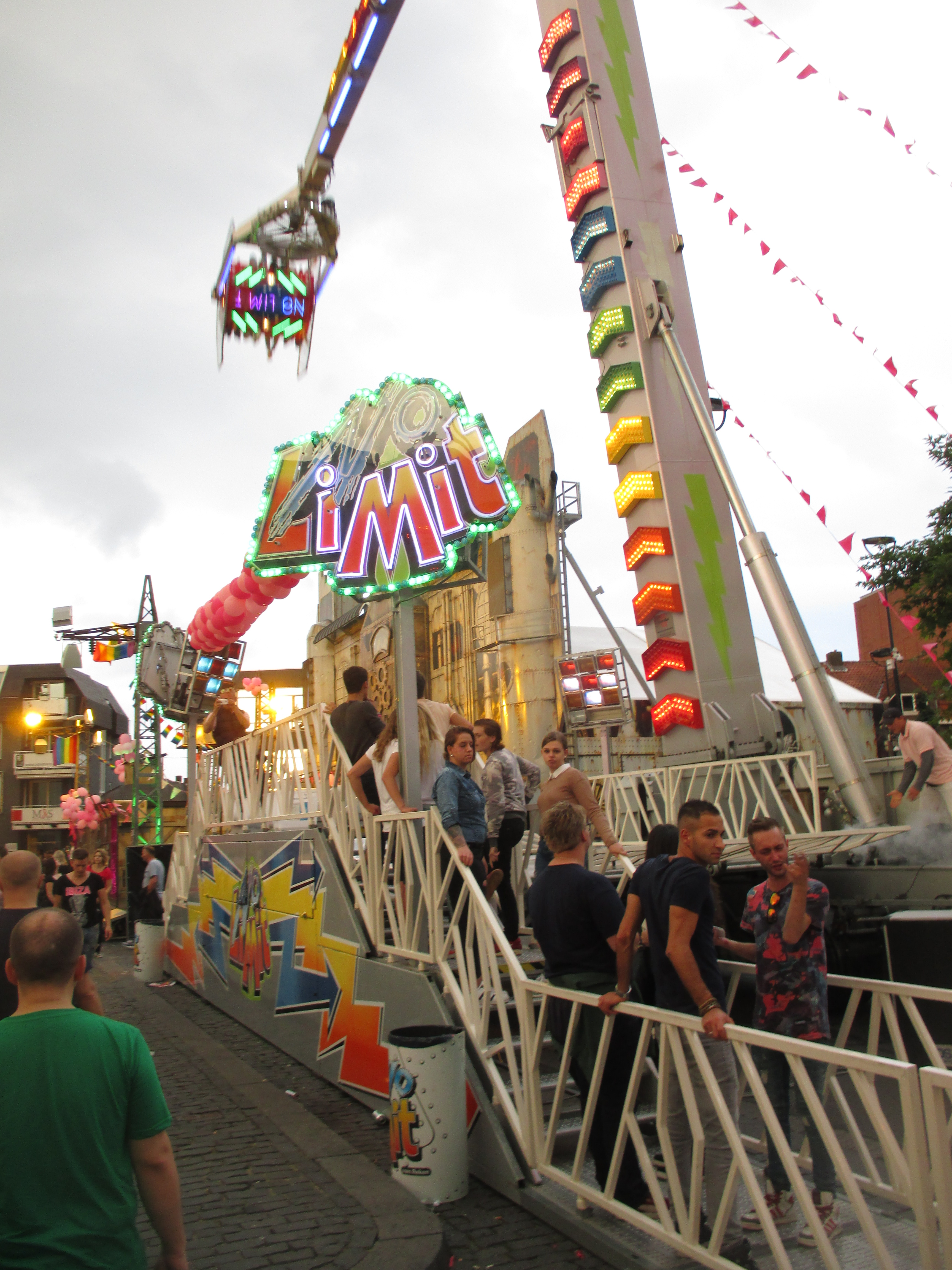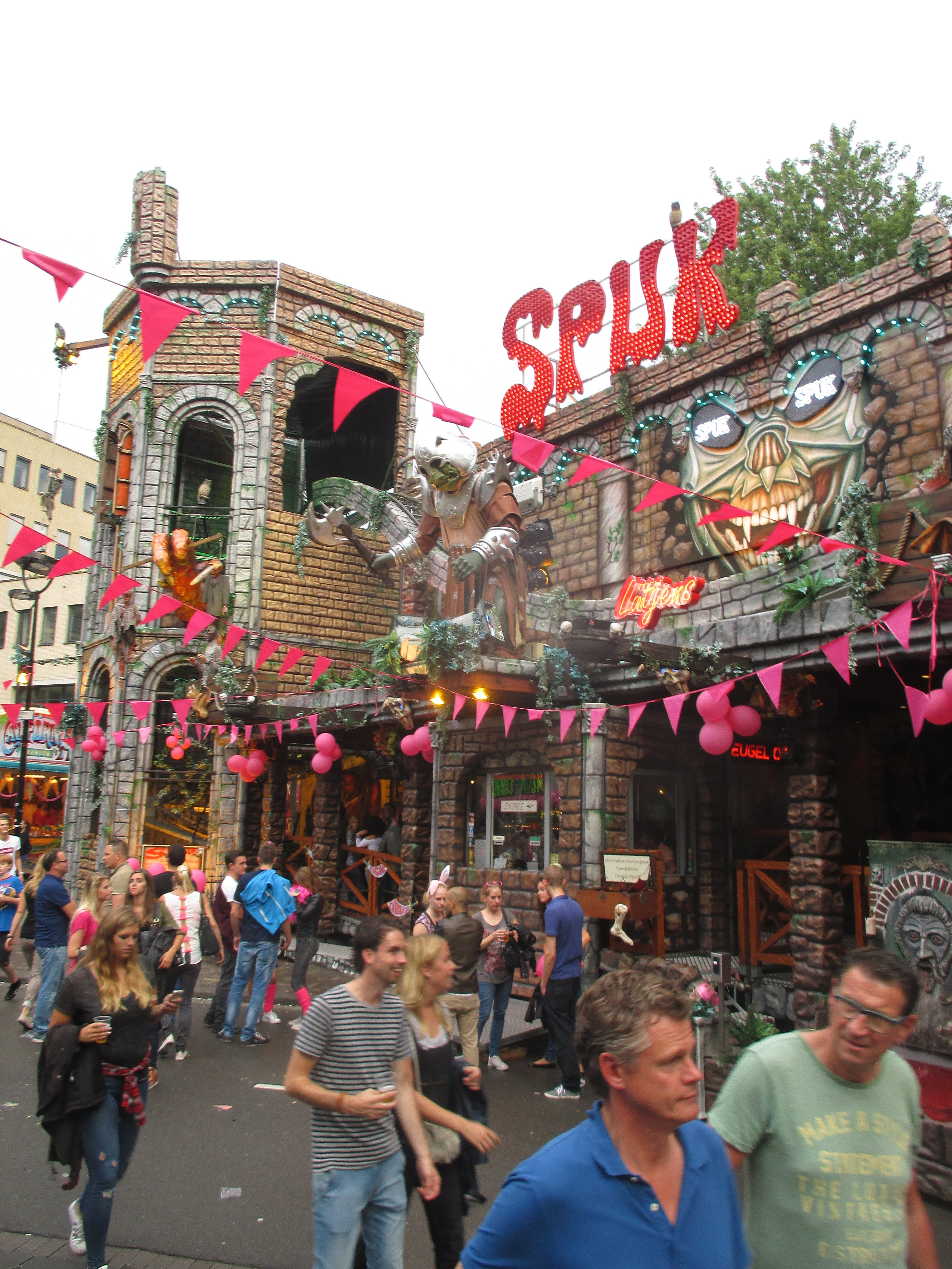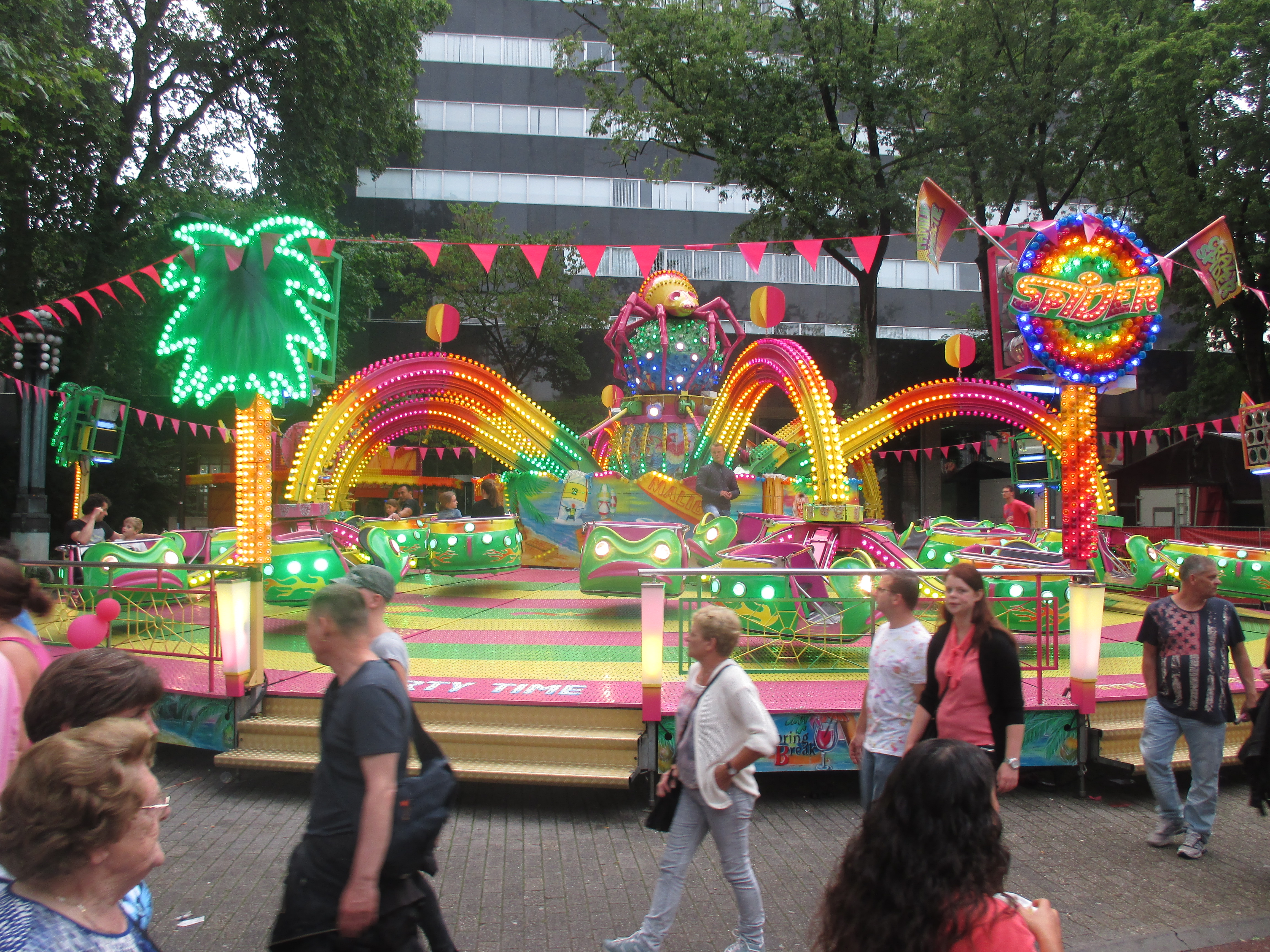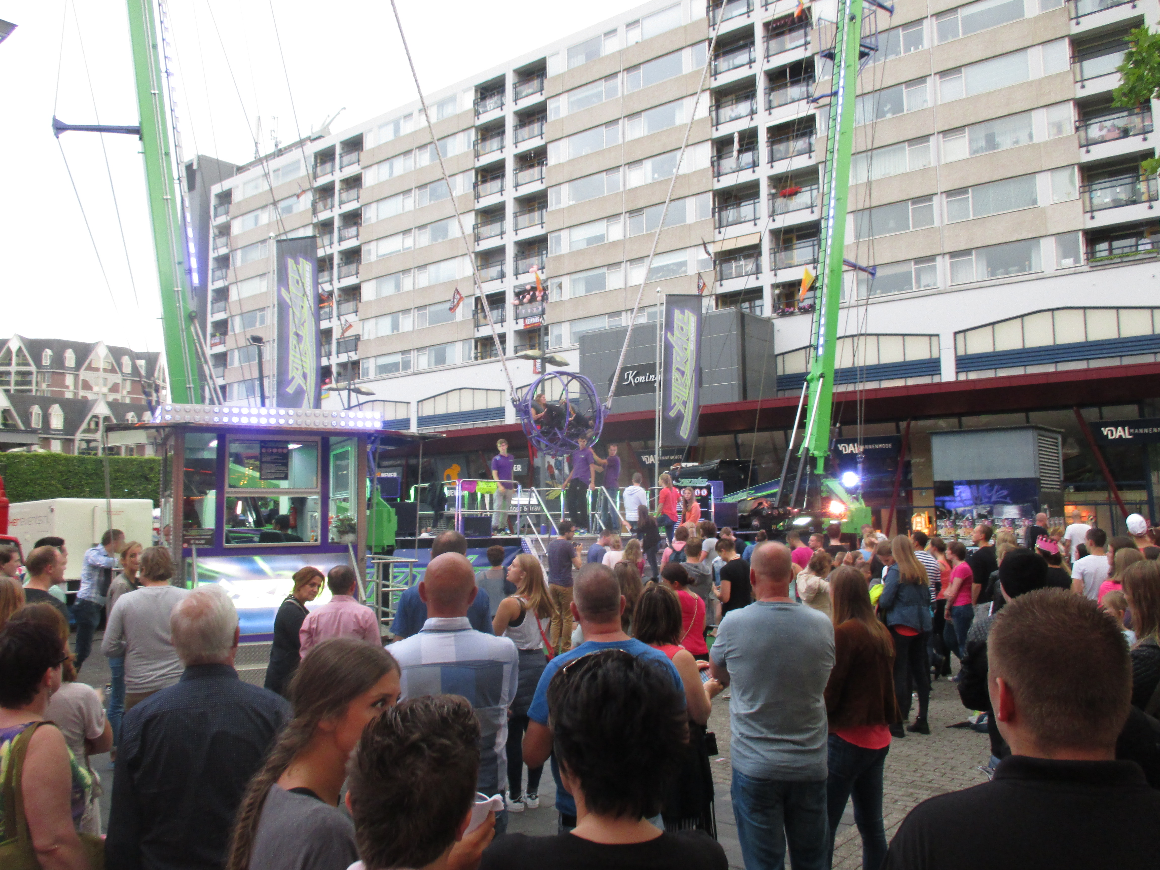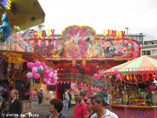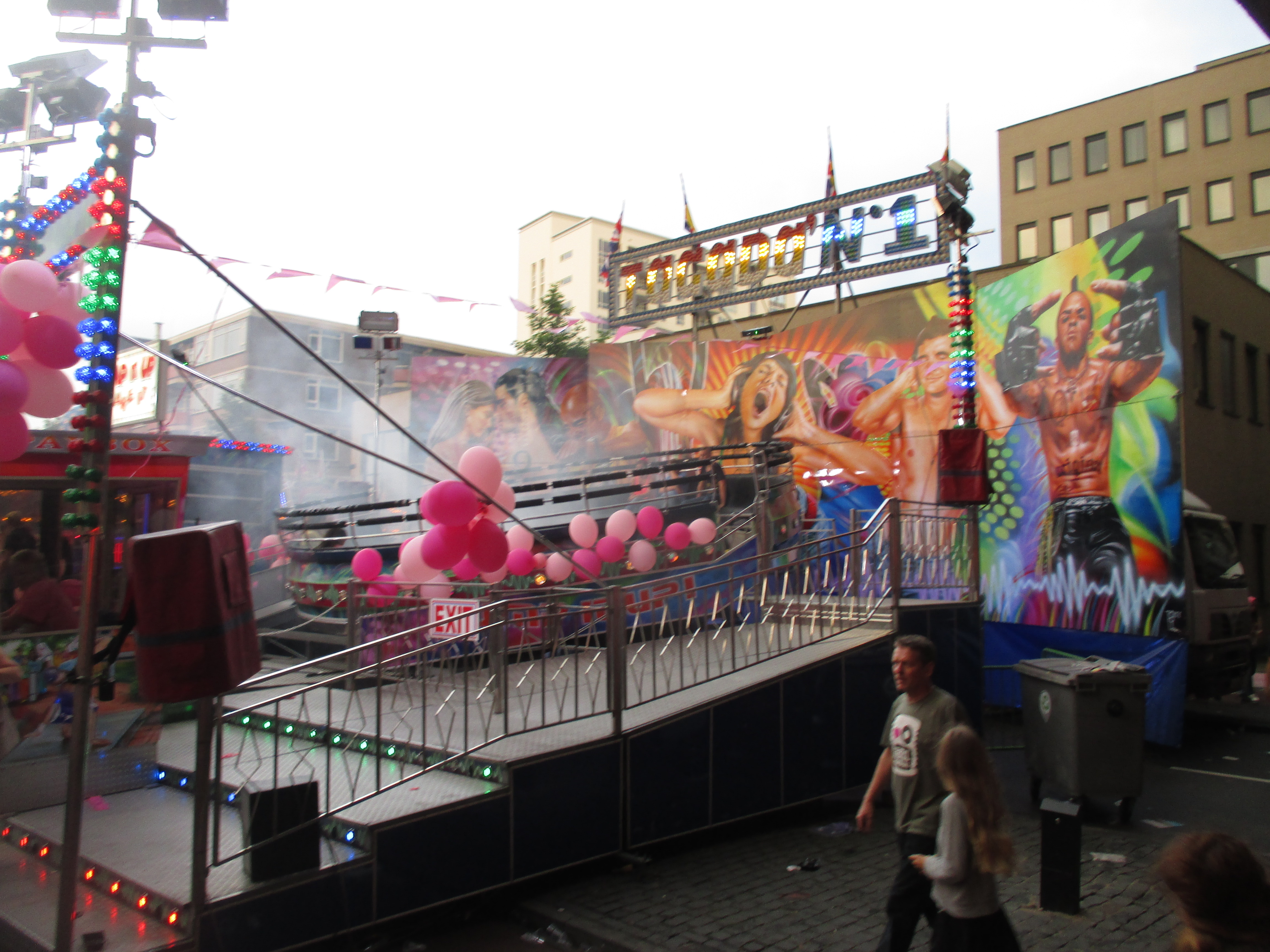 Nachdem wir das Wohnhaus, welches Stadhuisplein und Palaisring voneinder trennt, unterwandert haben, gelangen wir auf den recht lauten und vollen Teil der Veranstaltung. Auf der einen Seite Karussells auf der anderen Straßenseite die Clubs, die sich in puncto Musikuntermalung einen Wettstreit hier leisten.