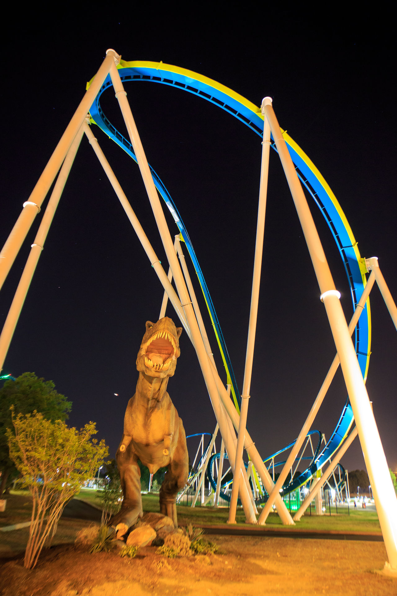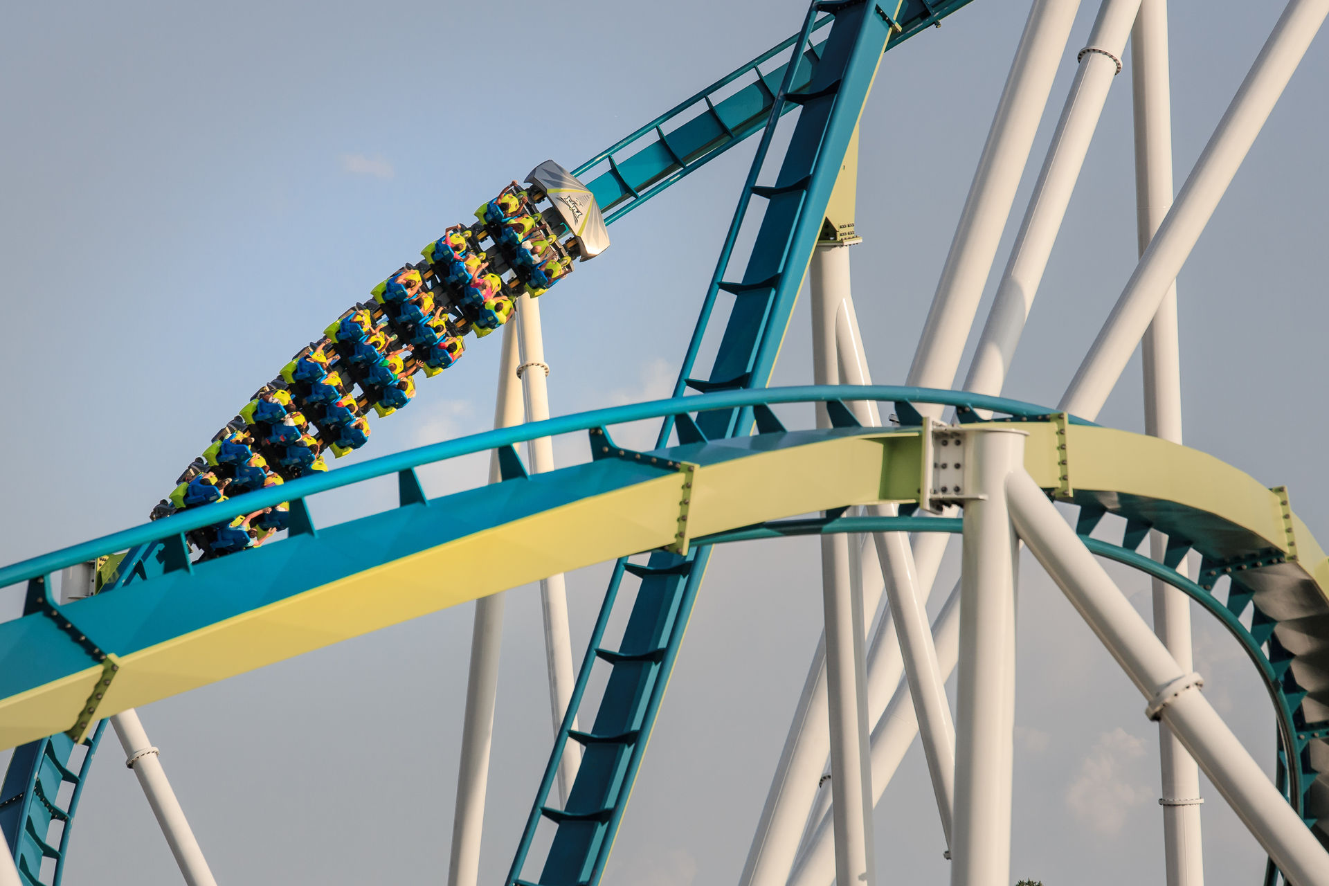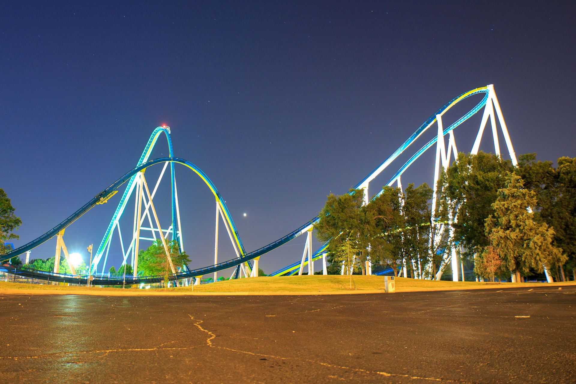 Airtime. Mein Liebslingselement. Der anschließende Tunnel bietet Nachts neongrüne Lichtbögen. Kurzfristig geblendet durchfährt man eine weitere langgezogende bodennahe Kurve, bevor man die erste Trim-Brake passiert. Auf allen anderen