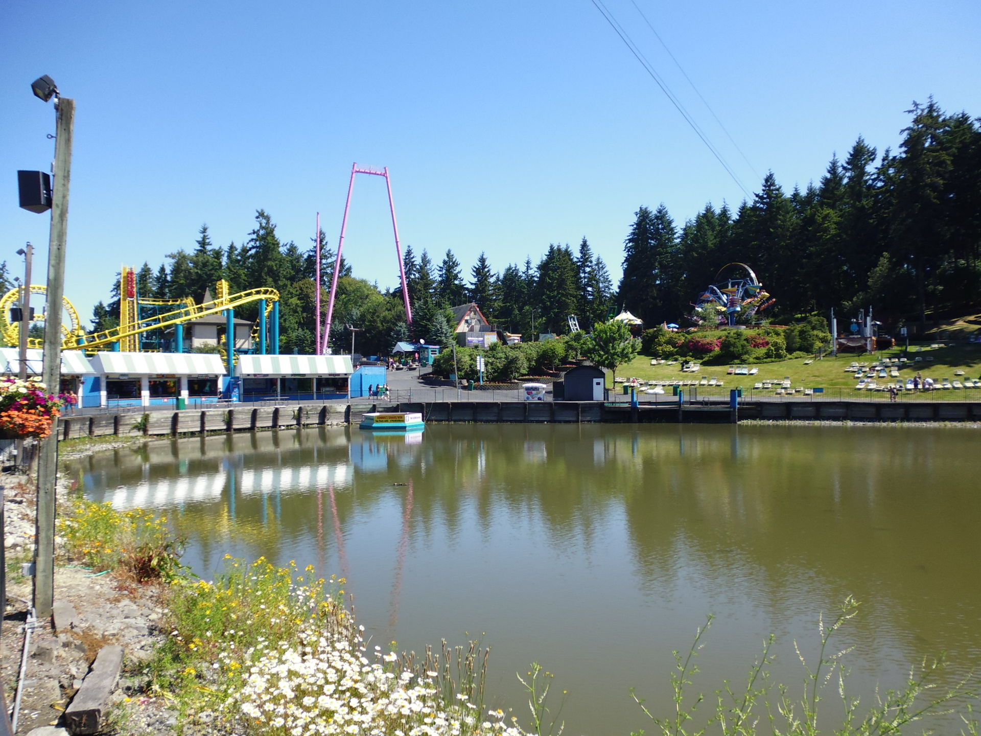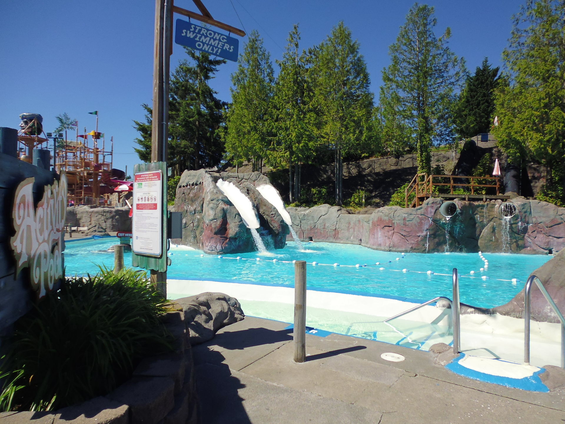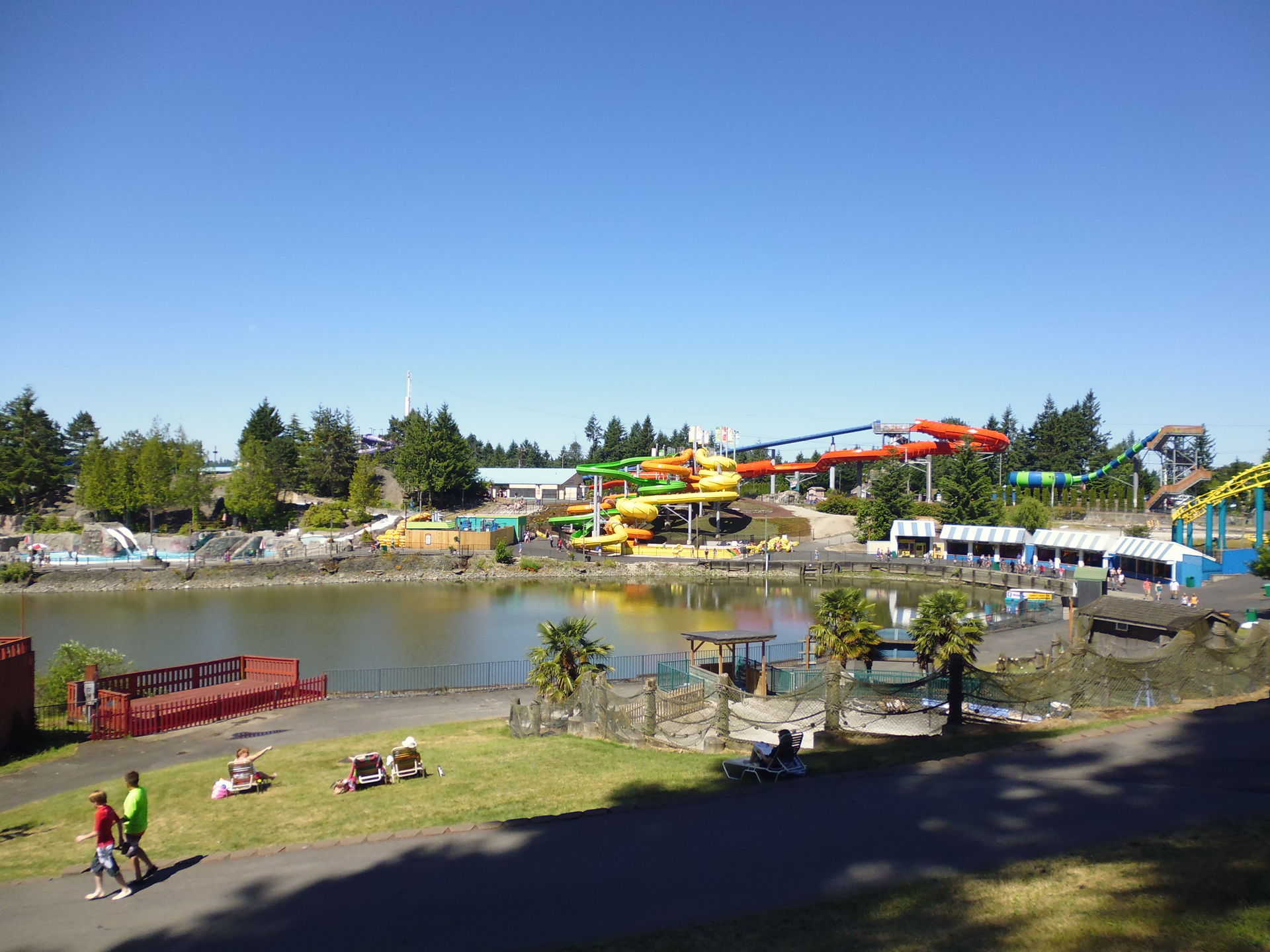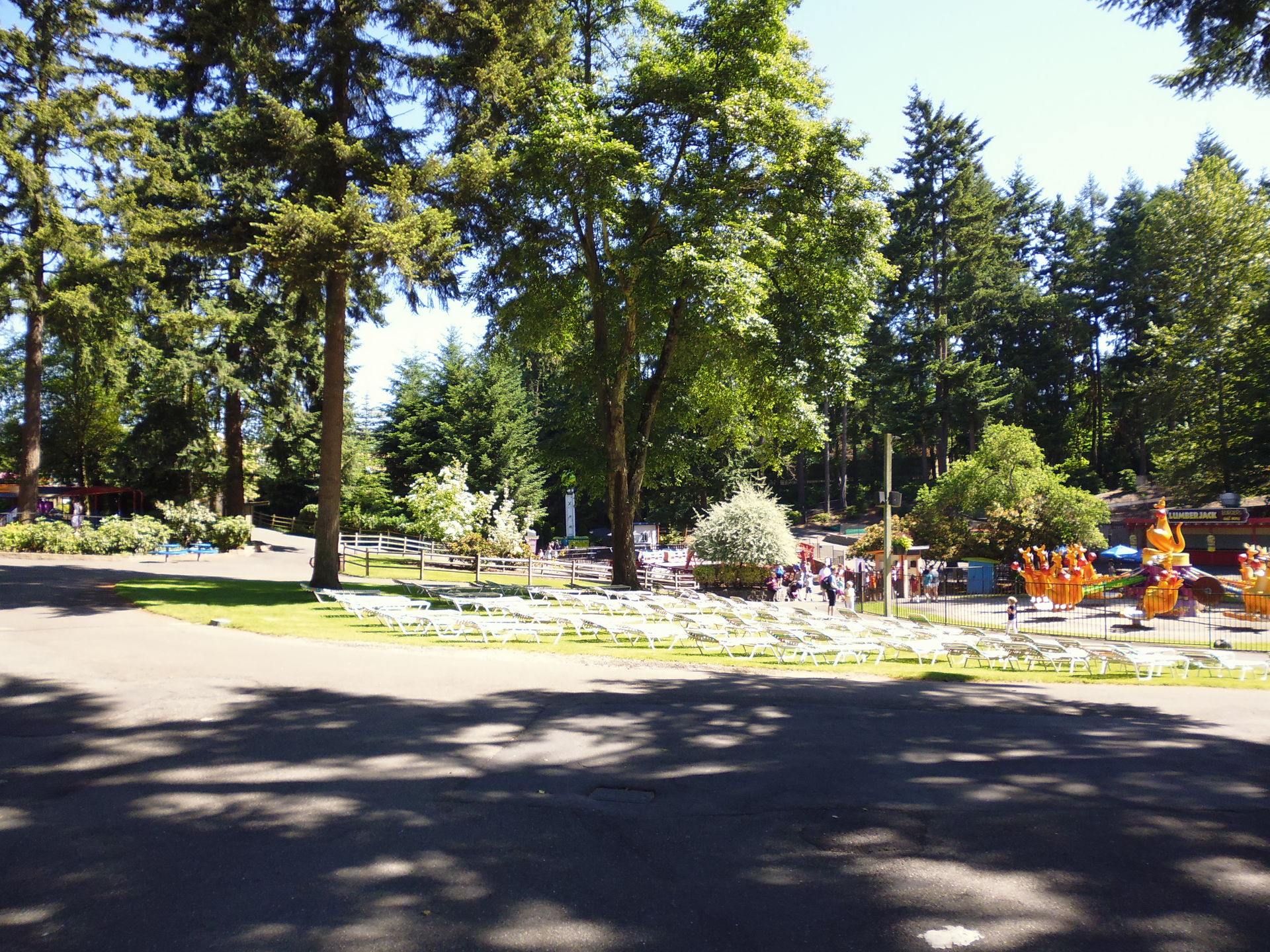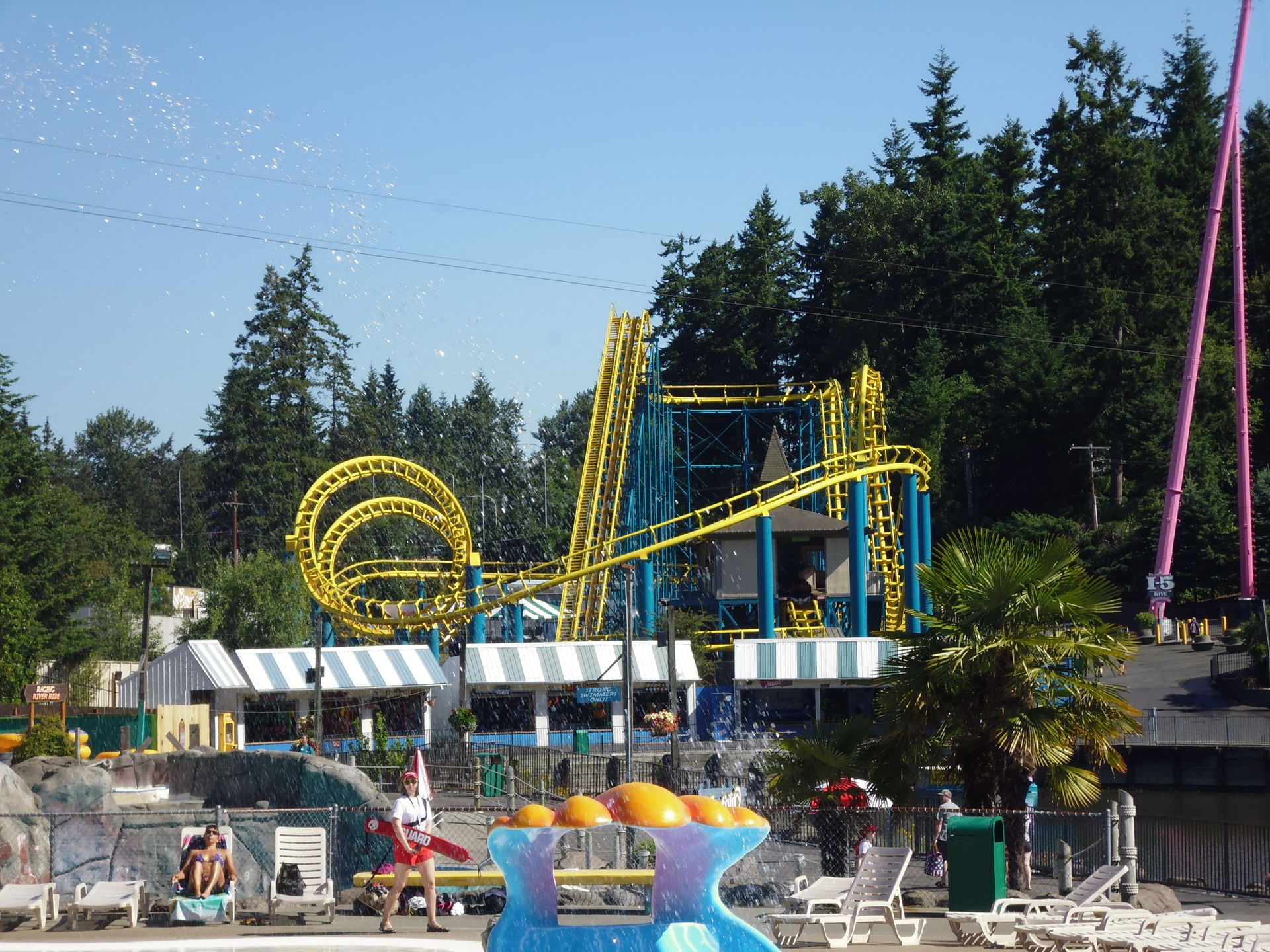 Ausgebreitete Badetücher auf den Wiesen direkt neben Fahrgeschäften. Liegestühle inmitten einer Waldlichtung, die vorrangig Kiddie-Rides beherbergt. Mit einem Handtuch um die Hüften achterbahnfahrende Teeniehorden... Im Gegensatz zu anderen Ami-Parks kann die Trennung der beiden Vergnügen hier schon rein infrastrukturmässig nicht sehr strikt erfolgen. In den USA mit ihren sonst recht strengen Vorschriften diesbezüglich erscheint das irgendwie seltsam - aber auch voll locker und lässig!