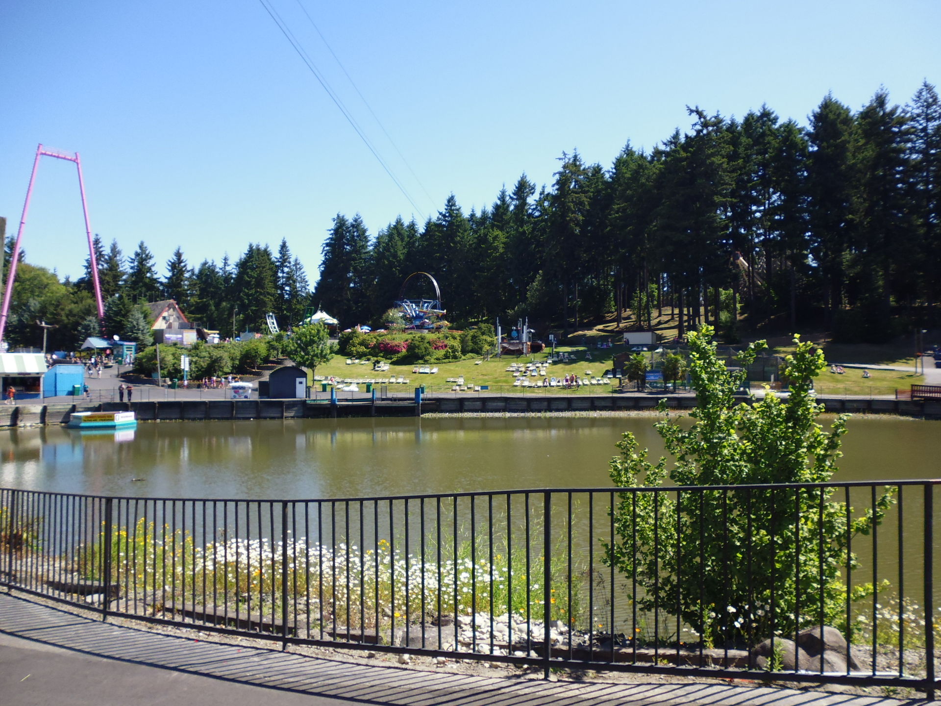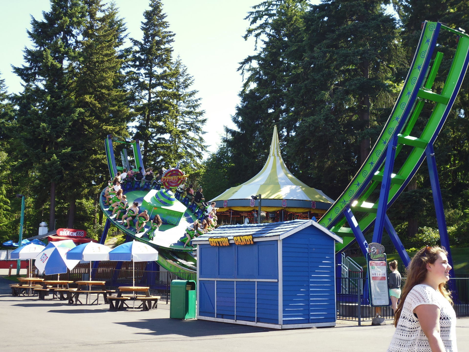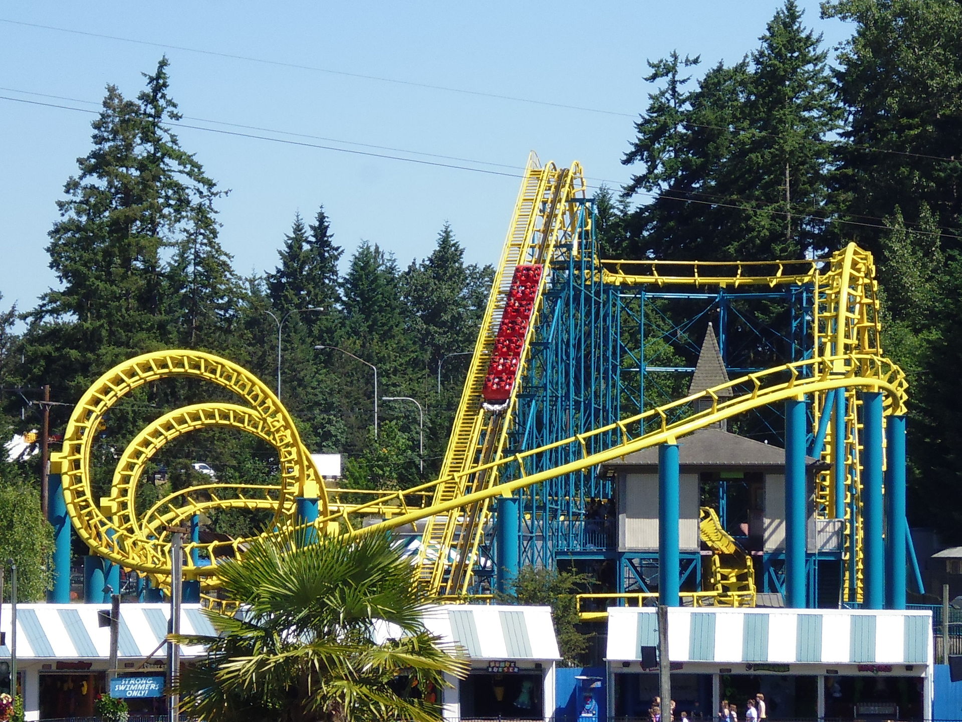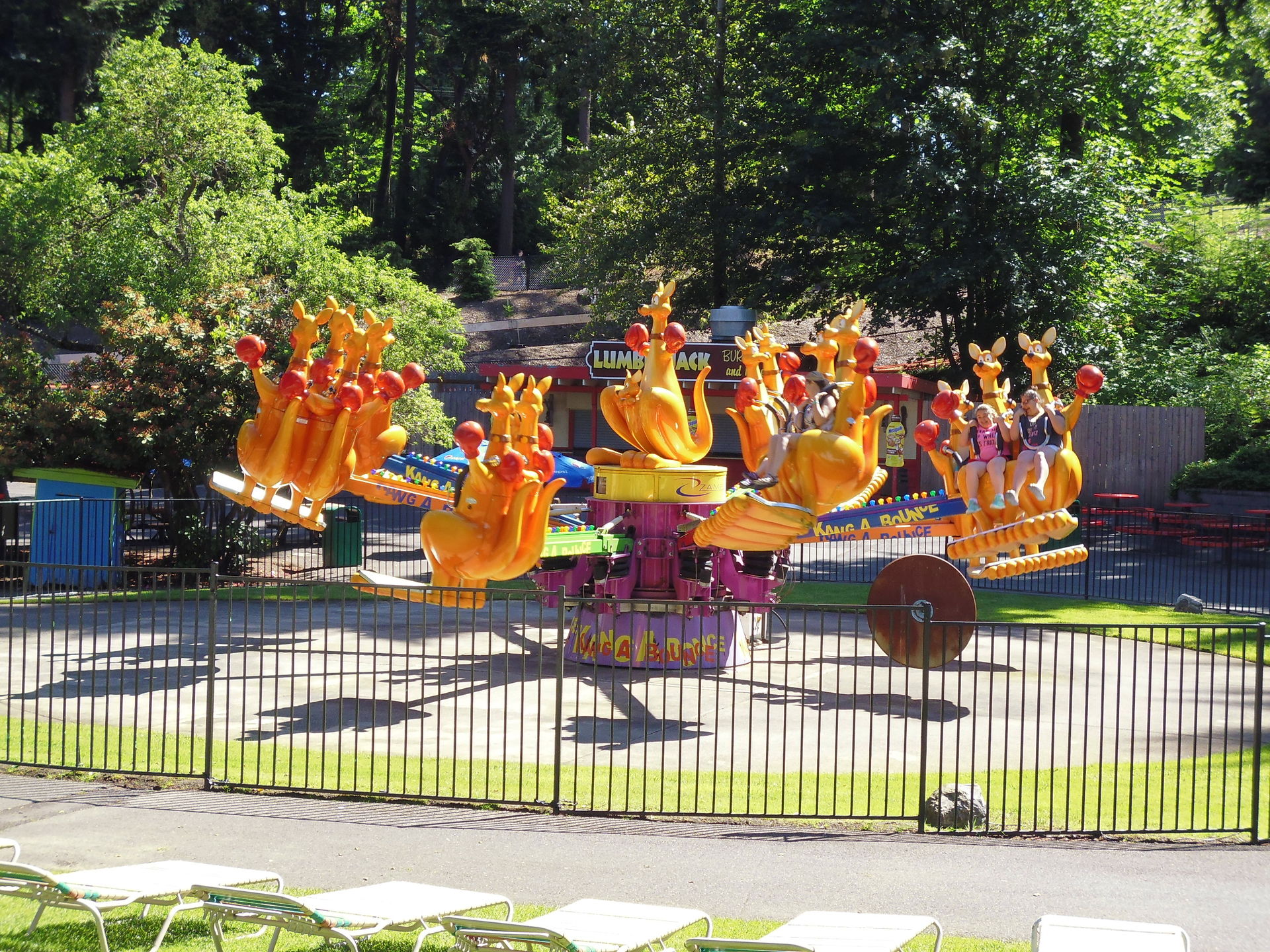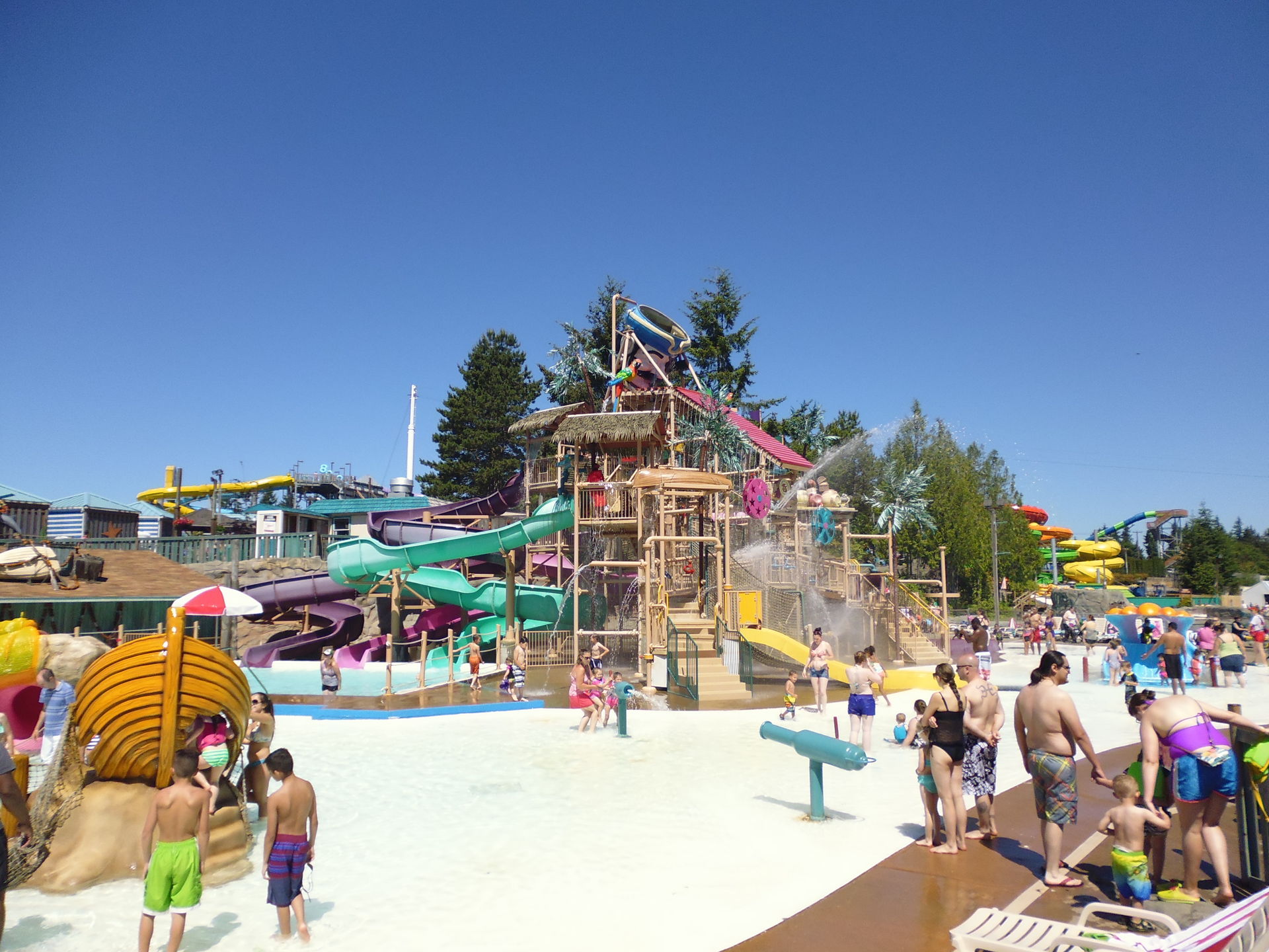 Ausgebreitete Badetücher auf den Wiesen direkt neben Fahrgeschäften. Liegestühle inmitten einer Waldlichtung, die vorrangig Kiddie-Rides beherbergt. Mit einem Handtuch um die Hüften achterbahnfahrende Teeniehorden... Im Gegensatz zu anderen Ami-Parks kann die Trennung der beiden Vergnügen hier schon rein infrastrukturmässig nicht sehr strikt erfolgen. In den USA mit ihren sonst recht strengen Vorschriften diesbezüglich erscheint das irgendwie seltsam - aber auch voll locker und lässig!