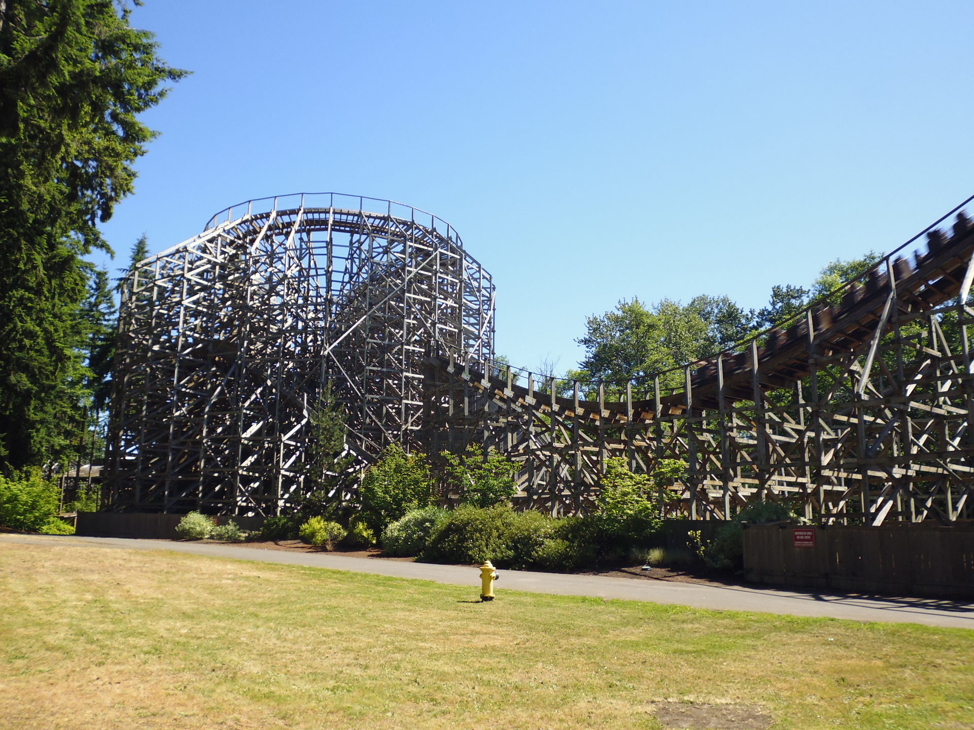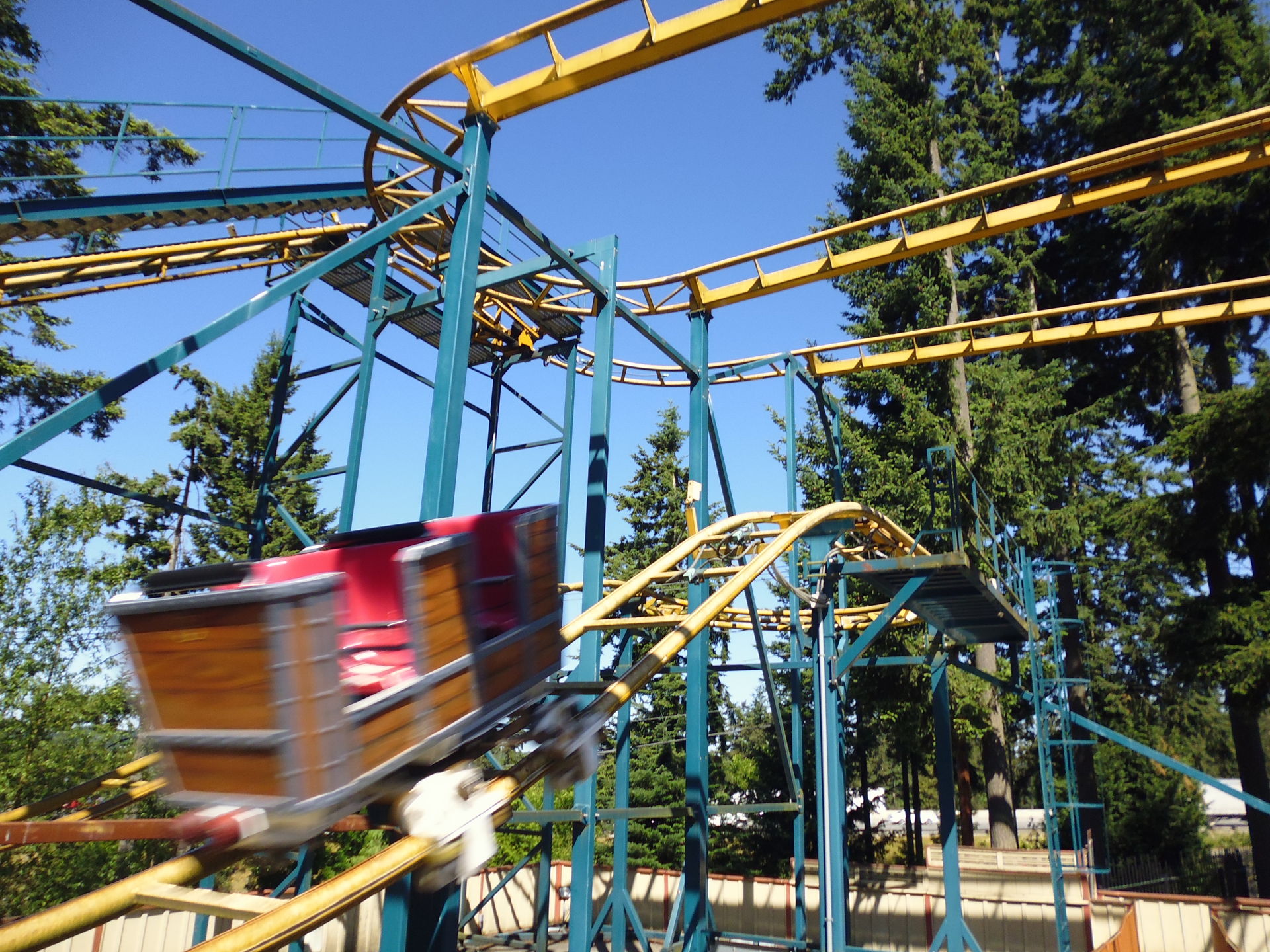 First Drop durchs Stützwerk hindurch talwärts, bevor es dann im Prinzip je ein kleines Out-and-Back-Layout in beide Richtungen von diesem