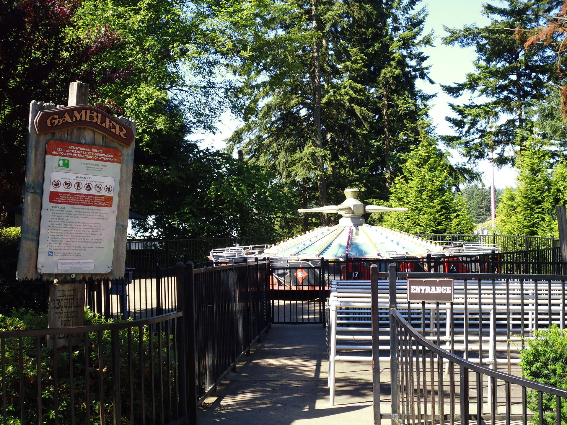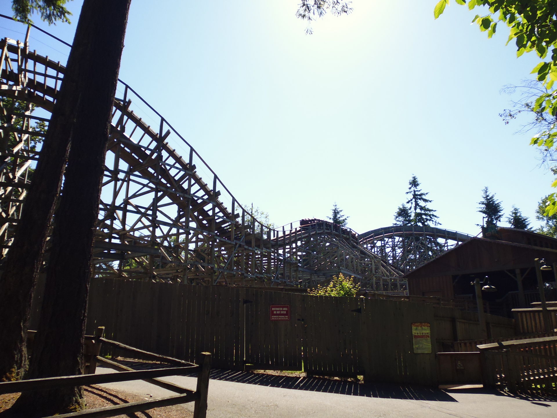 Nach nur kurzer Fahrt pünktlich zur Öffnungszeit um 09.30 Uhr vor Ort eingetroffen erwartete mich am Eingang dann bereits eine schöne Überraschung: ähnlich wie in Silverwood gab es auch hier anstelle des Vollpreises von 39.99$ plus Tax ein Vorsaisons-Spezialticket. Online hätte es, ohne Witz jetzt, bloss 14.99$ gekostet, an den Parkkassen lediglich fünf Dollar mehr. Mit Steuer kam man so auf knapp unter 22$ Eintrittsgeld. Für diesen Park wirklich mehr als angemessen! So hab ich mich dann mit dem Gefühl der Zufriedenheit, einen guten Deal gemacht zu haben, in die abschreckend lang aussehende Taschenkontrollen-Schlange begeben, die jedoch sehr rasch abgefertigt war, so dass kurz darauf nichts mehr im Wege stand, nun endlich die Coaster zu erstürmen!