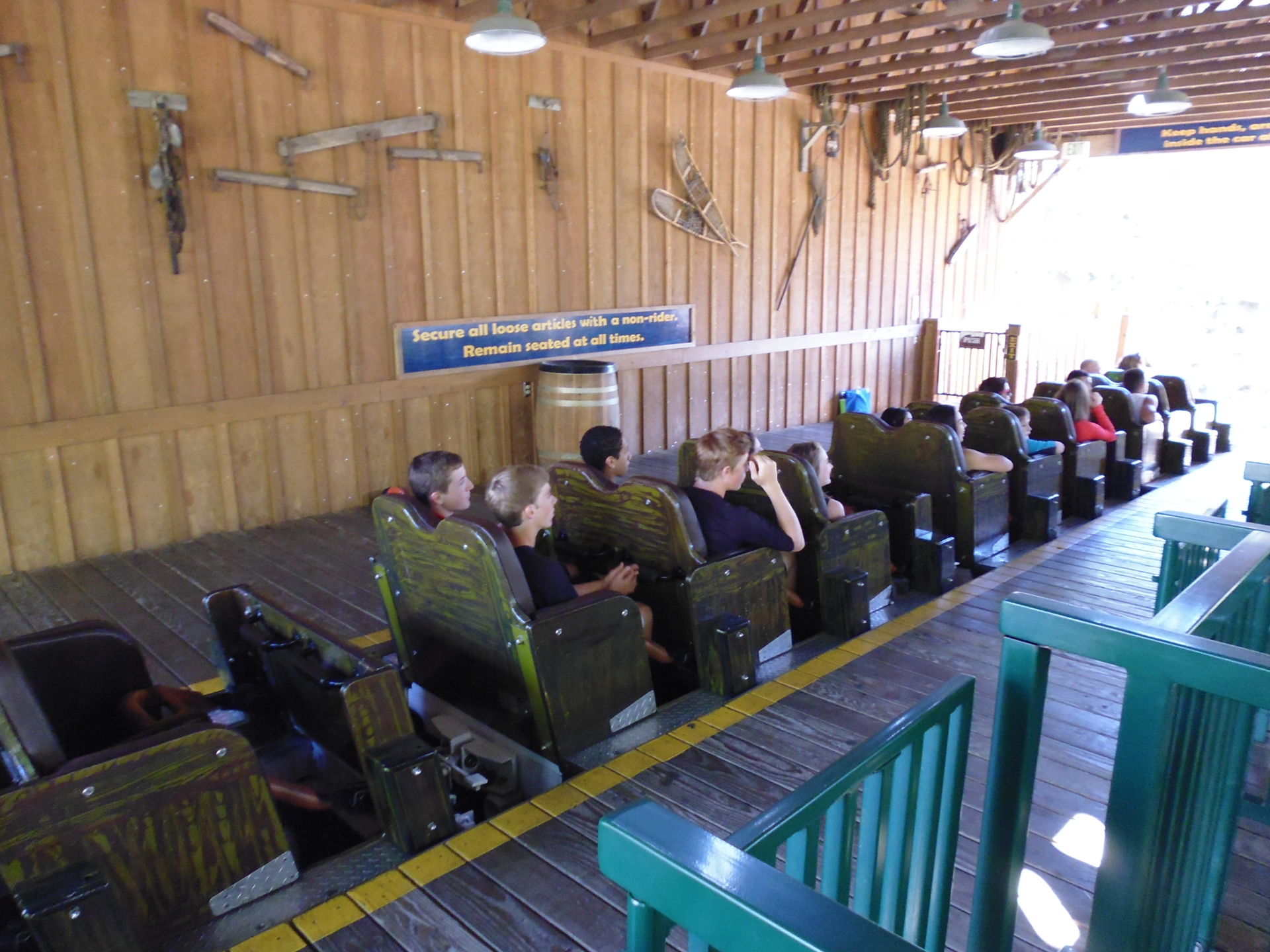 Ob das nur an vergleichsweise leeren Vorsaisons-Tagen oder aber immer so gehandhabt wird, entzieht sich meiner Kenntnis. Fest steht jedoch: auf diese Weise wird sogar noch ein eh schon nicht überragender Einzugbetriebs-Throughput halbiert. Dass sich hier mit sehr grossem Abstand ganz rasch die längste Schlange des Tages gebildet hat, erklärt sich ja von selbst. Dank meines frühen Erscheinens hier musste ich zum Glück nur einen solchen Doppelzyklus abwarten (bei dem übrigens vor der zweiten Runde tatsächlich noch einmal alle Bügel in der Station durchkontrolliert werden!) und konnte schon bald im klassischen Arrow-Zug Platz nehmen.