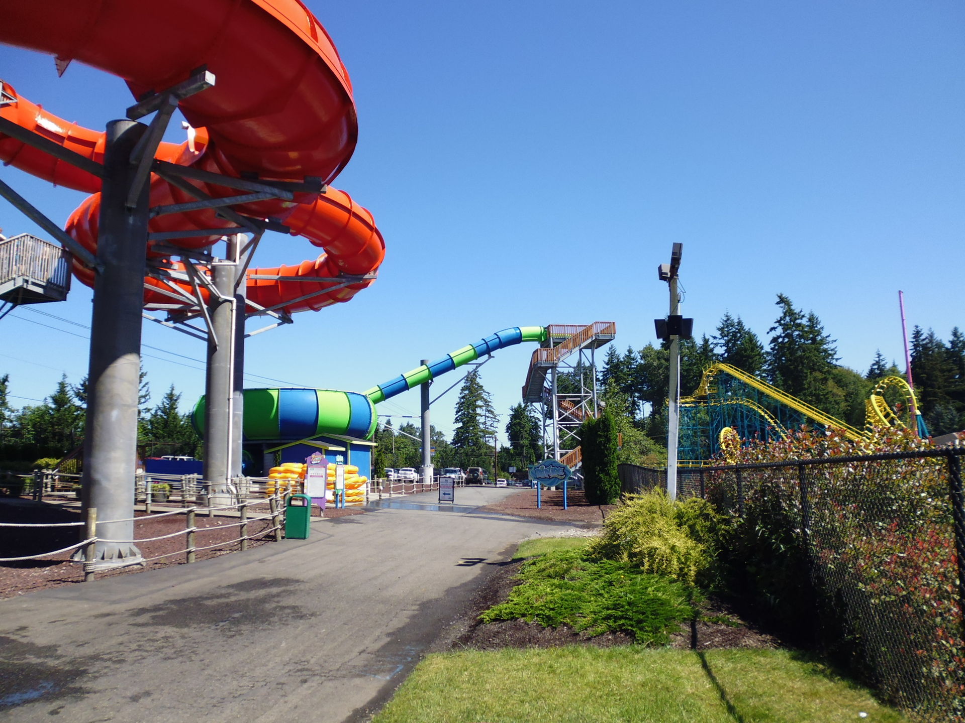 Im Anschluss an meinen viertägigen Kanada-Abstecher, der mit einer Stadtbesichtigung von Vancouver und einem Besuch im Playland endete, war ich nun also zurück in den USA und im Grossraum Seattle angekommen. Von meiner Econo Lodge in Fife aus machte ich mich tags darauf dann auf zum nächsten und nur einen Katzensprung entfernt liegenden nächsten Parkziel: Wild Waves. Dieser ehemals unter dem Namen Enchanted Village auftretende und eine Zeitlang sogar von Six Flags betriebene Kleinpark besitzt einen euphemistisch ausgedrückt recht überschaubaren Freizeitparkteil. Aufgrund des halt doch eher standardmässigen Angebots hier war schon im Vornherein eigentlich klar, dass zwei, drei Stündchen am Morgen hier völlig ausreichen werden und ich im Anschluss dann noch ein wenig was von Seattle sehen wollte. Interessant: im Verlaufe der Zeit hat das ganze Areal den ursprünglich nur den Wasserparkteil bezeichnenden Namen angenommen - Wild Waves. Allerdings liegt die Anlage nach wie vor an einer Strasse namens Enchanted Parkway, was ja doch bereits bei der Anfahrt auf eine gewisse Magie einstimmt.