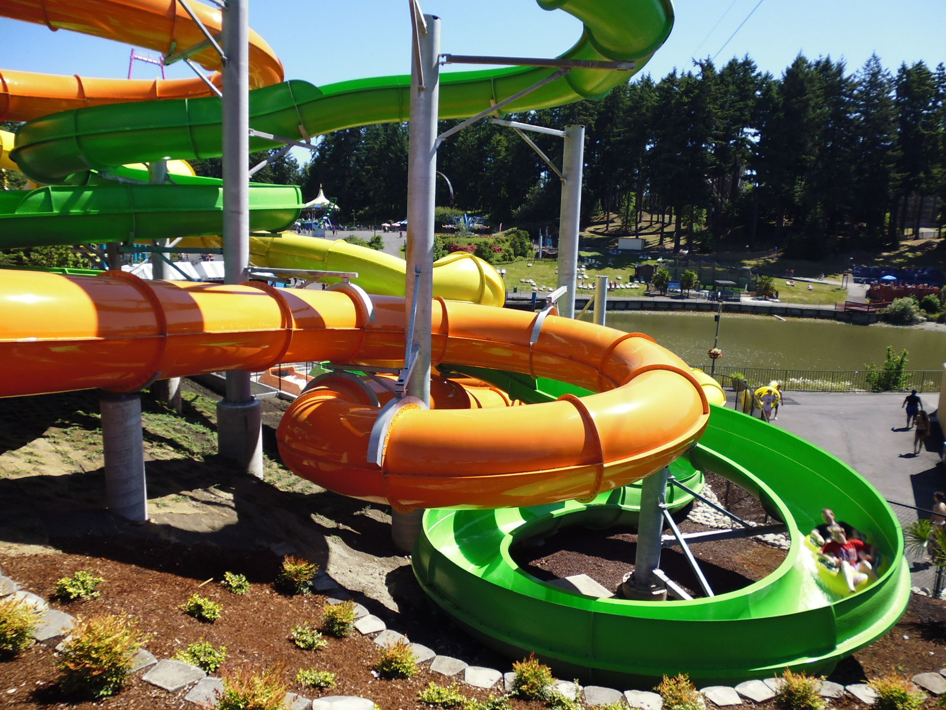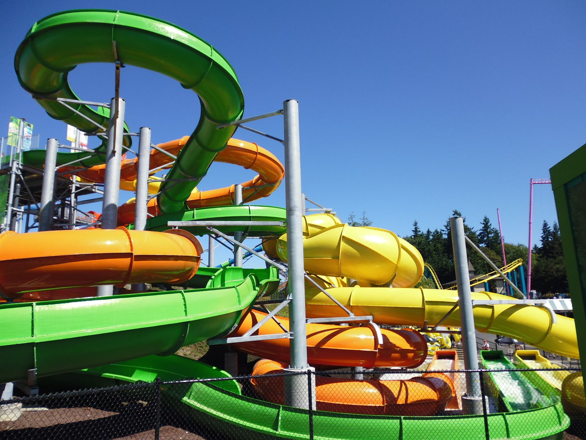 Diese heissen - kein Witz - Mountain Dew Slides. Eine davon ist eine dieser neuartigen und zurzeit in recht vielen Wasserparks auftauchenden Constrictor-Rutschen mit extrem engen Kreiseln.