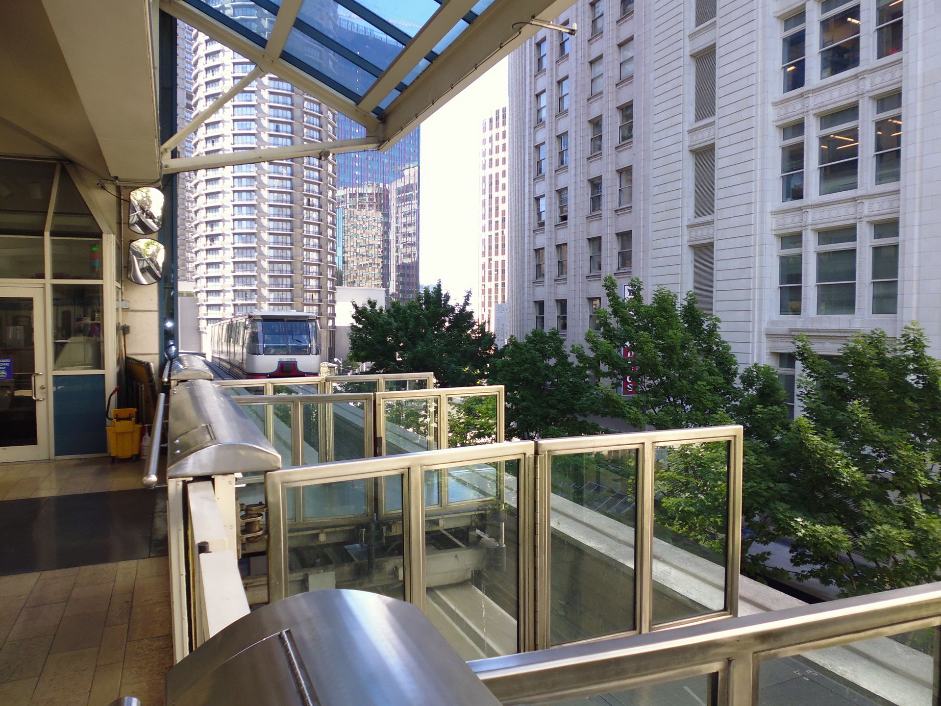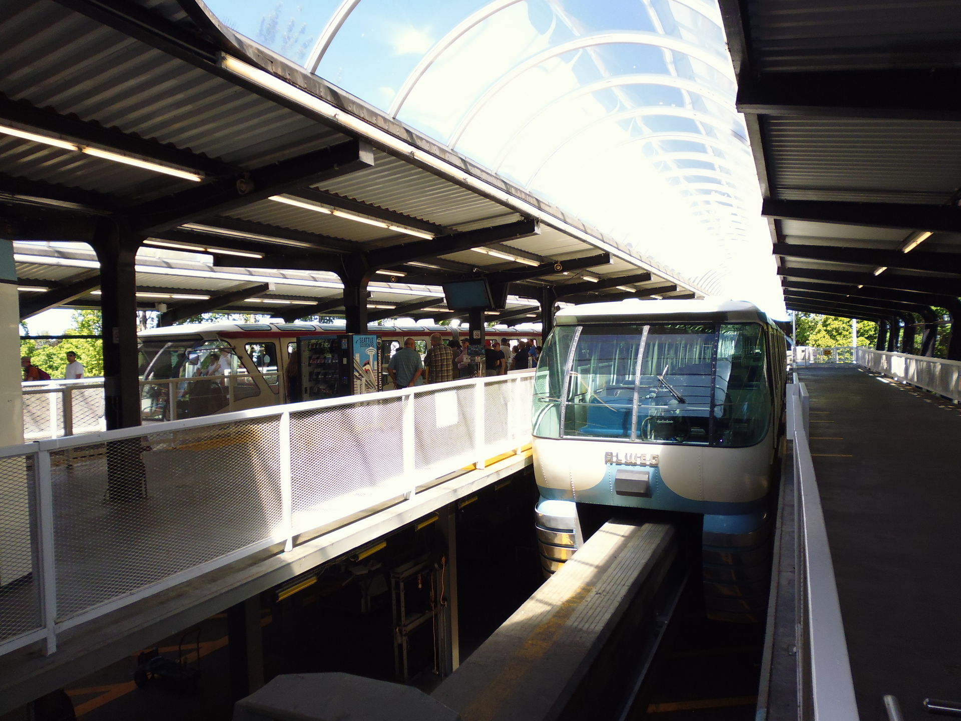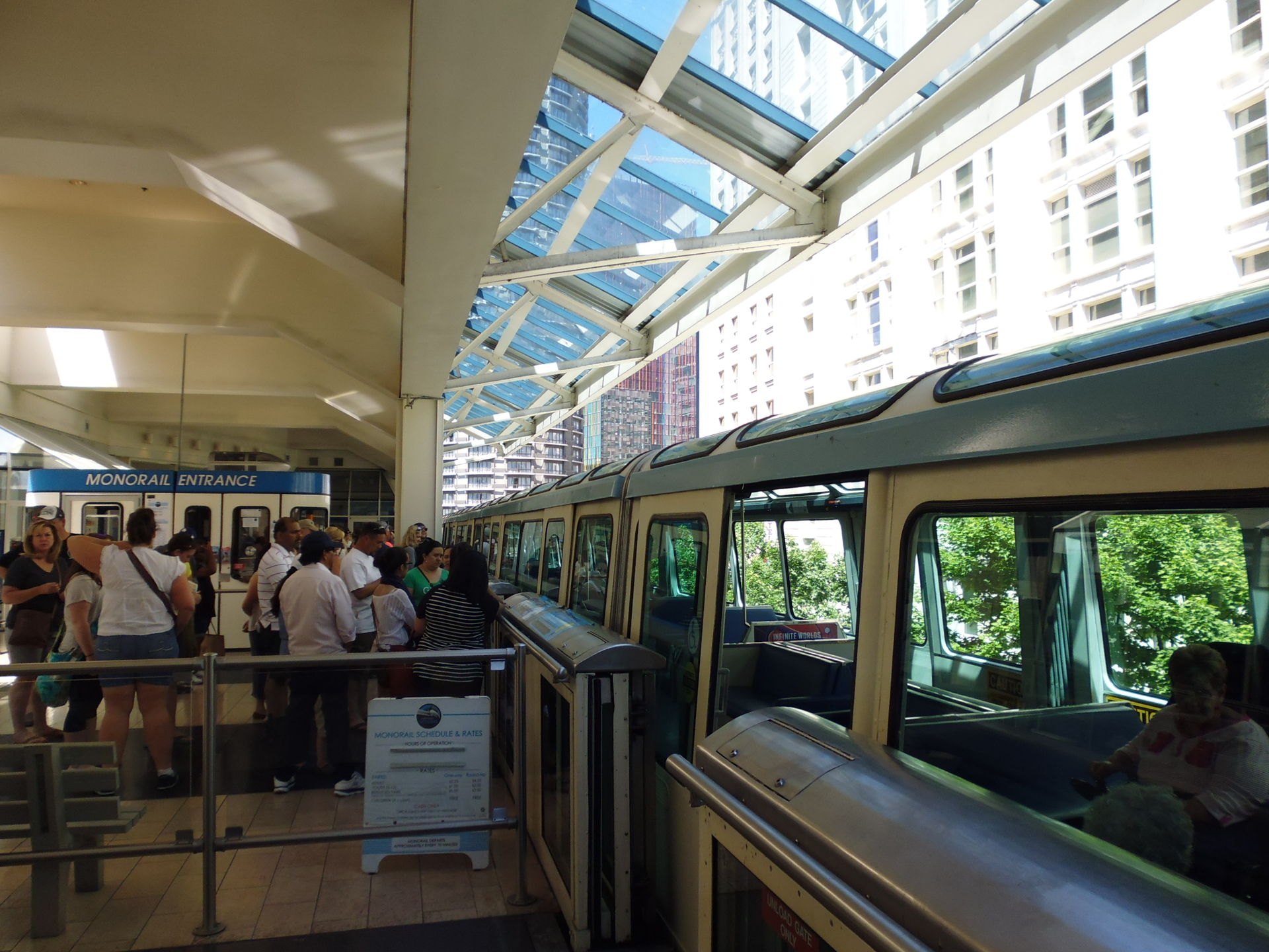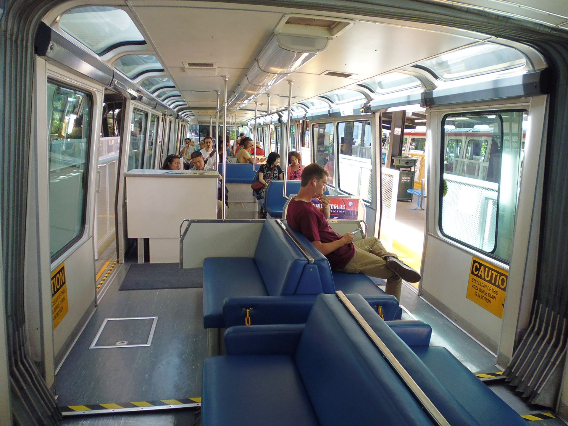 Ebenda am Westlake Center angekommen staune ich über den Aussteigevorgang am bloss einseitigen Perron: es werden nur zwei Türen der Monorail geöffnet, welche die ankommenden Fahrgäste in einen Bereich auf dem Bahnsteig entlassen, zu dem die bald zusteigenden keinen Zutritt haben.
