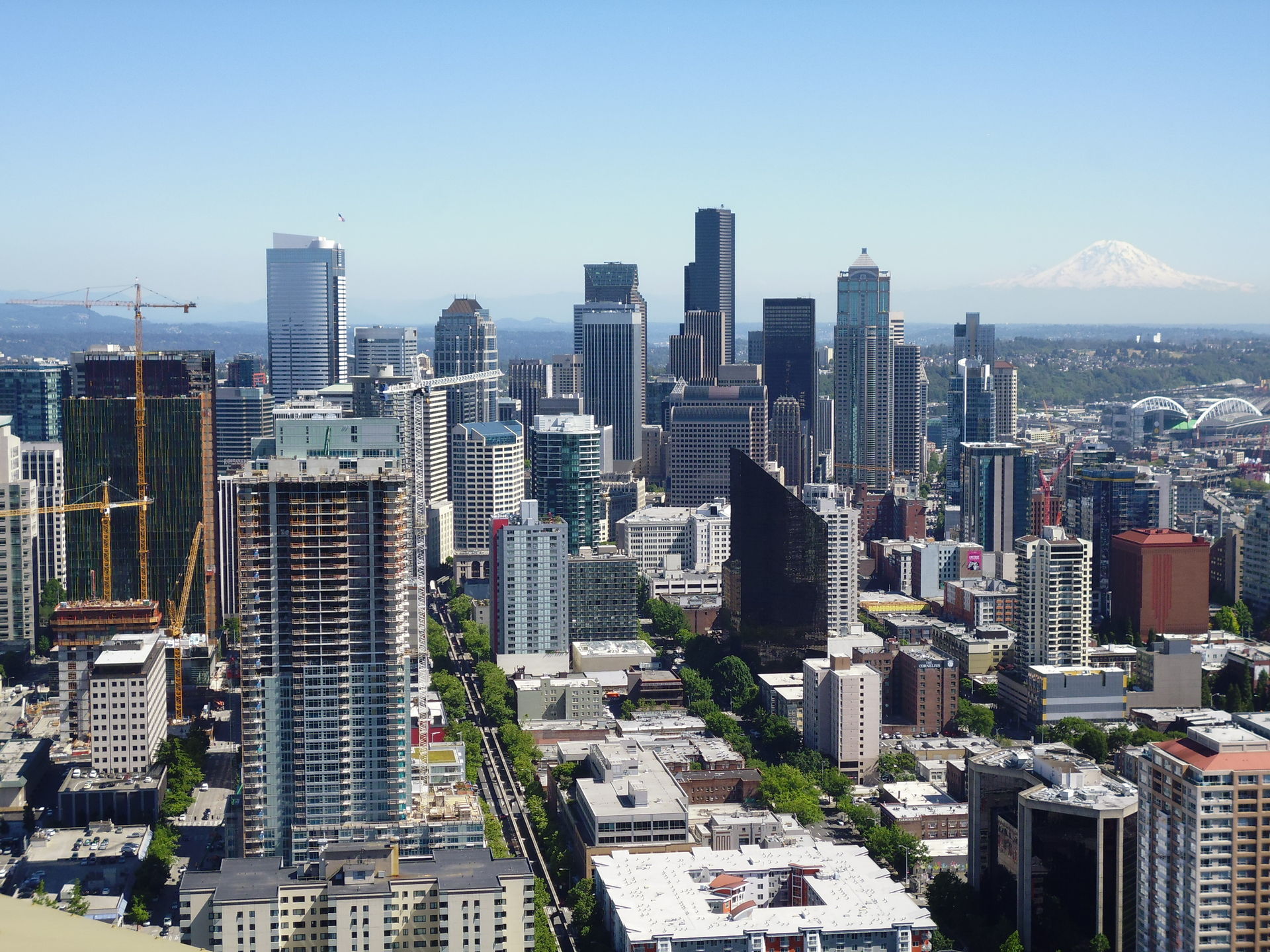 Wie beim Vancouver Lookout vor zwei Tagen bringen einen auch hier schnell fahrende Glaslifte bis ganz nach oben. Und dies ist der Anblick auf Downtown Seattle von der aussen liegenden Panoramaplattform aus! Live war es noch etwas deutlicher erkennbar, aber ich habe tatsächlich einen Tag erwischt, wo man den surreal hohen Mt. Rainier noch verschwommen gesehen hat - ganz abgesehen von der Tatsache, überhaupt zwei Tage Sonnenscheinwetter angetroffen zu haben, hat dies im typischen Klima Seattles recht hohen Seltenheitswert.