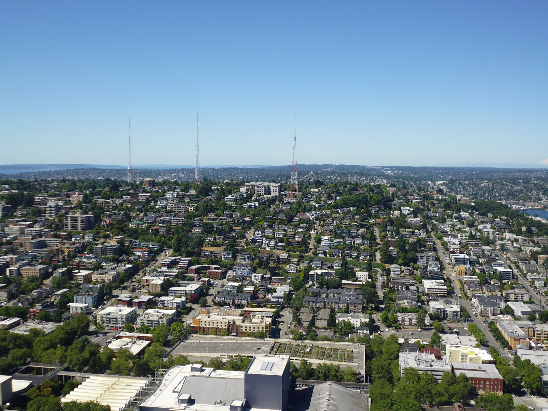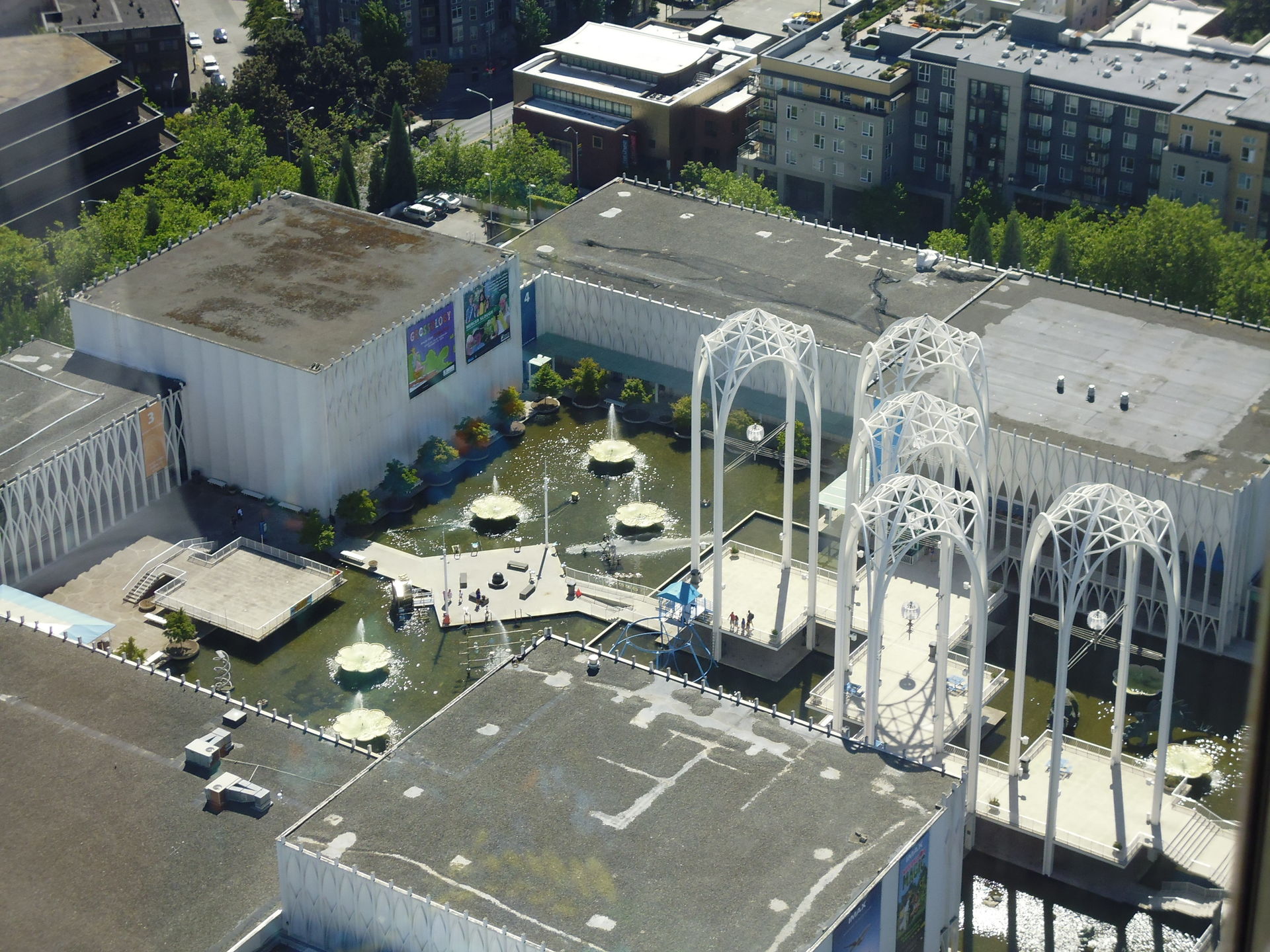Was ich speziell in diese Richtung blickend etwas schade fand: die Space Needle hat ihrem Atomic Design geschuldet mehrere "Saturnringe" um die Aussichtsplattform rum, wodurch nach unten gerichtete Fotos mit einer Miniknipse wie der meinen leider weitestgehend verhindert werden. Sofern man bei den Liftfahrten ganz vorn an den Glastüren stehen kann, gelingen dort am ehesten noch solche Bilder - leider mussten wir bei meiner Runterfahrt aber noch Gäste vom Drehrestaurant aufgabeln, so dass ich in der Liftkabine nach hinten zurück gedrängt wurde.