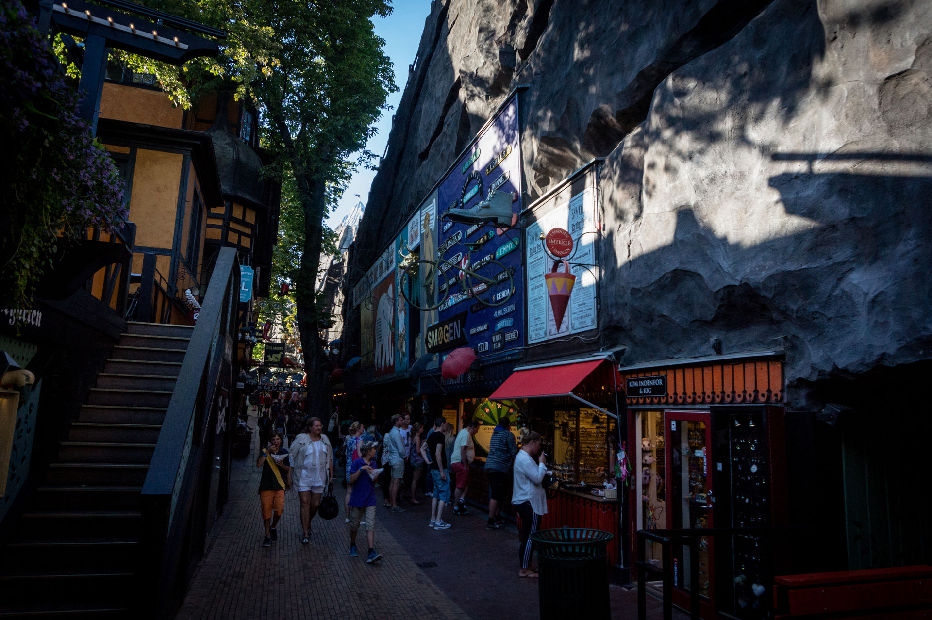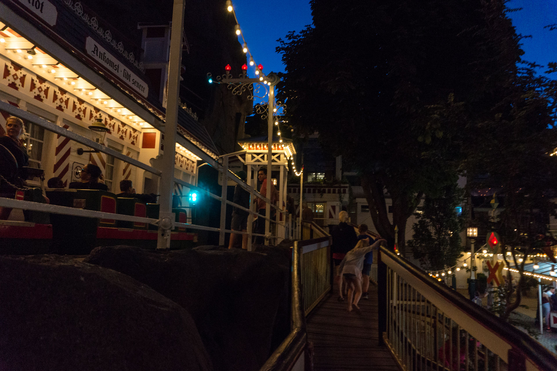 Endlich am Bahnhof angekommen zeigte sich dann sogleich die Belohnung für die Strapazen des Vormittags, weswegen sogleich das bereits im Voraus bezahlte All-Inklusive Ticket gegen den Eintritt, das Wristband für unlimitierte Fahrten auf den Fahrgeschäften, sowie die Gutscheine für einen Besuch im hauseigenen Aquarium, die Mahlzeit und das Fahrtfoto eingetauscht wurde. Dieses Paket kostete online rund 190 DKK mehr als der reguläre Eintritt und das Wristband, da aber bereits die Verpflegung in dieser Stadt im Allgemeinen in einer ähnlichen Preisliga liegt ist dieses durchaus zu empfehlen. Dabei variiert das Angebot an der allgemeinen Preisstruktur der Restaurants, so bekommt man in günstigen Restaurants zusätzlich ein großes Getränk, in mittelpreisigen Restaurants ein kleines Getränk, sowie in hochpreisigen Restaurants nur noch die Mahlzeit geliefert. Ohne den Gutschein hätte ich hier bereits 210 DKK ausgegeben hinzukommen die 25 DKK die man sich beim Aquarium spart, sowie der Wert des Fahrtfotos.