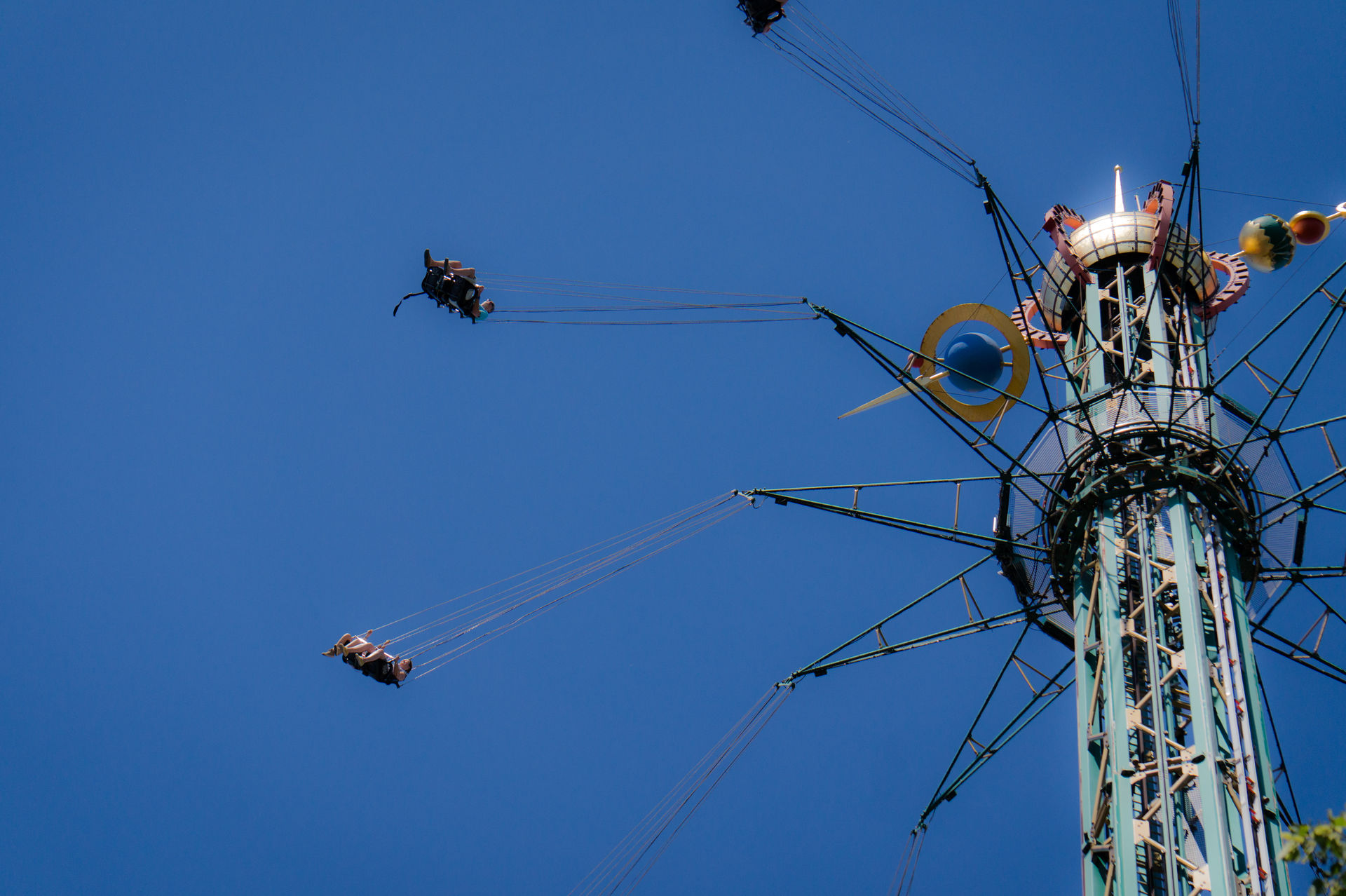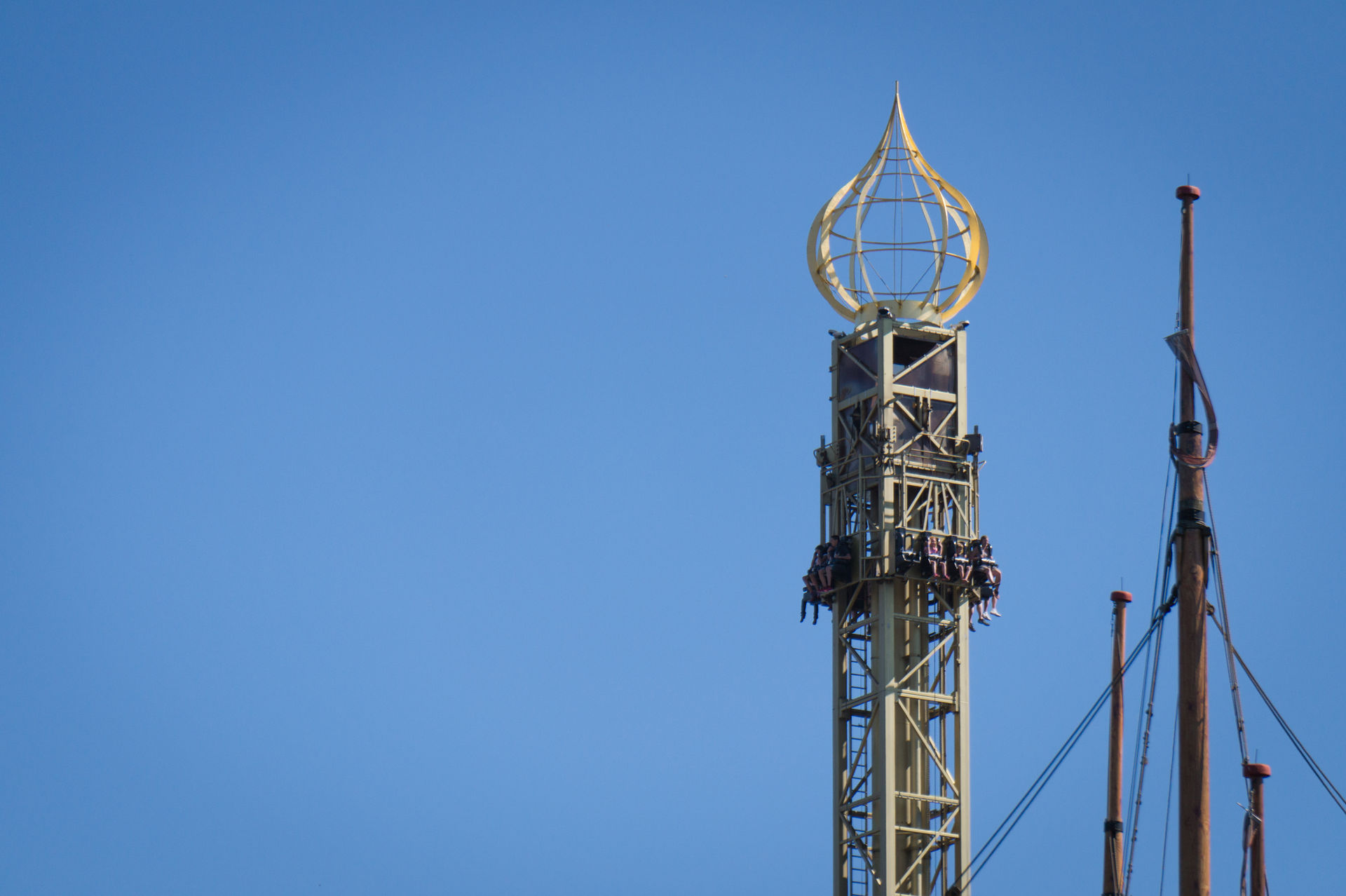 Oberhalb des schnieken und überraschend rasant fahrenden Break Dance Snurretoppen befindet sich der 80m hohe Starflyer Himmelskibet. Hier merkt man zum ersten Mal, dass der Park seinen ausländischen Besucher ohne Freizeitparkerfahrungen nicht sonderlich viel zutraut, wodurch sich leider auch die Abfertigung ein wenig in die Länge zieht, trotz bereits optimierten Beladungsvorgang. Auf dem Weg hinauf zur Beladungsstation wird man im Grunde bei jedem Meter erinnert was man so alles nicht mitnehmen darf, dann wird eine abgezählte Meute in den Bereich mit der Gepäckablage gelassen, dort gibt es dann eine sehr ausführliche mündliche Einweisung was man so alles nicht mitnehmen darf, danach öffnet man nur eine der möglichen Zugangswege und zwingt die Fahrwilligen nun auf die Hosentaschen zu klopfen und verwarnt nun die Leute bei positiven Befund zurück zu gehen und endlich ihre Sachen aus den Taschen zu nehmen. Nach einer recht ordentlichen Fahrt mit einem zugleich fantastischen Blick über der Stadt wird man nun in einem abgetrennten Bereich auf der anderen Seite gelassen und das solange bis wirklich jeder auch seine Sachen wieder entgegengenommen hat, erst dann wird man entlassen.