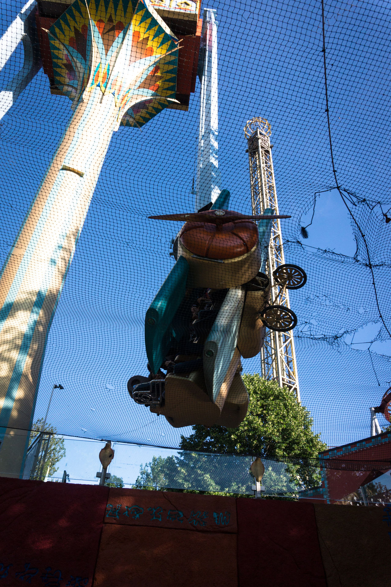 Die interessanteste Anlage in diesem Bereich ist aber mit großen Abstand Vertigo, ein Flying Fury aus dem Hause Technical Park. In den Anfangsjahren dieser Anlage konnte man hier nach Belieben den Fahrgastträger um die eigene Achse, wie auch die Achse des Hauptarms drehen, wodurch eine ziemlich wilde und individuelle Fahrweise entstanden ist, auch bestand die Möglichkeit einmal wirklich volle Pulle zu geben und somit eine gewisse Zeit lang schlappe 5G, also die fünffache Erdbeschleunigung, auf sich wirken zu lassen. Da die Technik zur eigenen Steuerung aber leider wohl fehleranfällig ist, was ich jedoch sehr bezweifle und die Schuld eher an die zu zahme Fahrweise der Fahrgäste schieben würde, bestehen heutzutage noch zwei Automatikprogramme, welche sich bis auf ein kleines, aber feines, Detail kaum unterscheiden.