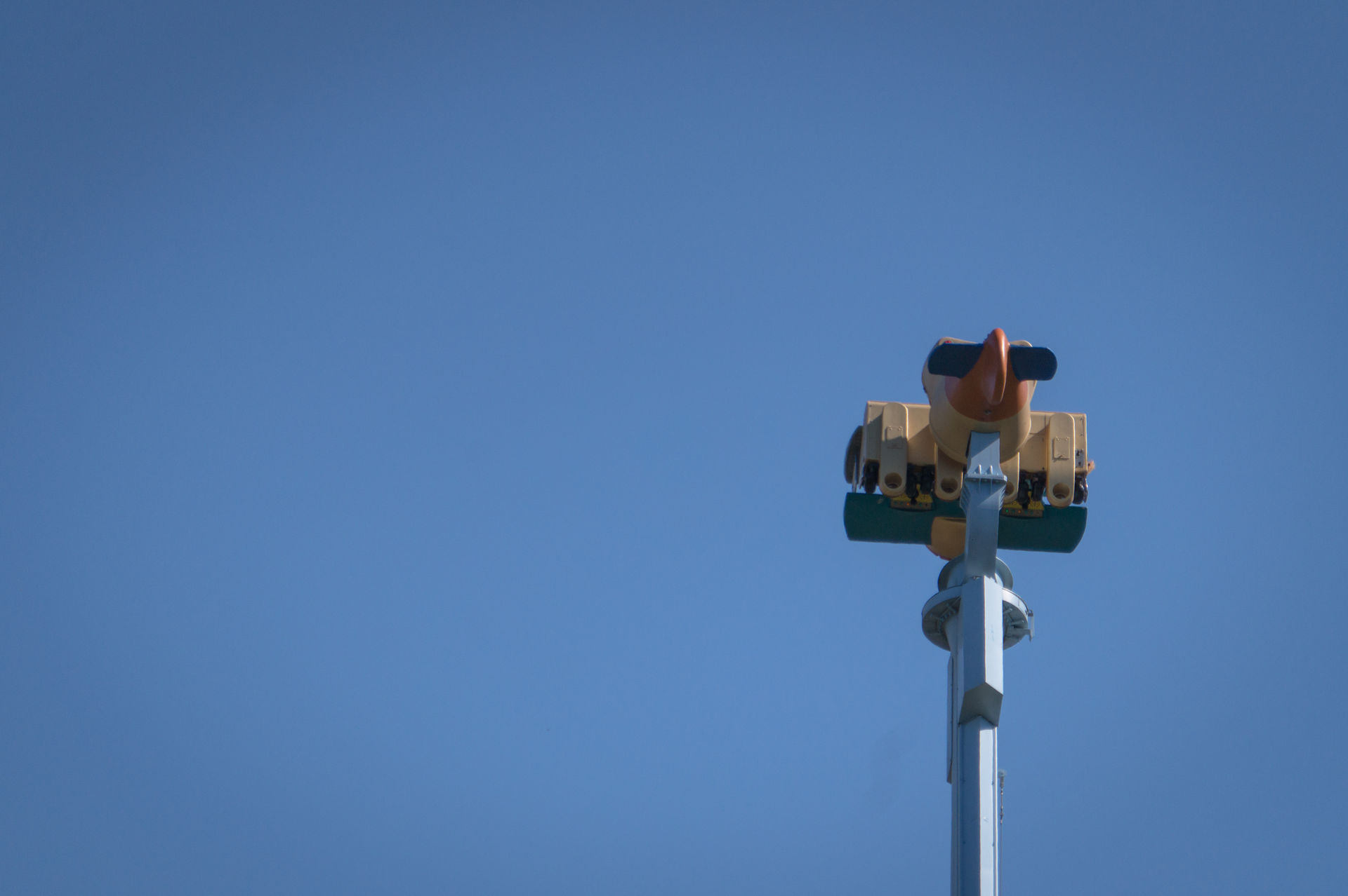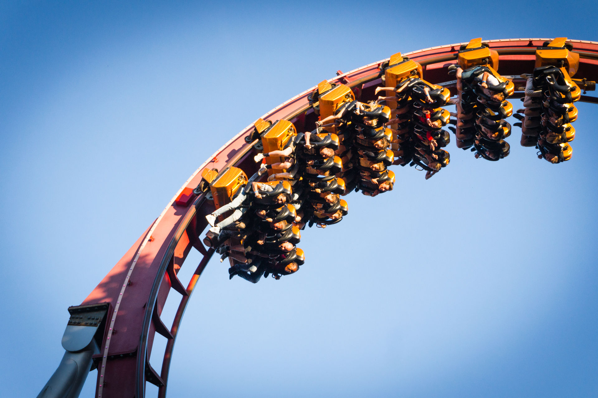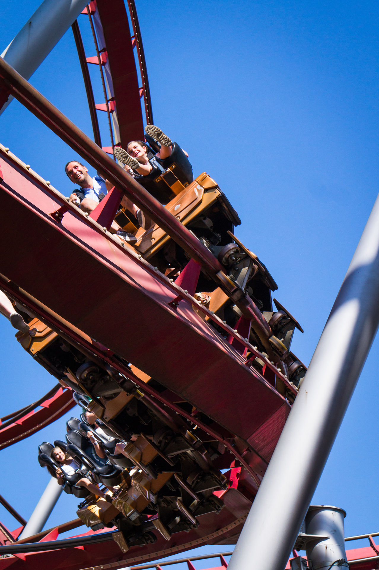 Dabei beginnt die Fahrt mit einigen Überschlägen im Stationsbereich bei gleichzeitiger Drehung um die vertikale Achse, ehe das Spiel in luftiger Höhe fortgesetzt wird. Dabei geht es natürlich auch Überkopf durch die Station hindurch ehe die Gondel arretiert wird und die Maschine auf gut 120 km/h beschleunigt. Über einen gewissen Zeitraum verspürt man nun dauerhaft 5G, wobei sich das Sichtfeld langsam aber sicher immer weiter einengt. Hier zeigt sich dann auch der einzige Unterschied der Fahrprogramme zueinander, denn diese Passage vollzieht man entweder konsequent nach vorne blickend oder rückwärtsfliegend. Nach einigen, beinahe schon unzähligen Runden, wird die Geschwindigkeit langsam reduziert und schon steht man erneut seitlich überkopf. Nun vollzieht das kleine Flugzeug seine letzten Überschläge und nähert sich dann langsam, oftmals mit einem längeren Kopfstand an höchster Stelle verbunden, seiner Parkposition.