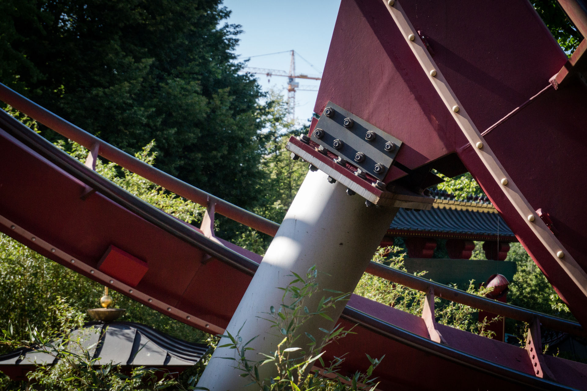 Da ich den eher minder frequentierten Eingang am Hauptbahnhof nutzte führten mich die Wege schnell und unmittelbar direkt zur bereits über 100 Jahre alten Holzachterbahn Rutschebanen und somit zur dienstältesten Achterbahn Europas. Zum Jubiläum spendierte man der alten Dame dann eine aufwändige Schönheitsoperation, so dass sie im Zuge dessen wieder an ihre Ursprungsgestaltung erinnern sollte, welche man aus Respekt vor ankommenden Gästen aus den Alpenländern zuvor umgestaltet hatte, da diese nach Verlassen des Bahnhofs durch die Gipfel der Rutschebanen nicht sofort an ihre Heimat erinnert werden sollten. Wie im Allgemeinen bei den sogenannten Scenic Railways üblich weist auch die Rutschebanen einen im Zug mitfahrenden Bremser auf, wodurch die Fahrt durch dessen Knowhow gesteuert wird und zugleich ziemlich aufregend werden kann.