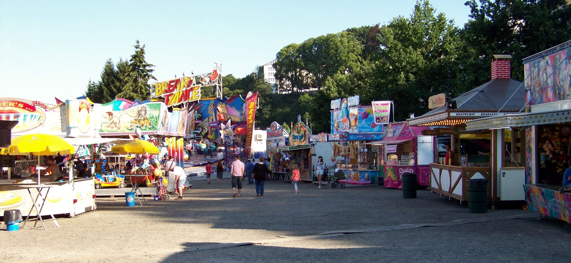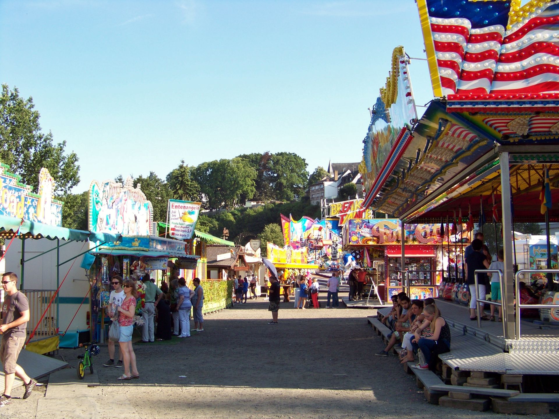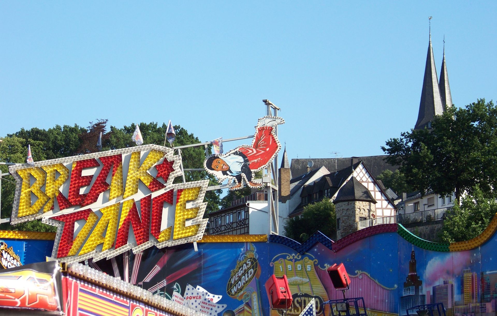 Der nächste Stopp nach Ratingen war die Kirmes in Montabaur (fehlt ebenfalls noch in der Datenbank). Die Veranstaltung findet recht kompakt und offen gestaltet auf einem Platz unterhalb der Altstadt statt, auf dem man den Rainbow von Klinkerfuß, den Break Dance von Klinge (mit sehr schicken neuen SAD-Gondelkreuzen ausgestattet), den Allround von Kromin (ein weiterer Bewerber um den Titel langsamster Twister bzw. twister-artiges Geschäft in Deutschland neben Krauses Flying Star), Autoscooter von Meyer, 5D-Kino und das Kinderlaufgeschäft Wild Kids antreffen konnte.