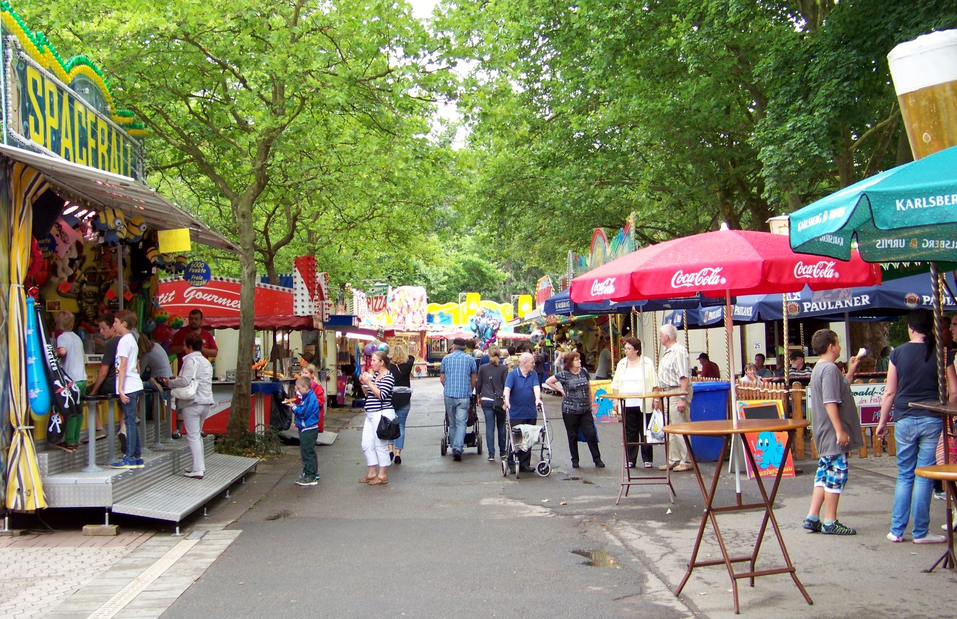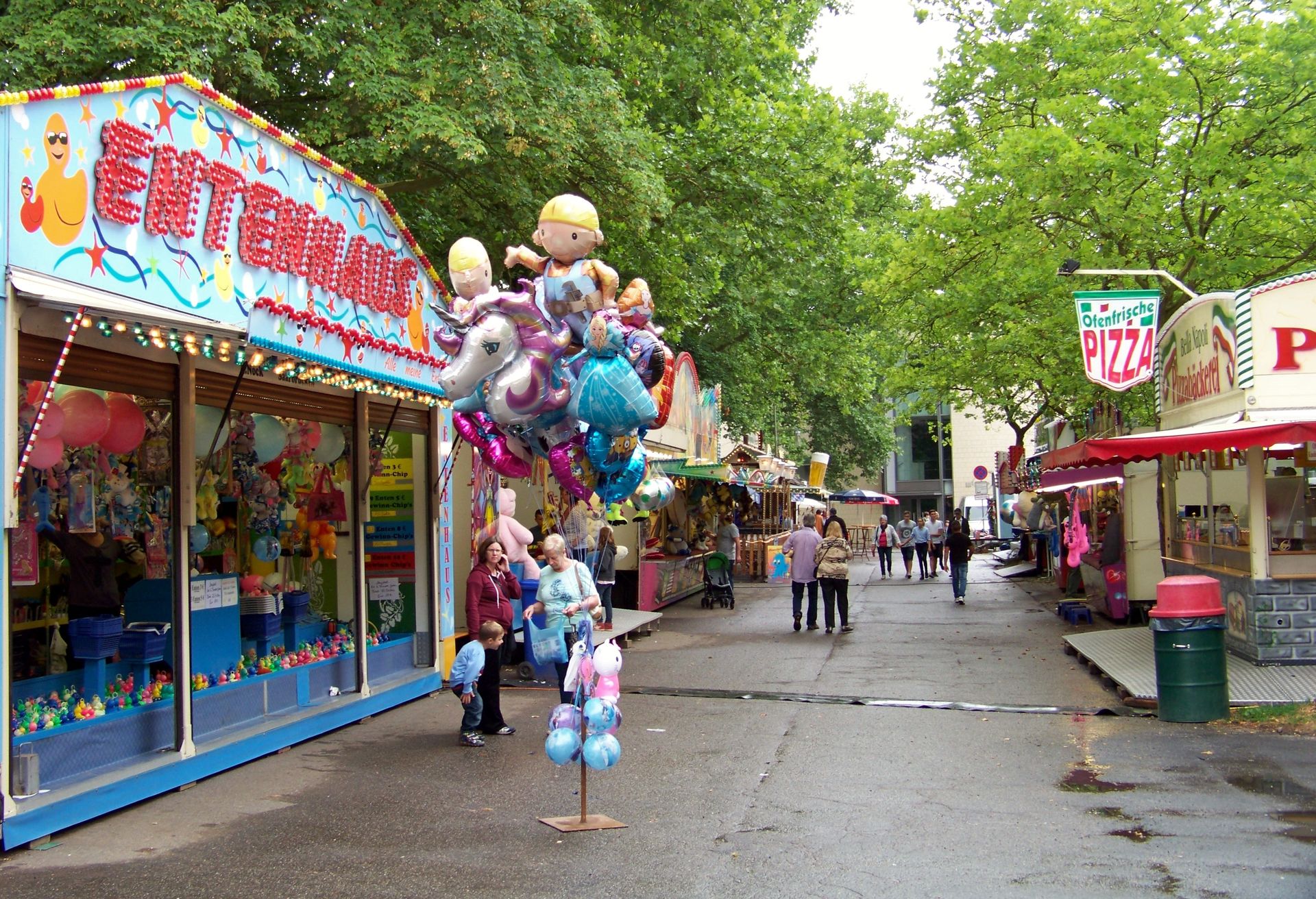 Da es dann glücklicherweise nicht mehr lange gedauert hatte, bis der Regen endlich aufhörte, konnte ich mich nun der mittlerweile komplett geöffneten Kirmes zuwenden. Betritt man das Kirmesgelände von der Burg Kerpen aus, muss man sich entscheiden, ob man gerade aus in die Krammarktsreihe, links in die Reihe mit den Essens- und Spielgeschäften oder nach rechts auf den eigentlichen Kirmesplatz mit den Fahrgeschäften geht.