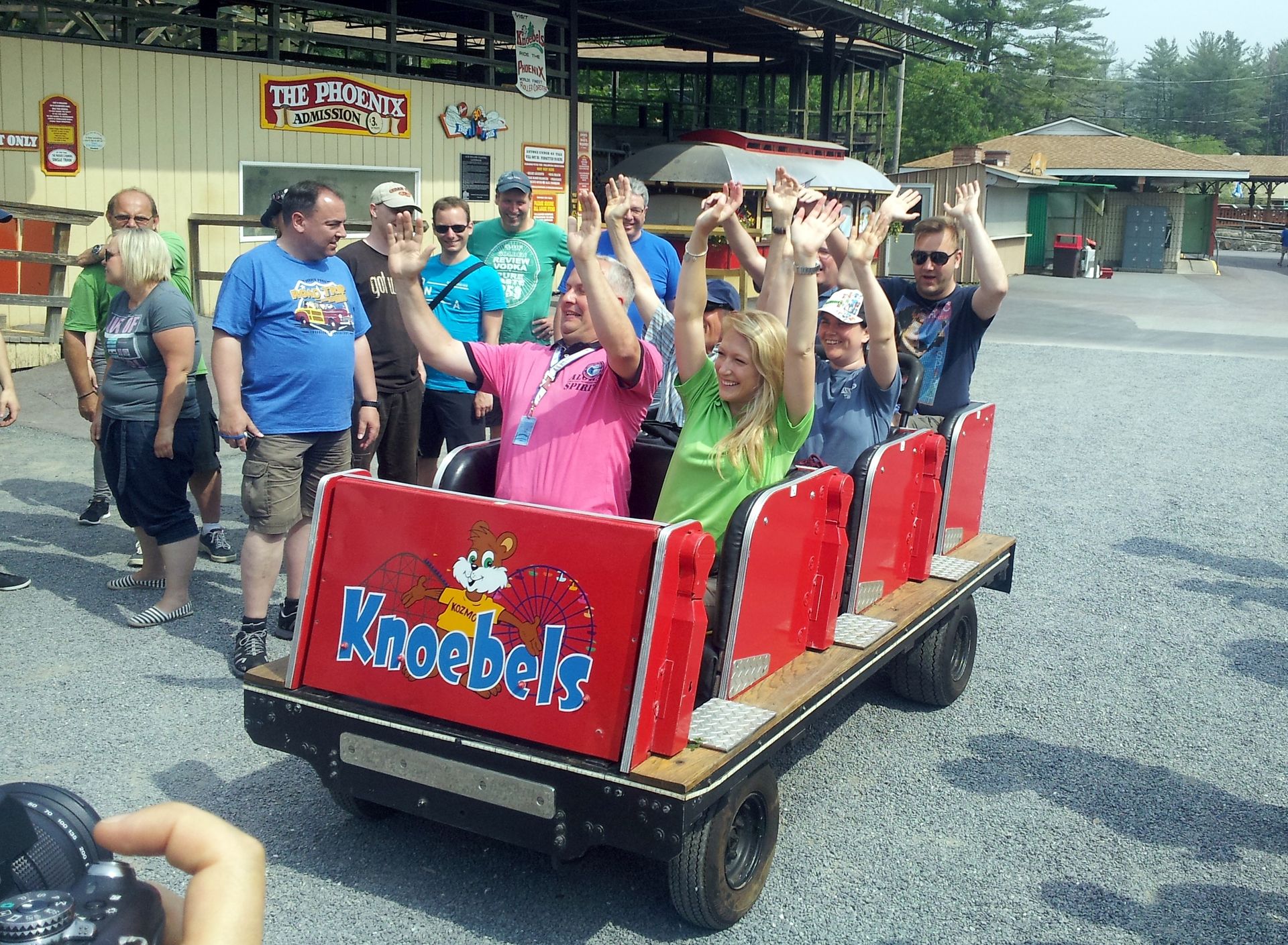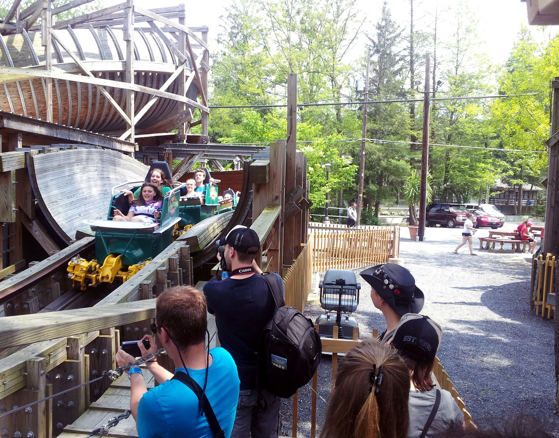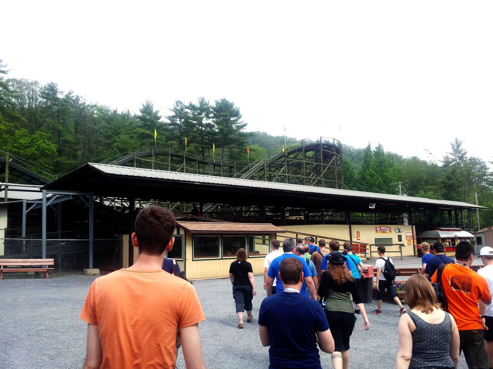 Schon gegen halb zehn in der Früh erreichten wir den Parkplatz und wurden mit dem Bus quasi in die hinterste Ecke desselben geführt. Bald darauf wurden wir auch hier wieder von Mitarbeitern des Parks in Empfang genommen und bekamen diverse Zettelchen in die Hand gedrückt. Neben dem Parkplan einen Zettel, den wir später gegen das Wristband tauschen mussten, einen für das auch hier inkludierte Mittagessen und ein Ticket für die normalerweise extra kostende Geisterbahn legte man auch noch obendrauf. Dennoch war Knoebels laut Dirk einer der teuersten Parks der Tour.