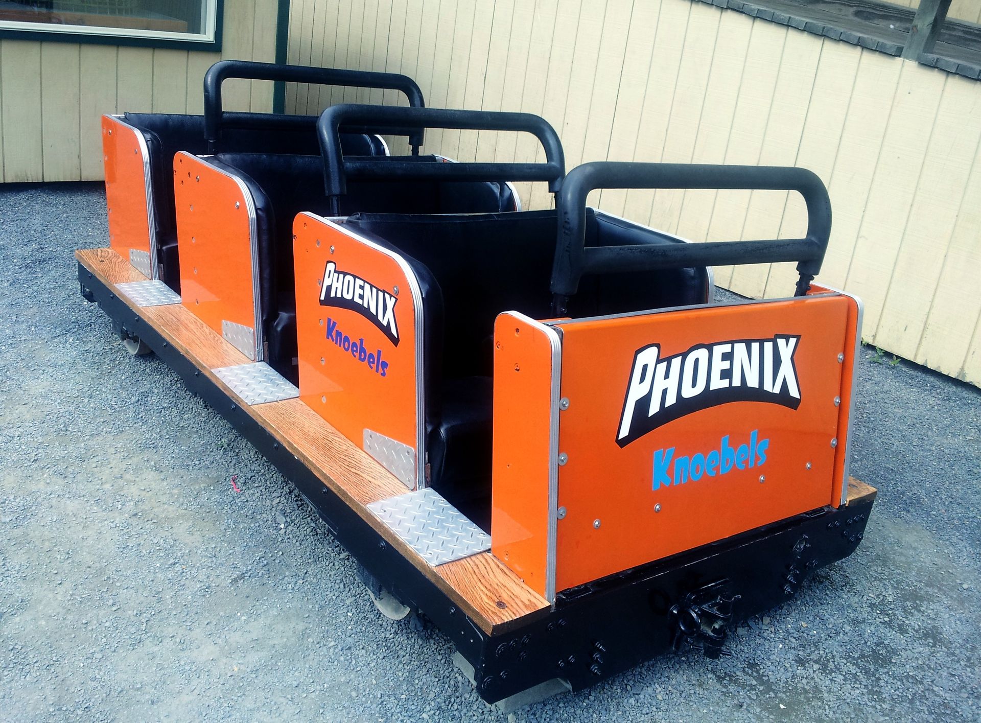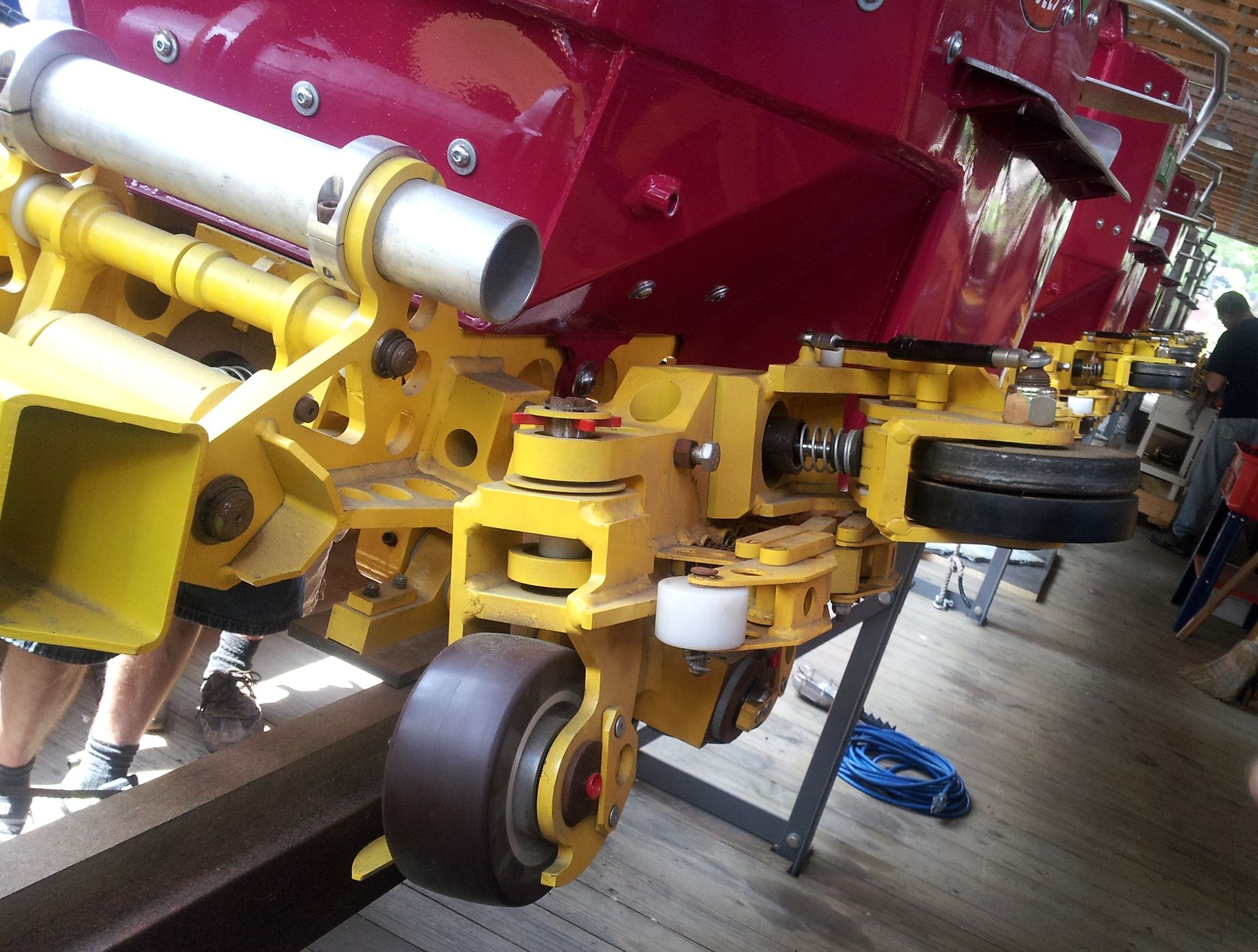 Nicht erst seit dem Vorfall auf dem New Texas Giant sind zusätzliche Gurte auf vielen Bahnen zu finden. In erster Linie verzögern die aber nur die Abfertigung. Aber Knoebels hat sich die Vorschriften ganz genau angesehen... und keine Passage gefunden, die besagt, dass dieser Gurt über dem Sitz verlaufen muss. Also hat man sie pflichtgemäß eingebaut, lässt sie aber unter der Sitzfläche verlaufen. Zur Sicherung der Fahrgäste verbleibt damit einzig und alleine der Klappbügel in Brusthöhe.