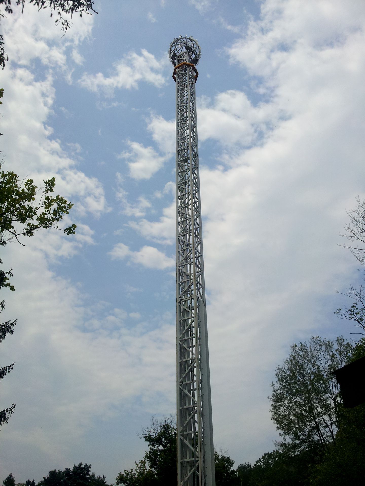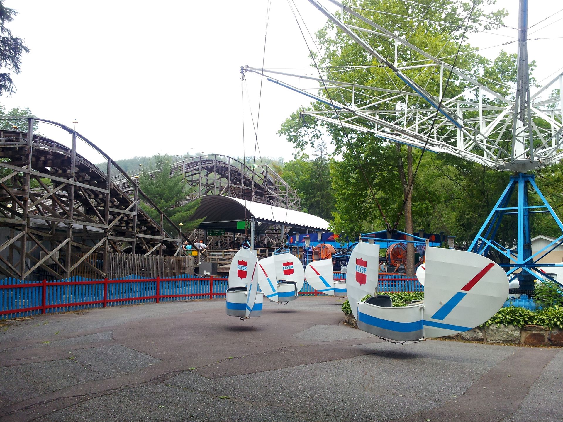 Aber natürlich nicht so ein modernes Standard-Ding von Larson, wie sie in den letzten Jahren in vielen Cedar Fair (und anderen) Parks gebaut wurden. Nein, dieser Flyer sieht eher aus wie eine Eigenproduktion. Und das liegt nicht zuletzt am vermeintlichen Trecker-Motor, der das Ding antreibt. Tatsächlich wurde die Anlage aber vom originalen Hersteller Bisch-Rocco gebaut (sagt zumindest Wikipedia), nur das "Wann" ist leider nicht bekannt. Es handelt sich aber wohl immerhin um einen der am schnellsten drehenden Flyer. Und man kann in der Tat sehr weit ausschwingen. Ich sah mich schon mehrfach in einem der danebenstehenden Bäume hängen, aber der Abstand reichte letztlich doch immer aus.