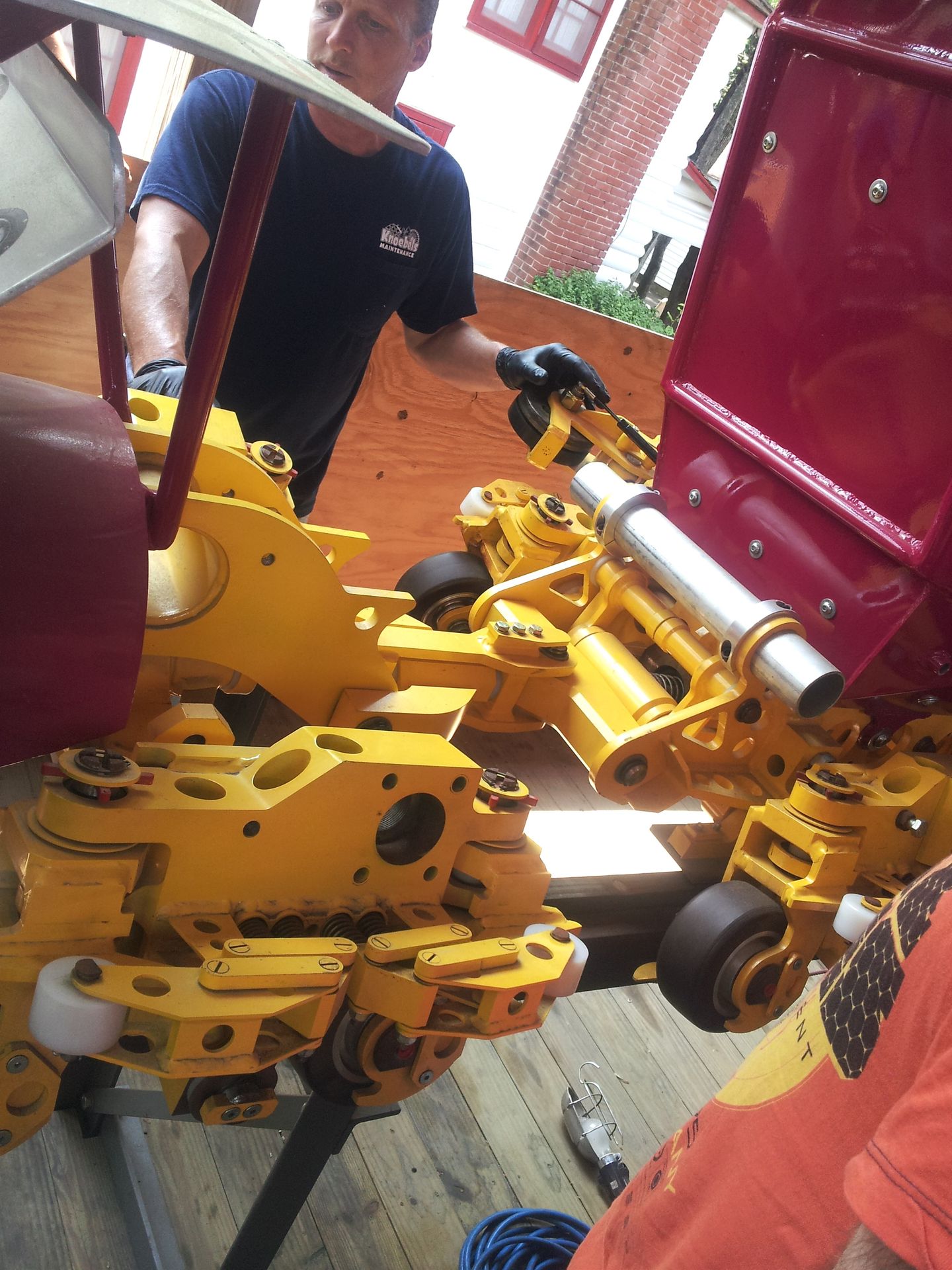 Das Karussell beginnt sich zu drehen, die Arme breiten sich aus. Irgendwann werden die Arme dann von der Hydraulik nach unten gezogen. Dank der Drehimpulserhaltung (Grüße an meinen Physiklehrer