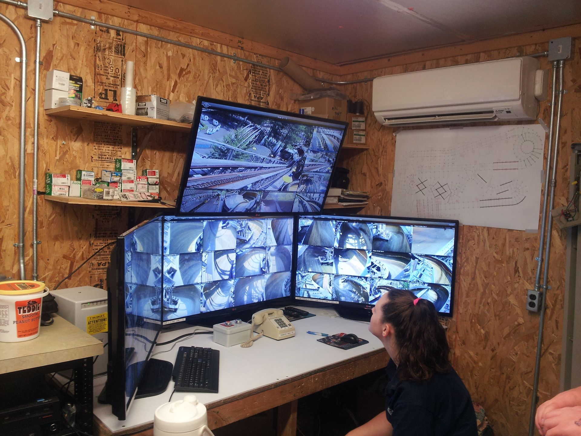 Denn in diesem Häuschen stehen neben den Schaltschränken auch ein paar Monitore...