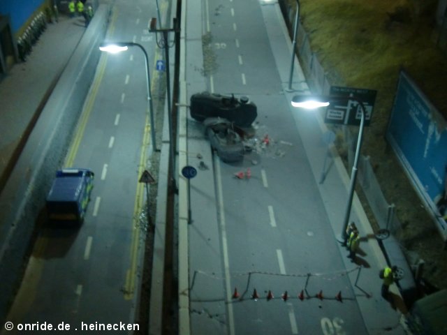 Die Fotos zu sehen ist das eine, hier zu stehen nochmal was anderes. Cinderellas Kutsche, umgestürzt auf dem Dach liegend, sie selbst hängt tot aus dem Fenster. Im Blitzlichgewitter der Fotografen, die mit ihren Rollern eben den Unfall, den sie jetzt ablichten um die Sensationslust der Gesellschaft zu befriedigen. Das ganze wiederum im Blitzlichtgewitter von uns Parkbesuchern. Und es drängt sich der Gedanken auf, dass wir Besucher doch villeicht genauso Sensationslüstern und damit kaum besser sind?