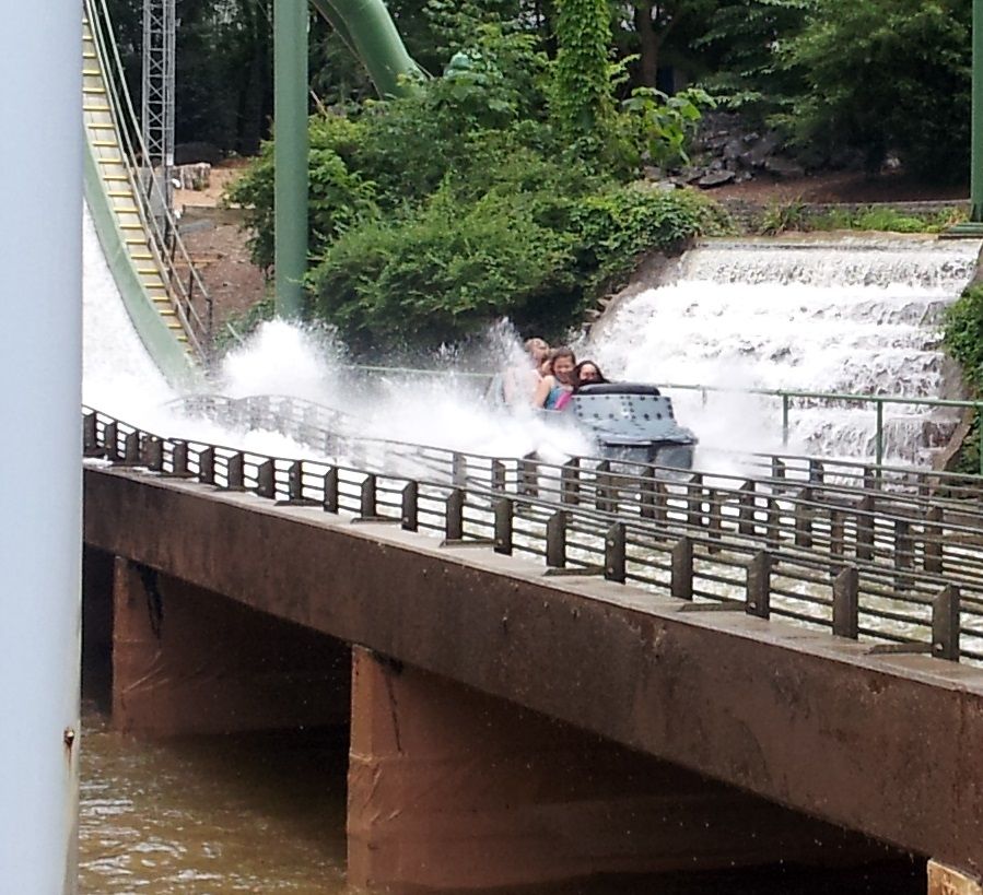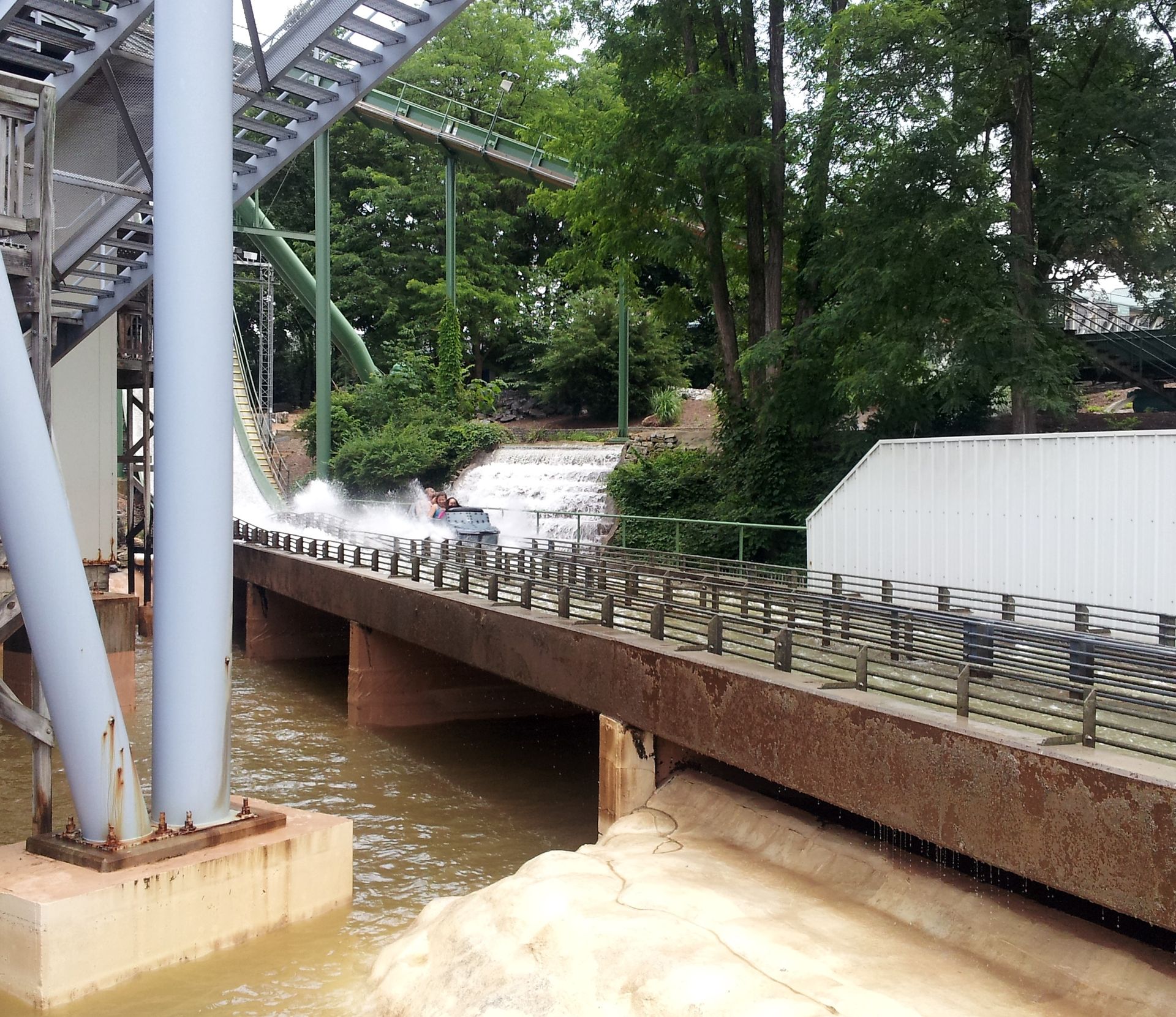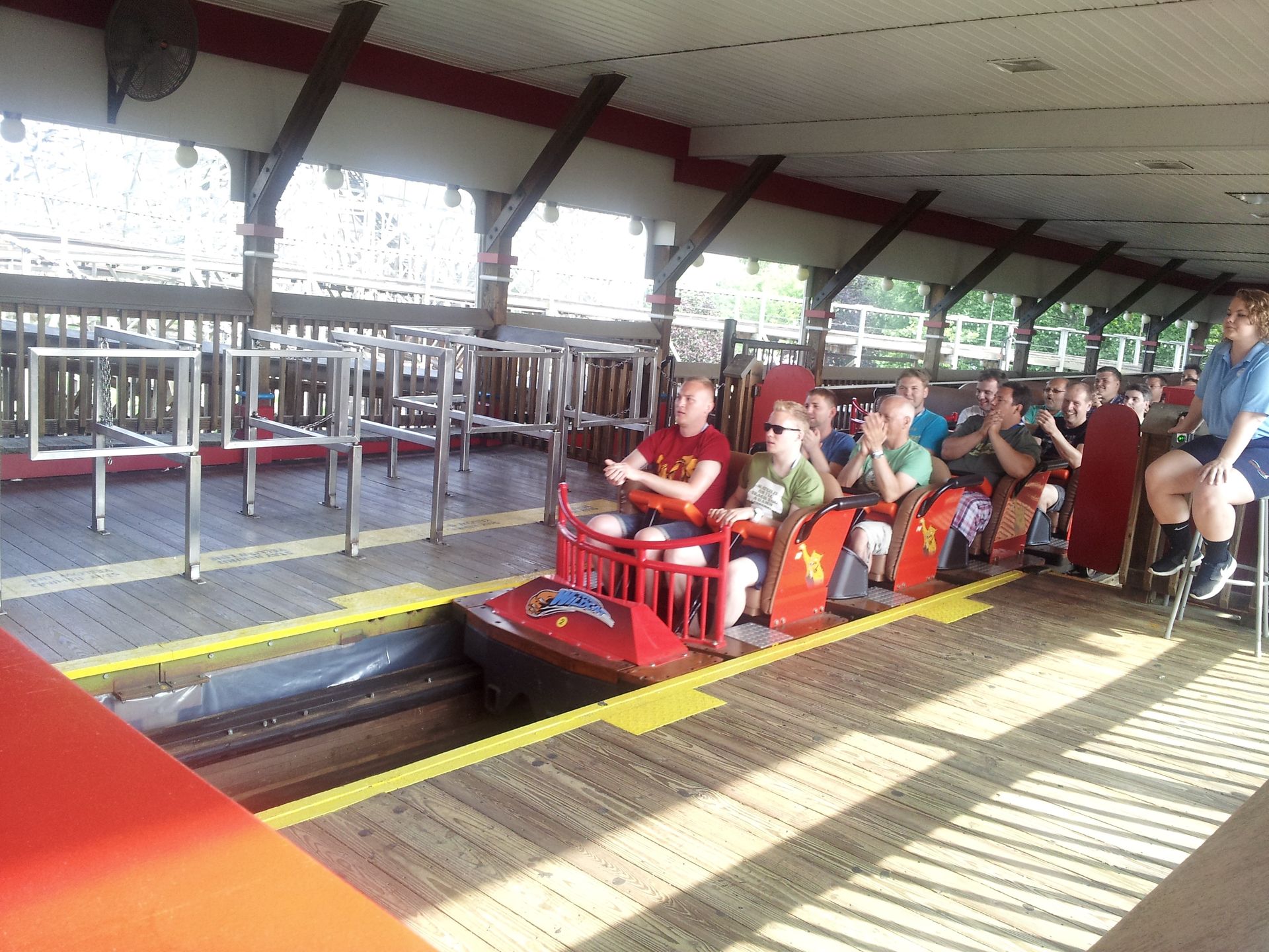 Die wollten wir uns bei Coal Cracker, einer Wildwasserbahn von Arrow aus dem Jahre 1973 holen. Für ein Boot waren wir aber zu viele, sodass bayernkurve und ich alleine in einem separaten Boot fuhren. Wirkliche Abkühlung gab es allerdings nicht, denn auf den ersten Lifthill folgt nur etwas Rumgekurve auf dem Berg. Dann folgt ein zweiter Lift, der die Boote auf die finale Höhe für den einzigen Drop bringt. Aber selbst dort reicht es maximal für ein paar Spritzer, denn Bootswände sind recht hoch und die Boote tauchen auch nicht wirklich tief ein. Im Gegenteil, am Fuße des Drops ist sogar ein Mini-Hügelchen verbaut, an dem man kurz abhebt und dann ein ganzes Stück über das Wasser gleitet.