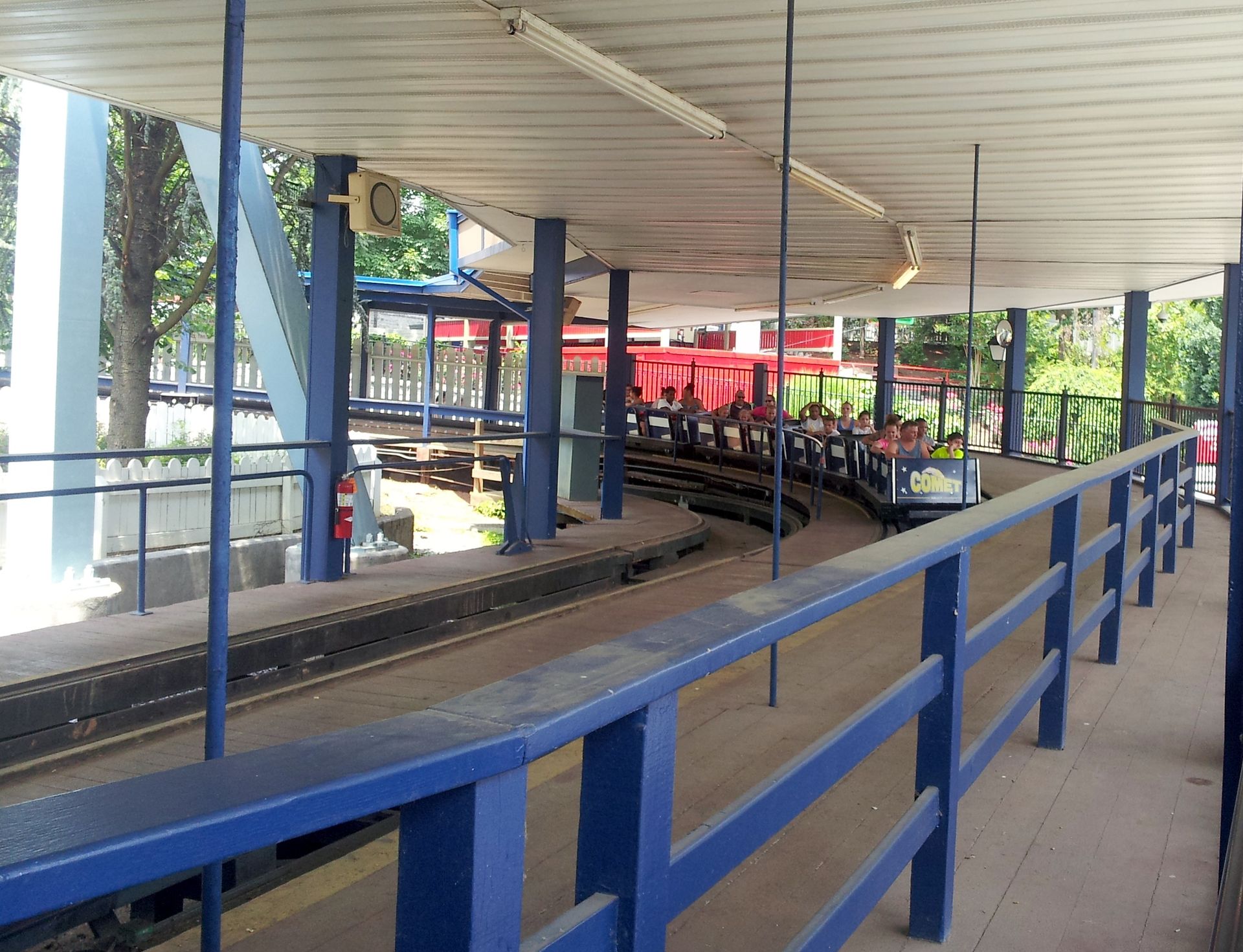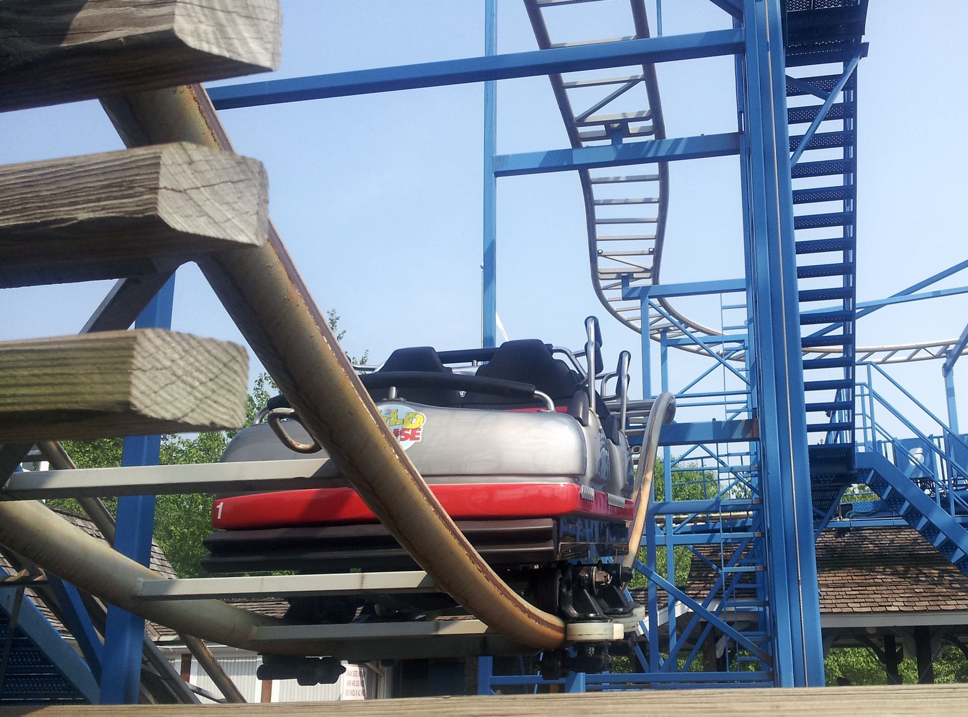 Airtime-Hügel wieder abhebt. Eine bodennahe Kurve bringt die Passagiere wieder auf den Boden der Tatsachen zurück und dann geht es wieder hinauf auf den nächsten Airtimehügel, quer unter dem ersten hindurch. Nach einer weiteren Kurve folgt meine Lieblingsstelle. Denn am Ausgang ist die Kurve fast 90° geneigt und kippt dann nach einer Kuppe schnell in die andere Richtung. Dabei wird man links außen richtig nach unten gerissen. Es folgen noch ein paar Kurven und Umschwünge, ein letzter Airtimehügel und dann fährt man auch schon in die Bremse über Comet ein. Die schon gezeigte Kurve knapp am Stationsdach der Holzachterbahn vorbei führt dann in die eigentliche Schlussbremse.