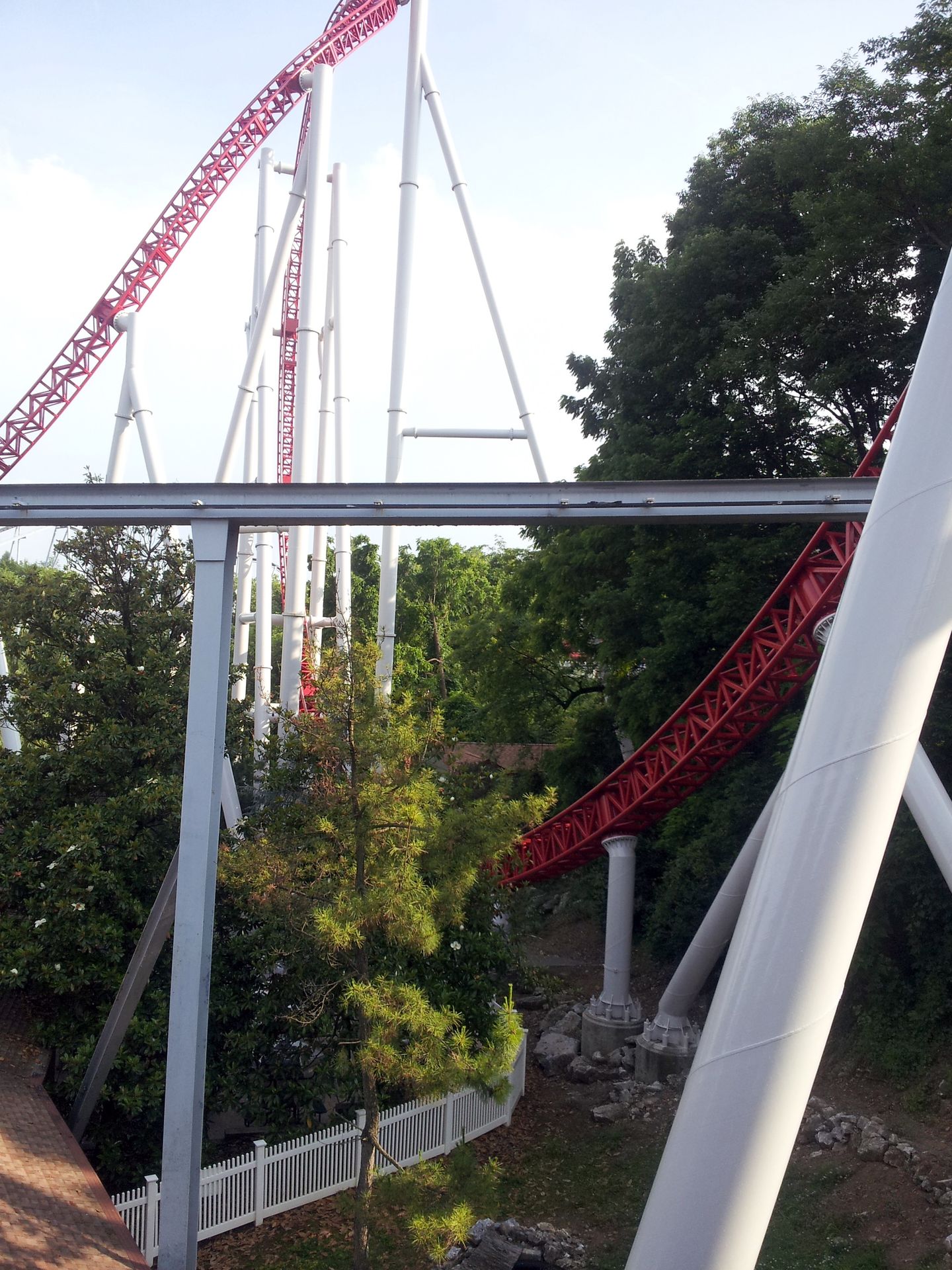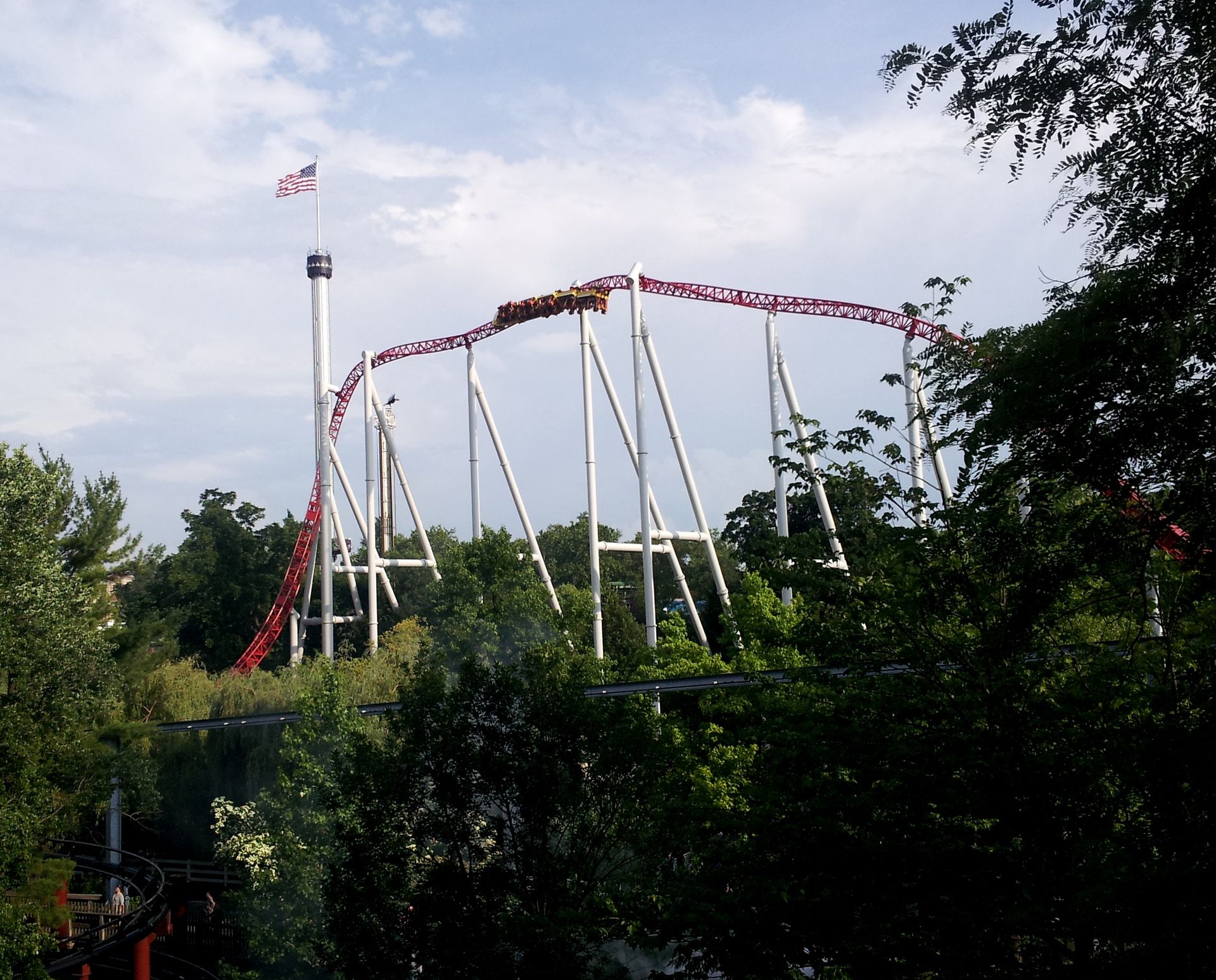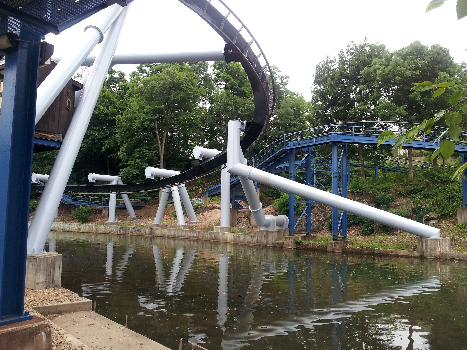 B&M aus dem Jahre 1998. Und die Ingenieure hatten es damals weiß Gott nicht leicht. Denn das Layout musste irgendwie in den eigentlich schon recht vollen Bereich hineingezwängt werden. Hindernisse waren nicht nur die Wildwasserbahn und der SooperDooperLooper, sondern auch diverse Wege und vor allem der Spring Creek. Denn man hatte keine Erlaubnis für Fundamente in eben diesem bekommen. So entstand ein recht ungewöhnliches Layout mit teils sehr skurrilen Stützkonstruktionen.