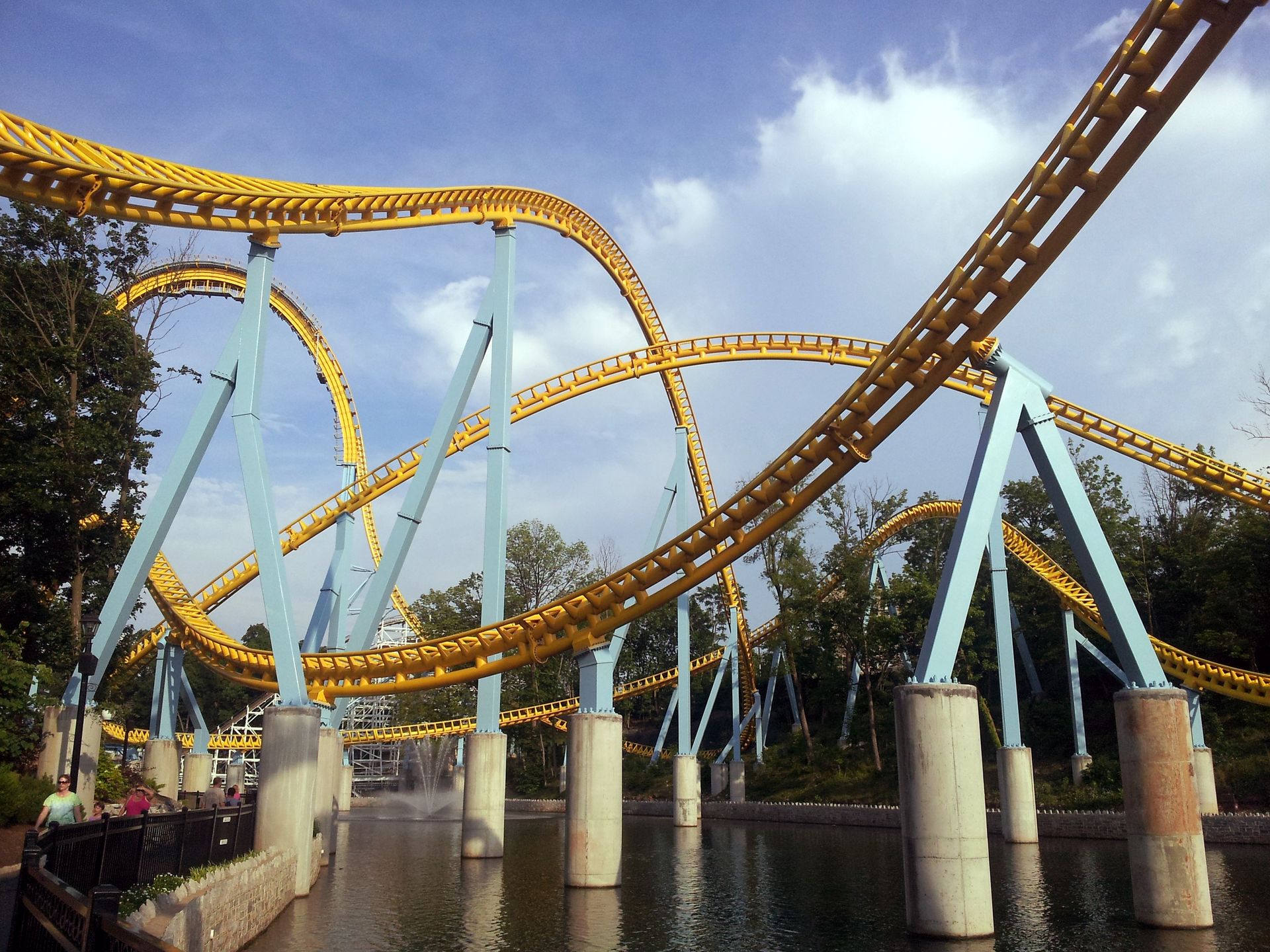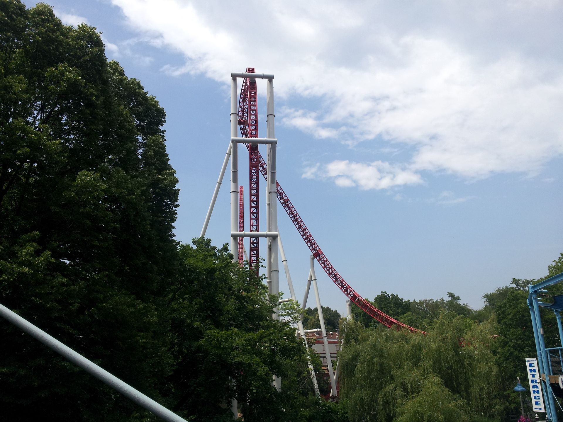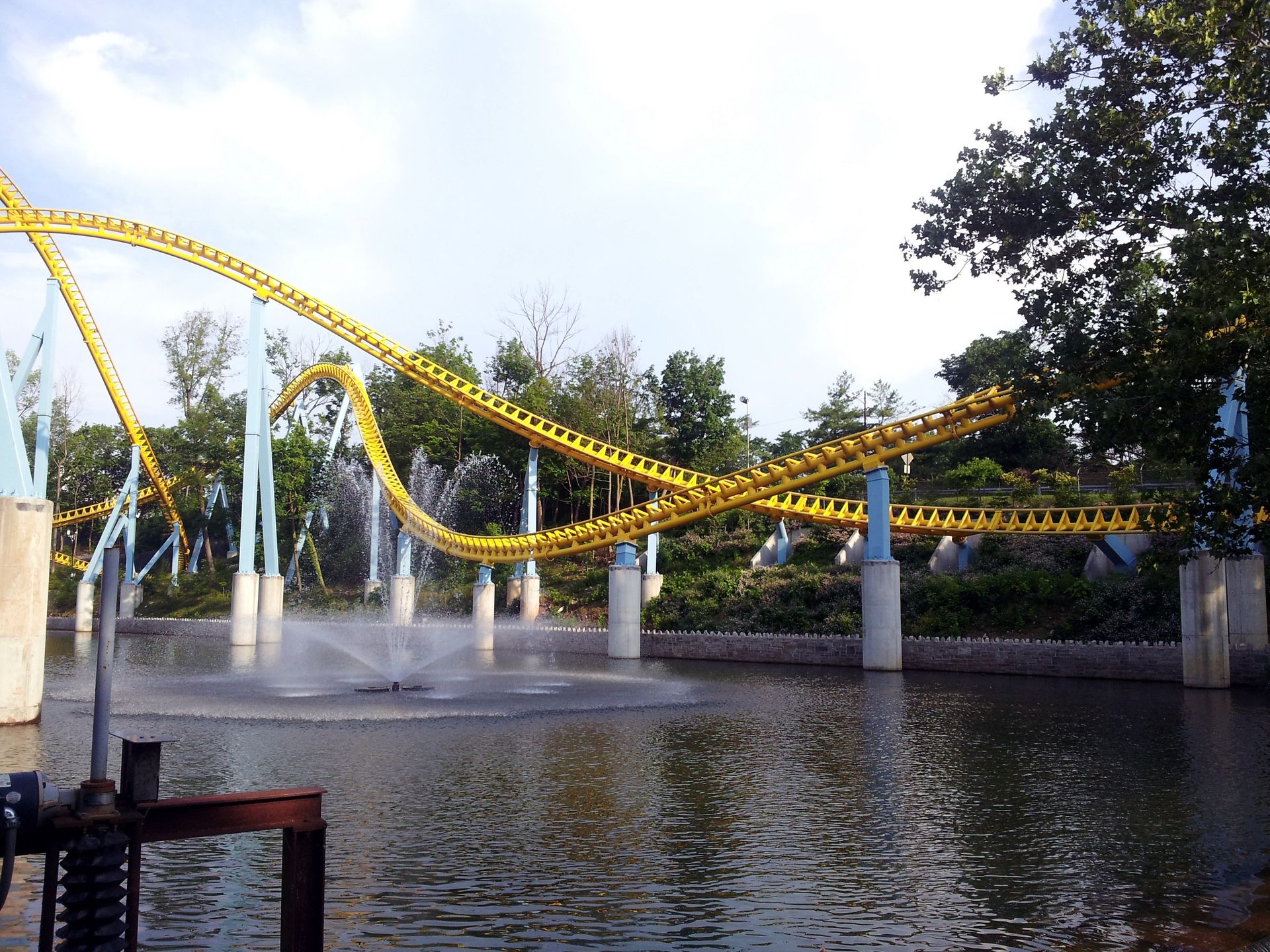 B&M aus dem Jahre 1998. Und die Ingenieure hatten es damals weiß Gott nicht leicht. Denn das Layout musste irgendwie in den eigentlich schon recht vollen Bereich hineingezwängt werden. Hindernisse waren nicht nur die Wildwasserbahn und der SooperDooperLooper, sondern auch diverse Wege und vor allem der Spring Creek. Denn man hatte keine Erlaubnis für Fundamente in eben diesem bekommen. So entstand ein recht ungewöhnliches Layout mit teils sehr skurrilen Stützkonstruktionen.