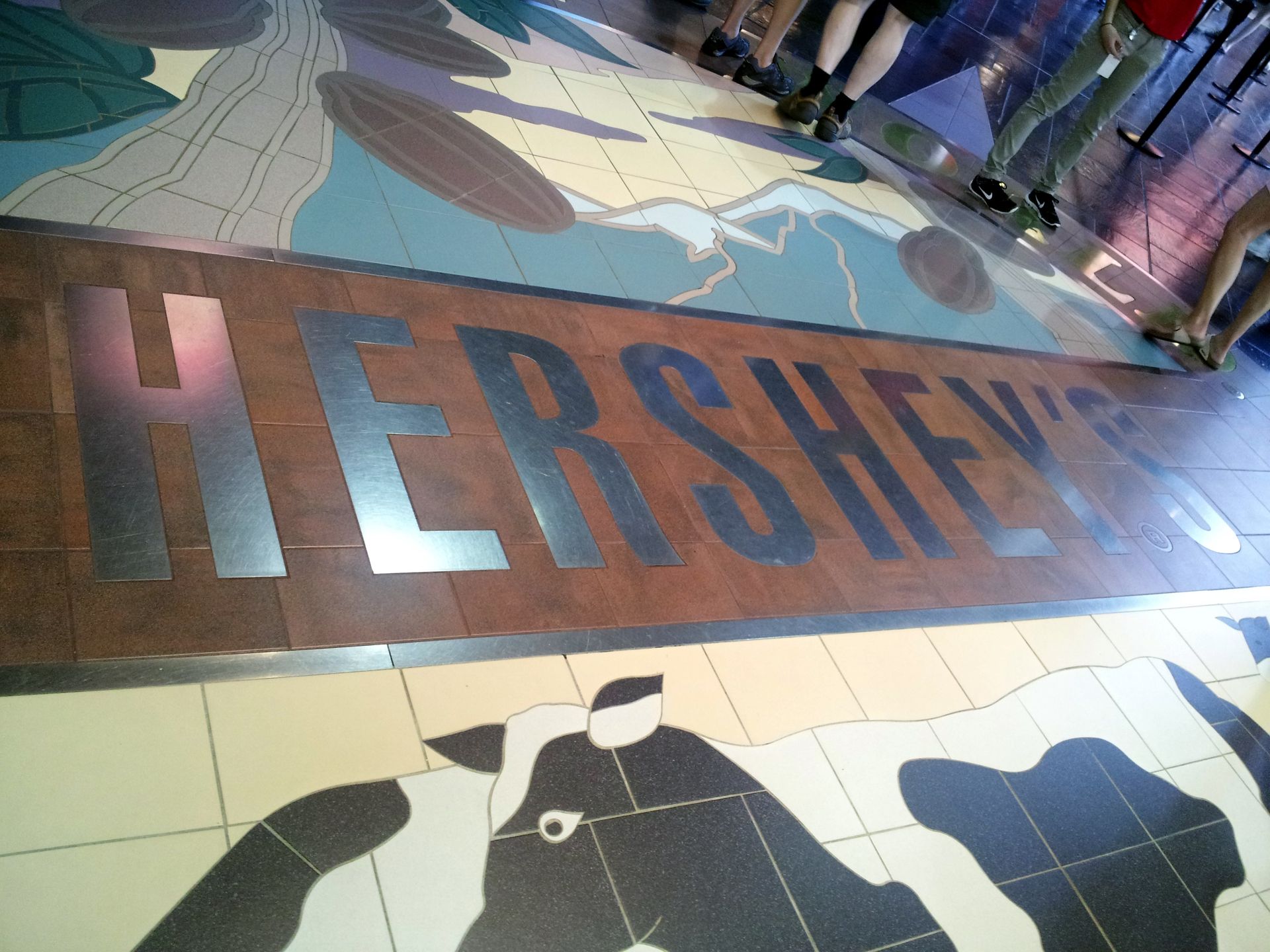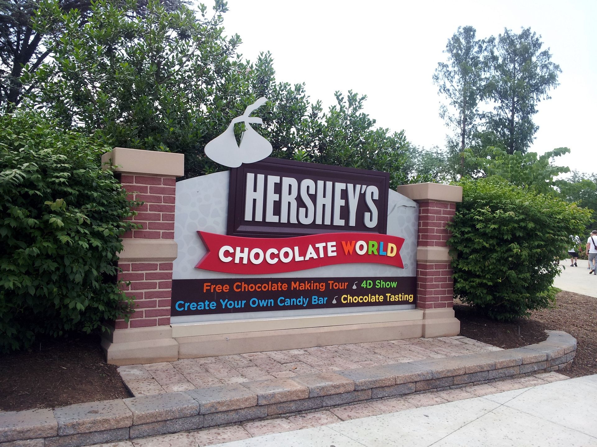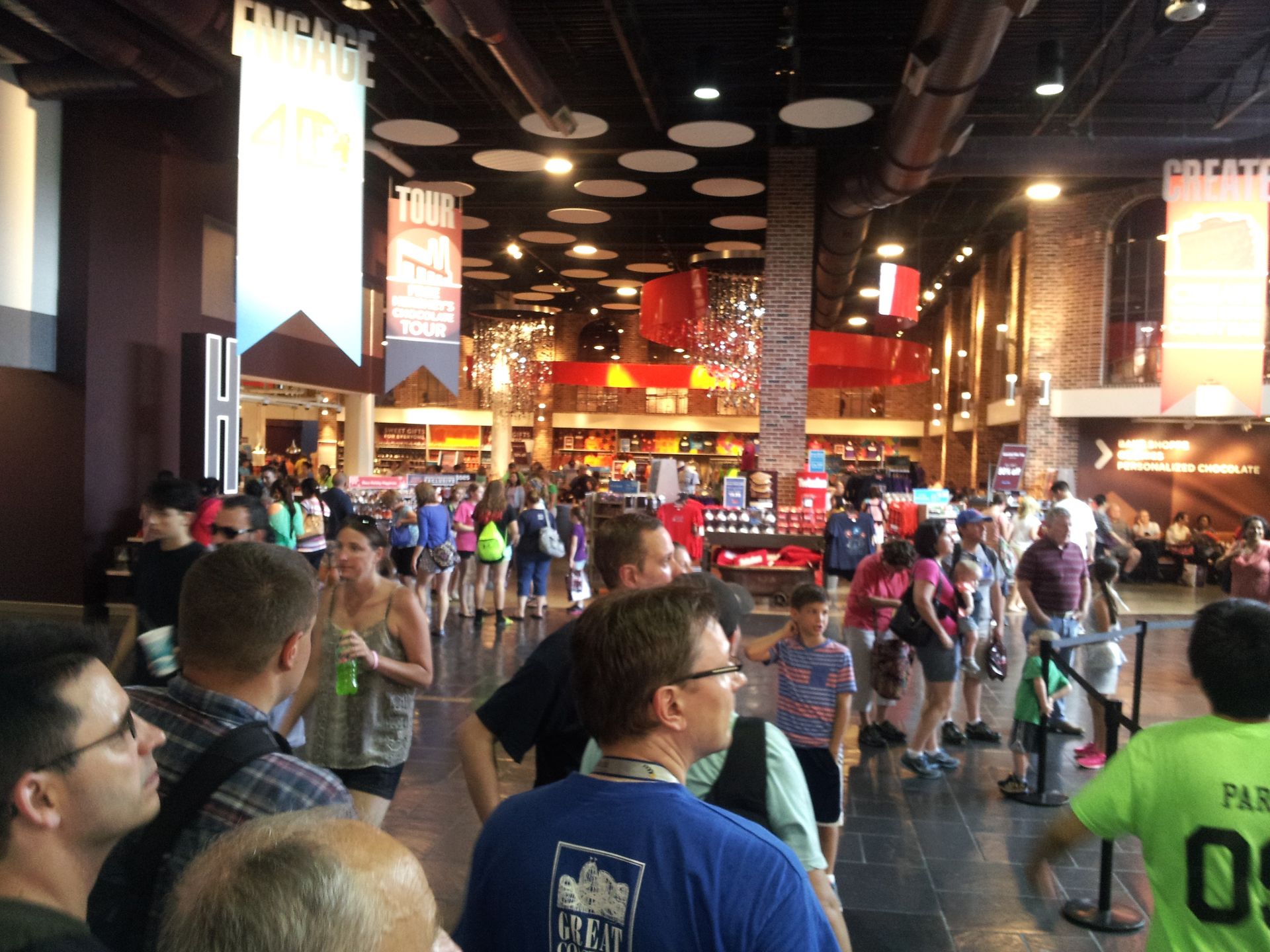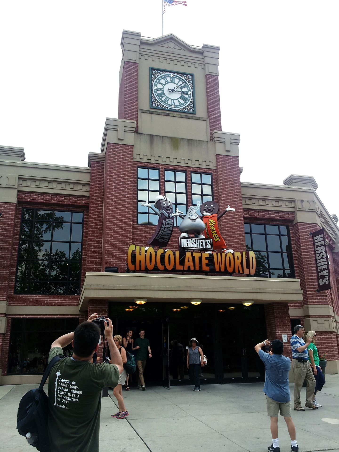 Stattdessen ließen wir uns am Ausgang einen Stempel geben, damit wir später wieder hinein kommen würden. Denn unser nächstes Ziel lag außerhalb des eigentlichen Freizeitparks. Quasi gegenüber des Haupteingangs zum Freizeitpark befindet sich Hershey's Chocolate World. Es handelt sich dabei um eine Art Besucherzentrum, das exzessiv die hauseigene Schokolade bewirbt. Das Gebäude ist also vollgestopft mit Shops und Restaurants, die die nur einige Meter entfernt hergestellten Produkte verkaufen. Dazu gibt es ein paar "Attraktionen", wo man beispielsweise seine eigene Schokolade zusammenstellen kann. Natürlich allesamt kostenpflichtig. Mit Ausnahme der Chocolate-Tour, die jedermann umsonst besuchen kann.