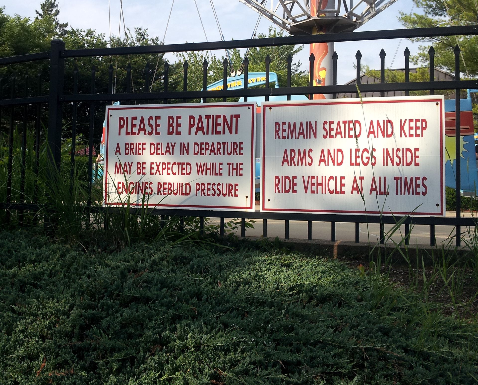 An der Bahn selbst gibt es absolut nichts auszusetzen, das Layout ist top. Immer wieder rast man Seite an Seite mit dem anderen Zug über den Parcours, an anderen Stellen kommen sich die Züge in Duelling-Manier entgegen. Wenn dann natürlich beide Züge mit Achterbahnverrückten auf ERT besetzt sind, kann das der Stimmung eigentlich nur zuträglich sein. Es gab nur einen Haken: Die Ride-Ops waren hier genauso stur wie bei Wildcat. Angesichts des deutlich kürzeren Weges wäre das ja noch halb so schlimm gewesen. Allerdings hatte das Personal wohl nicht die Zeit, auf uns zu warten. So fuhr der Zug zwischenzeitlich schon mit nur wenigen Onridern an Bord los. Da bleibt die Stimmung dann natürlich auf der Strecke.