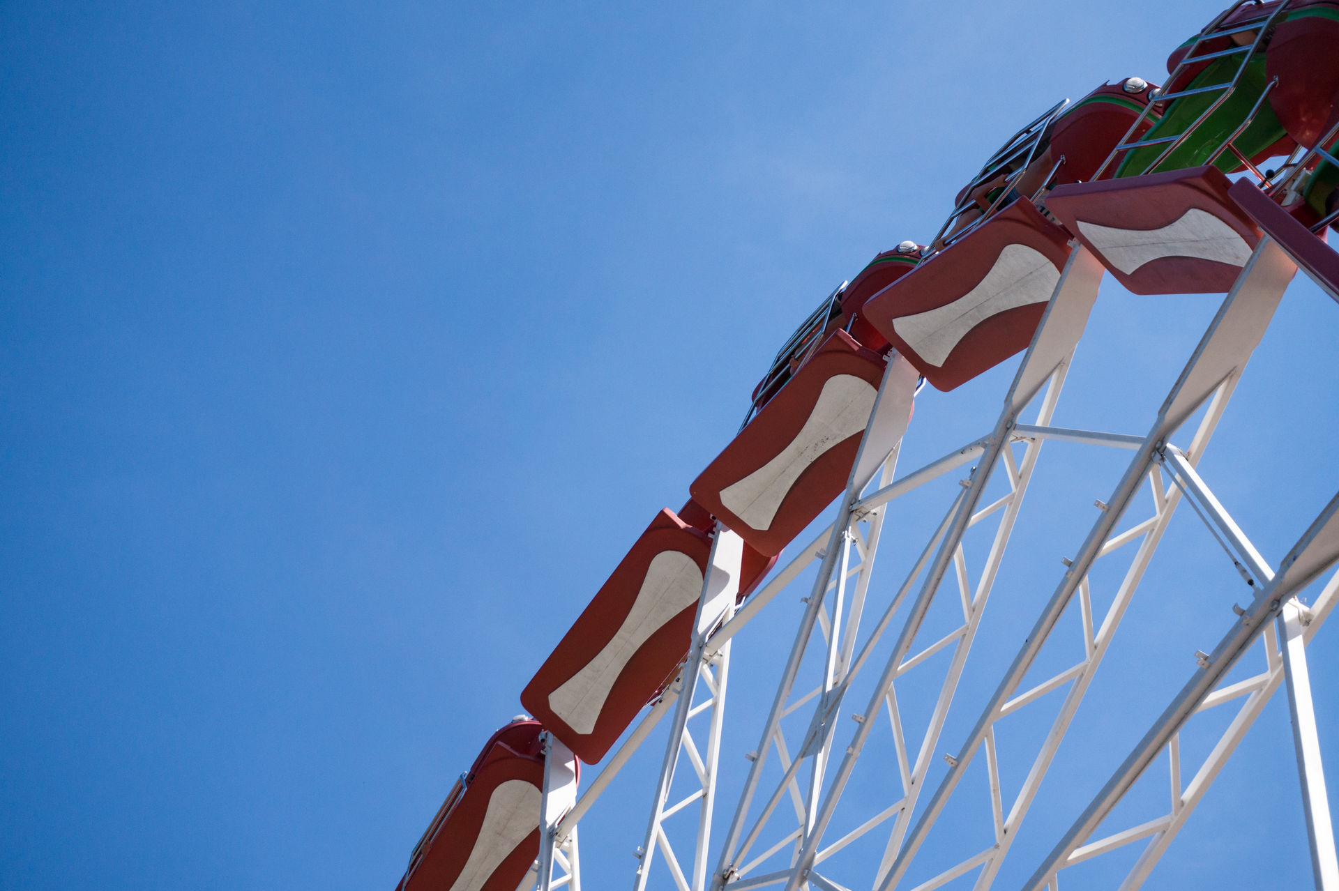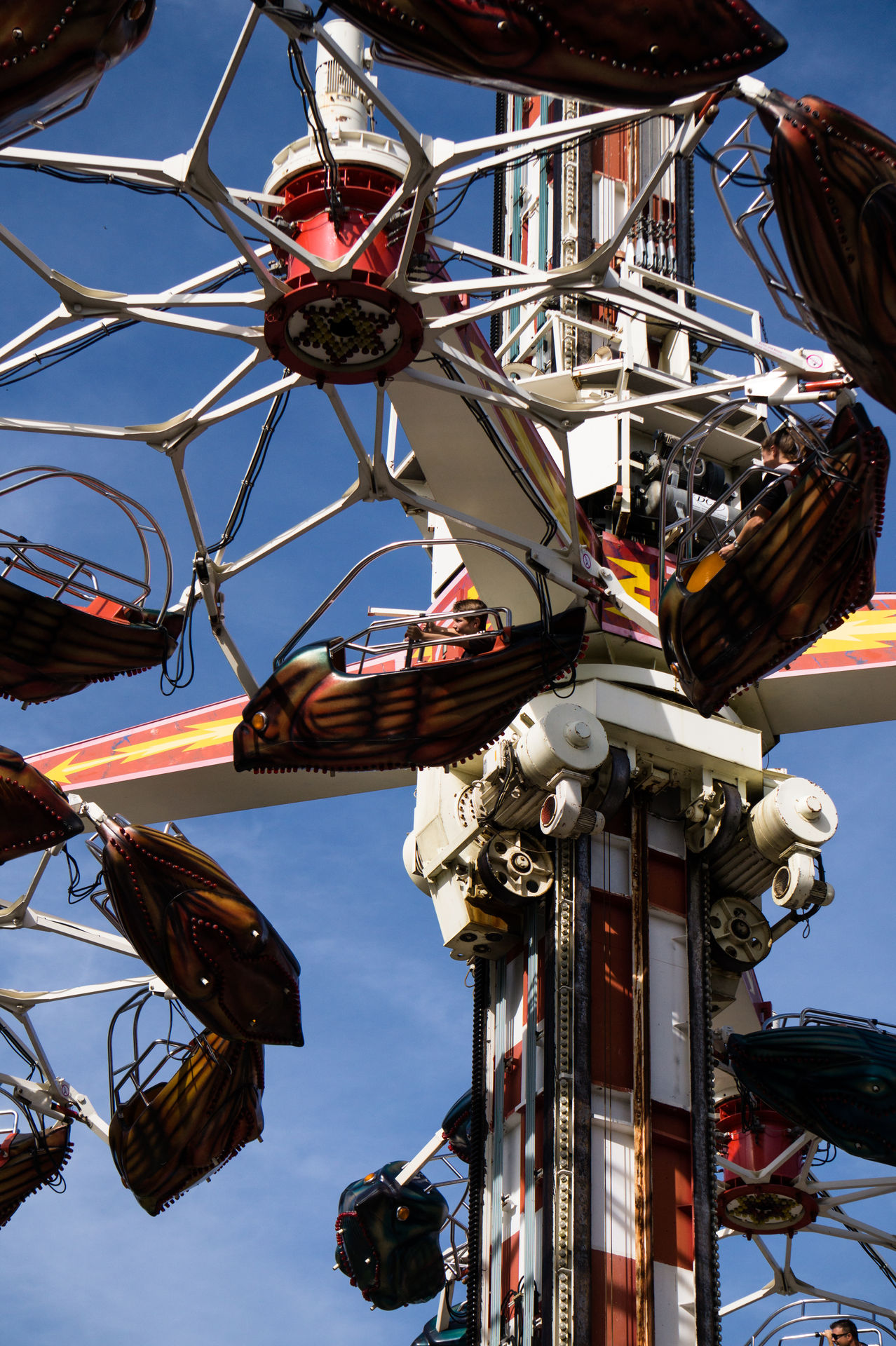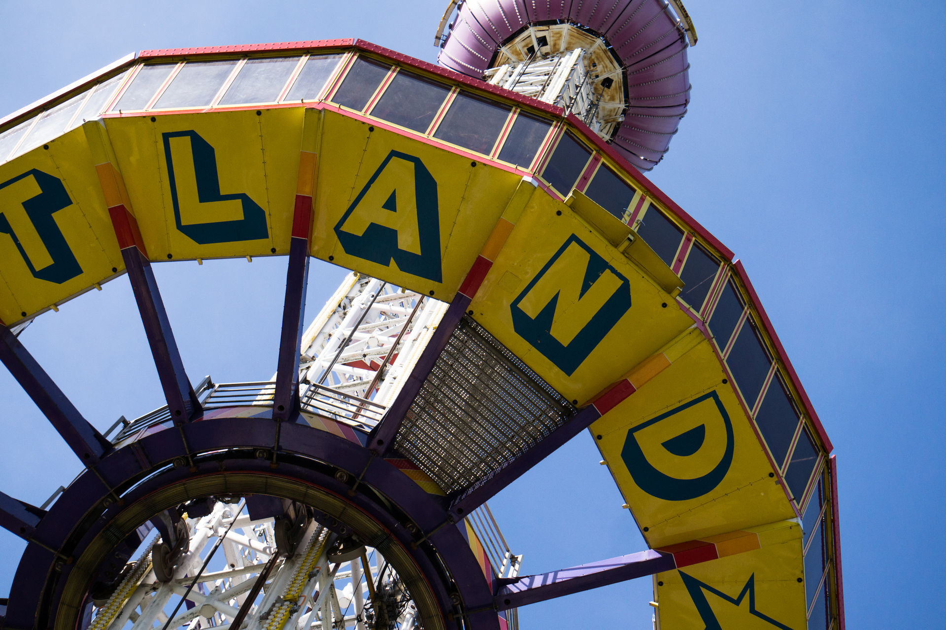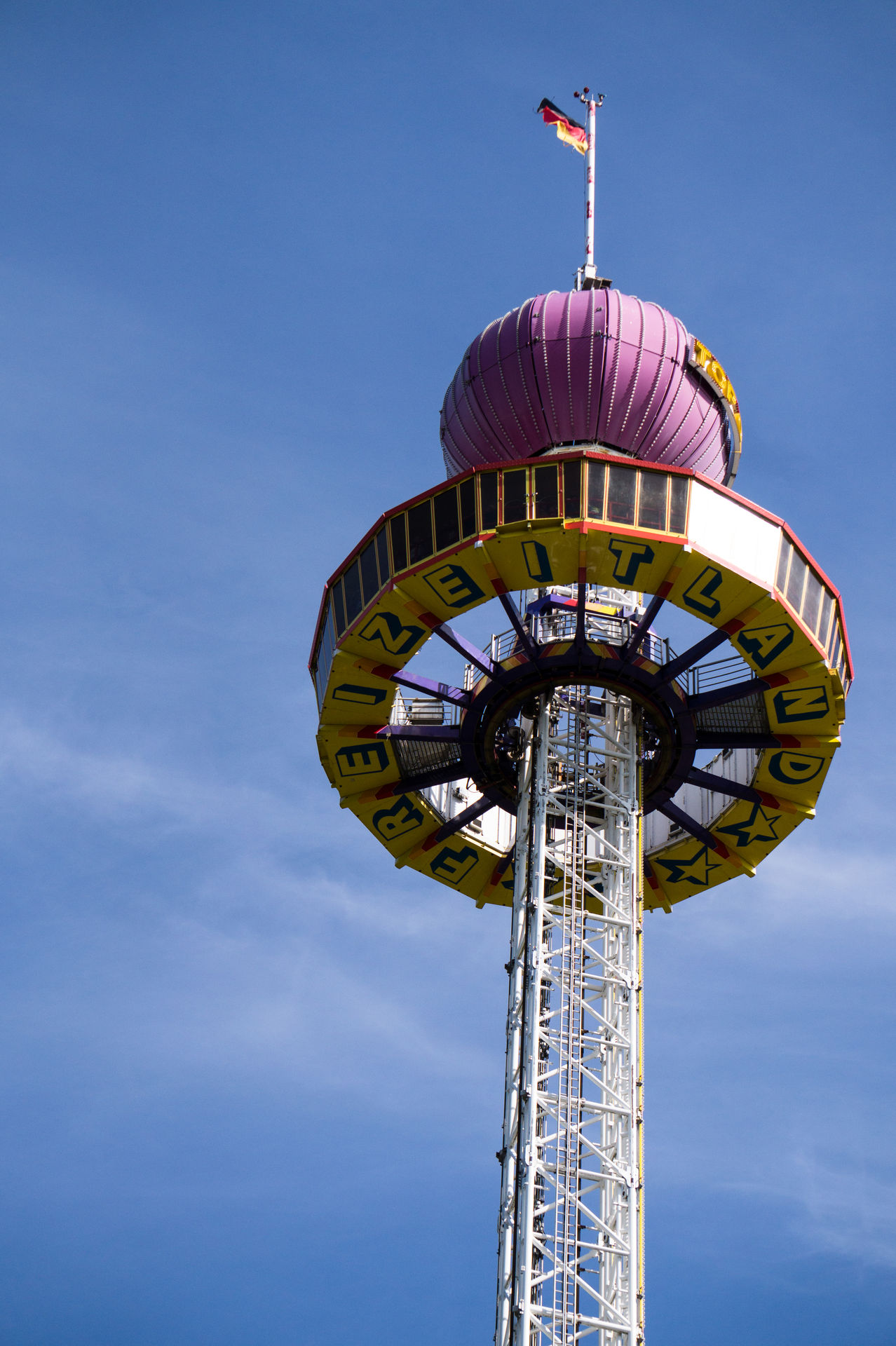 Aus technischer Sicht ähnlich interessant, aber in deutlich größeren Dimensionen, ist der Aussichtsturm Top of the world, welcher sich kurz und knapp als 132 Personen fassendes Monstrum beschreiben lässt. Das ehemals größte transportable Fahrgeschäft der Welt misst insgesamt eine Höhe von 95 m, wobei eine Fahrhöhe von 72 m erreicht wird. Erbaut wurde die Anlage Mitte der 90er Jahre von Nauta Bussink für den Bremer Schausteller Finnendahl, welcher die 270 t schwere Konstruktion bis zum Jahr 1998 betrieb. Dabei ist das Hochfahrgeschäft, im Vergleich zu den modernen Freifalltürmen des Herstellers Funtime, sehr massiv, was bereits an den vier Auslegern auffällt. Der Turm selbst ist relativ breit ausgelegt, was den Transport sicherlich nicht gerade einfach gemacht hatte. Die Antriebstechnik der Gondel hingegen ist sehr einfach und erfolgt über zwei Stahlseile die auf- bzw. abgerollt werden und somit das Gegengewicht heben bzw. senken und dadurch die Position der Gondel beeinflussen. Nachdem die Gondel ein wenig angehoben wurde wird über eine Stromschiene die Versorgung der Motoren für die Drehbewegung der Gondel sichergestellt. Die Fahrt selbst ist in beiden Bewegungen jedoch relativ langsam und bietet somit einen guten Blick auf den Freizeitpark. Dabei ist auch die klimatisierte Gondel eine Besonderheit ohne Gleichen, denn die meisten Plätze sind als Stehplätze konzipiert und in zwei Reihen ausgeführt. Die Sicht aus den Fenstern ist dabei überraschend klar, denn es fehlen jegliche Kratz- und andere Verschleißspuren.