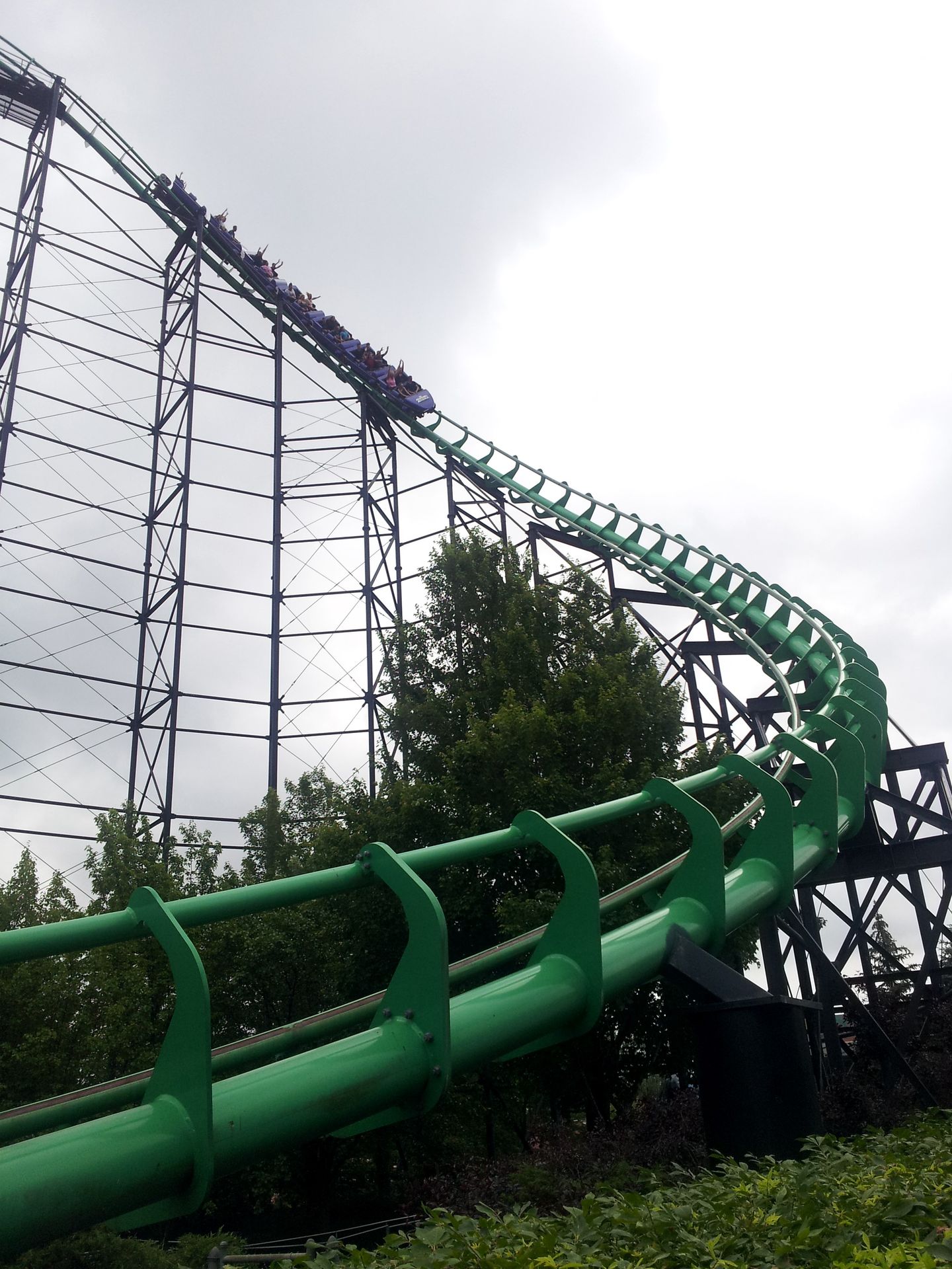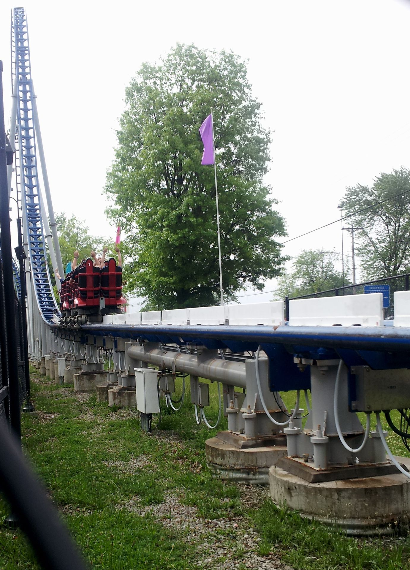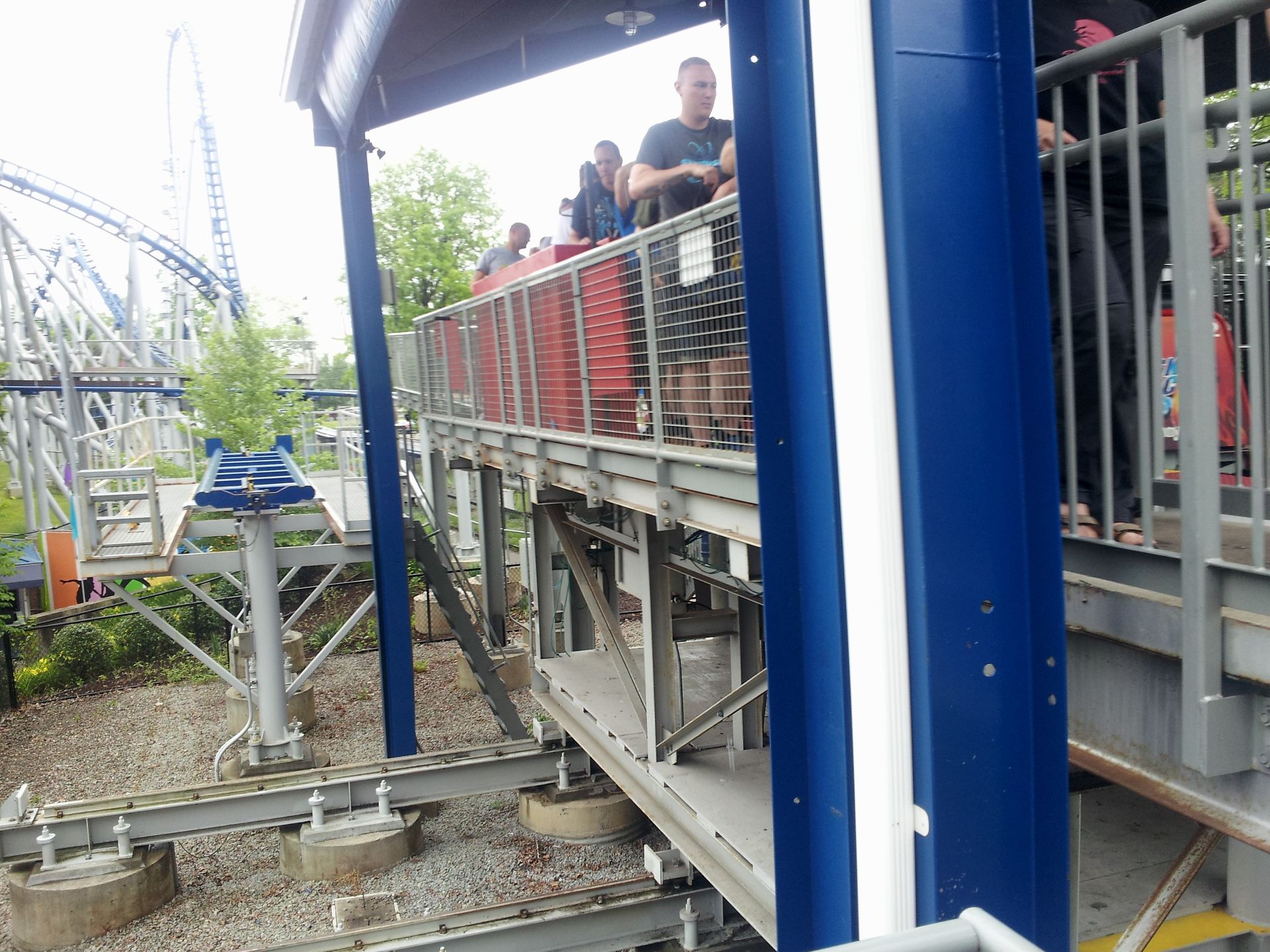 Leider gab es wohl etwas später Probleme mit dem ersten Zug, denn nachdem wir diesen auf dem Lifthill hatten stehen sehen, wurde er rausgenommen. So stieg die Wartezeit am Nachmittag ziemlich stark an, weshalb wir auf eine Wiederholungsfahrt leider verzichteten.